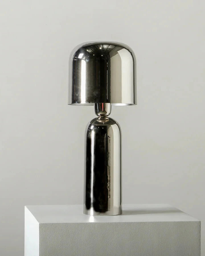 Drawing from mid-century design influences but with a fresh modern twist, this lamp pairs elegant simplicity with everyday functionality.  Crafted in iron with a sleek chrome or burgundy finish that adds subtle shine and contemporary charm.