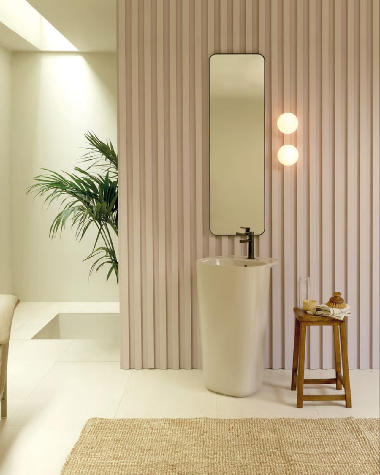 Modern interior with a floor lamp, side table, and armchair against a wooden wall.