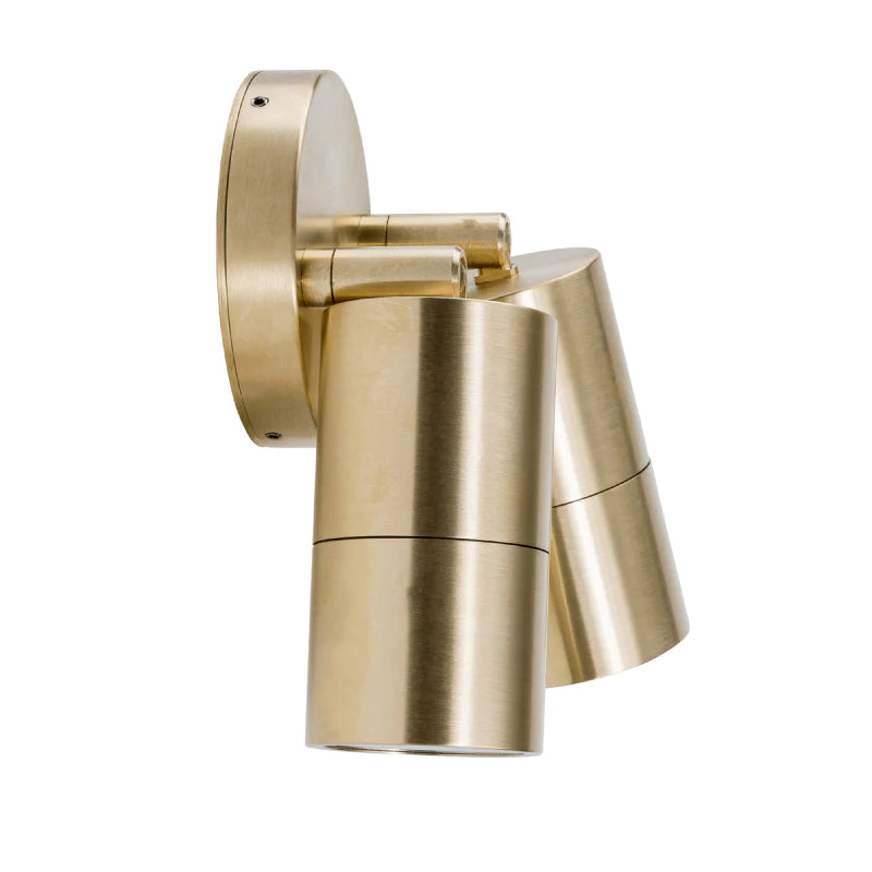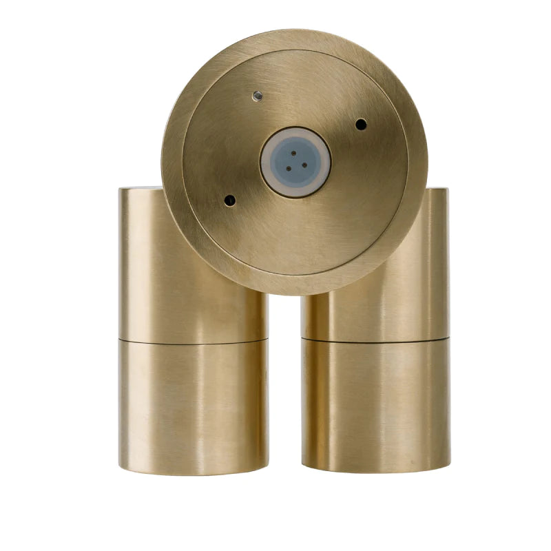 Stunning adjustable double head exterior spot light. This adjustable spotlight is highly durable, with an IP rating of IP65, it is perfect for withstanding harsher climates. The sleek and elegant profile allows the piece to seamlessly blend into a range of exterior environments. Made from solid brass.