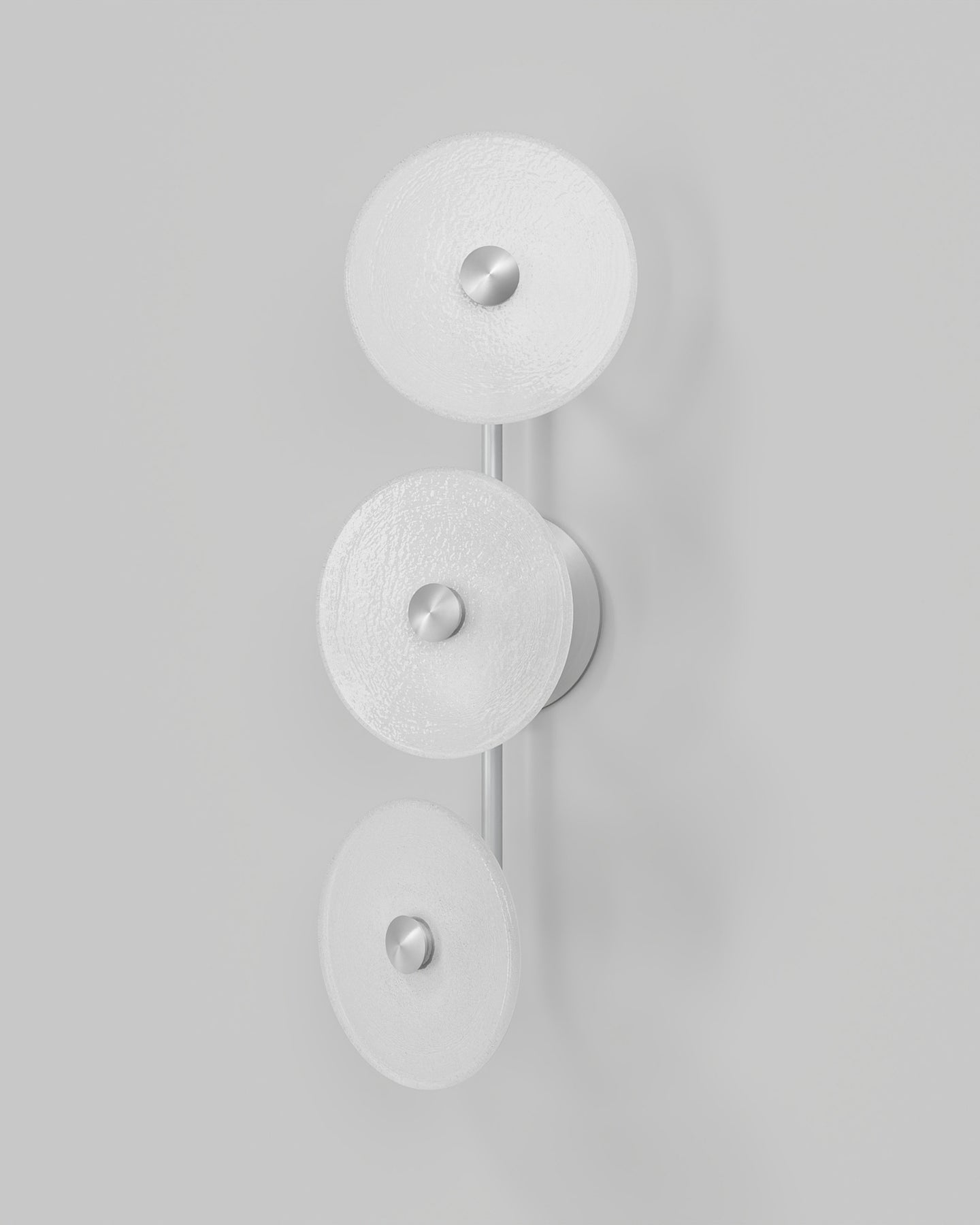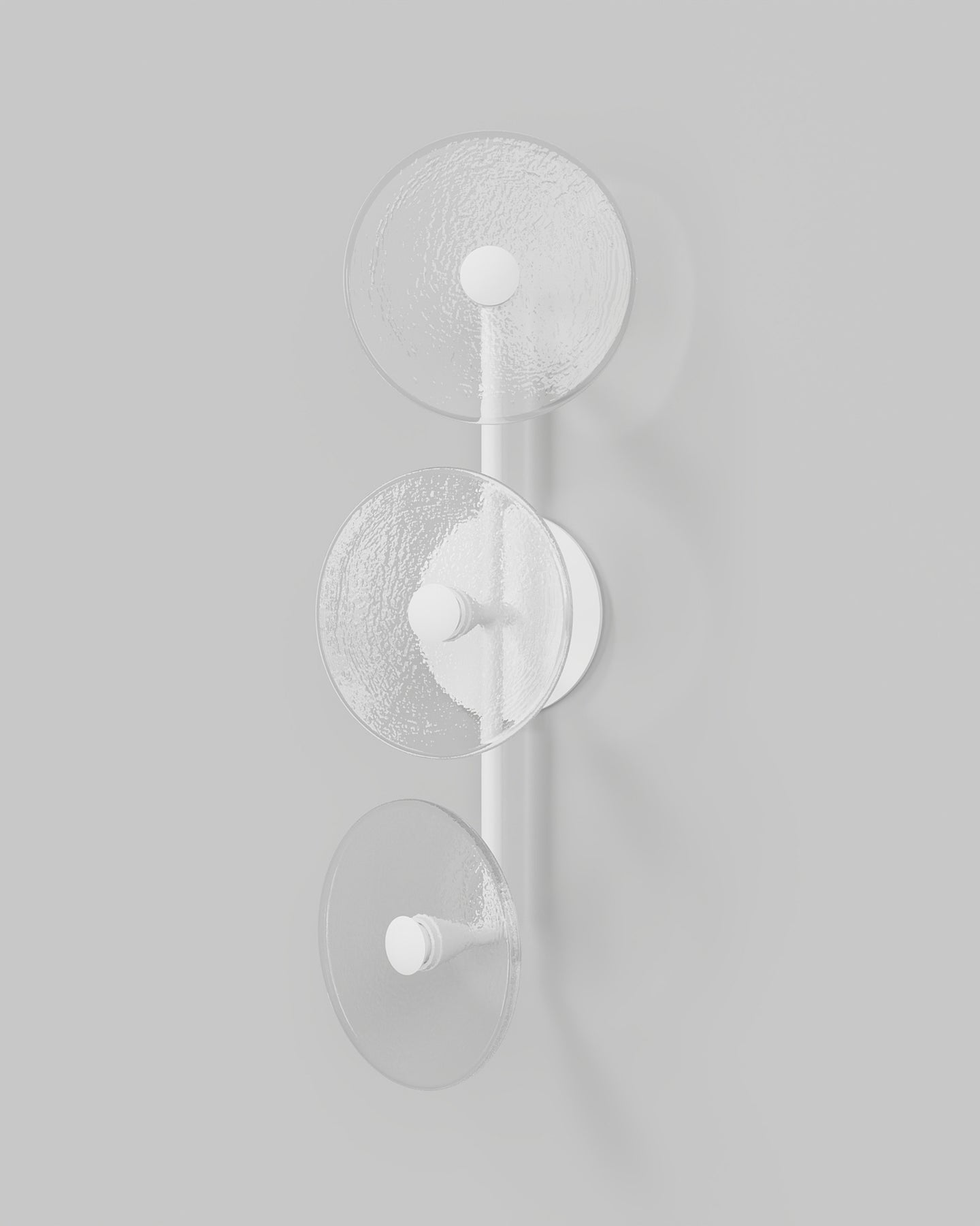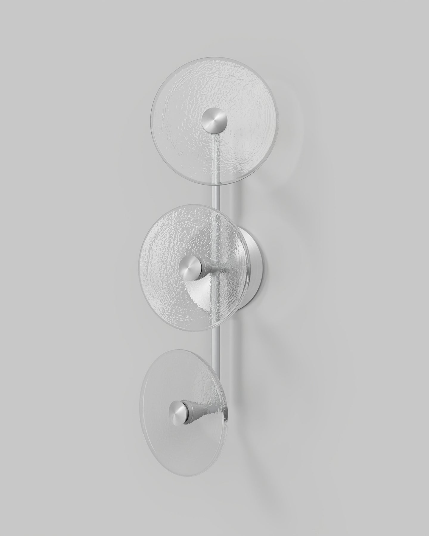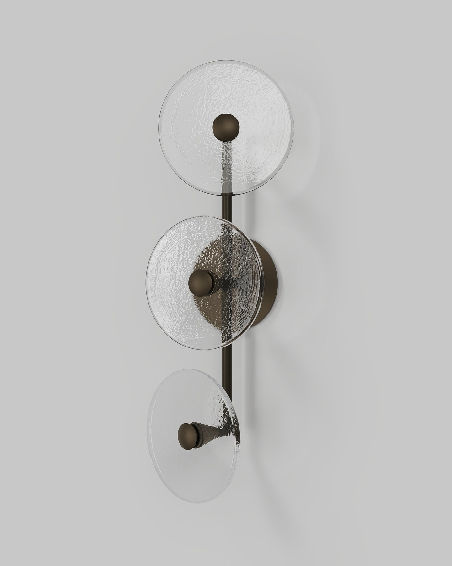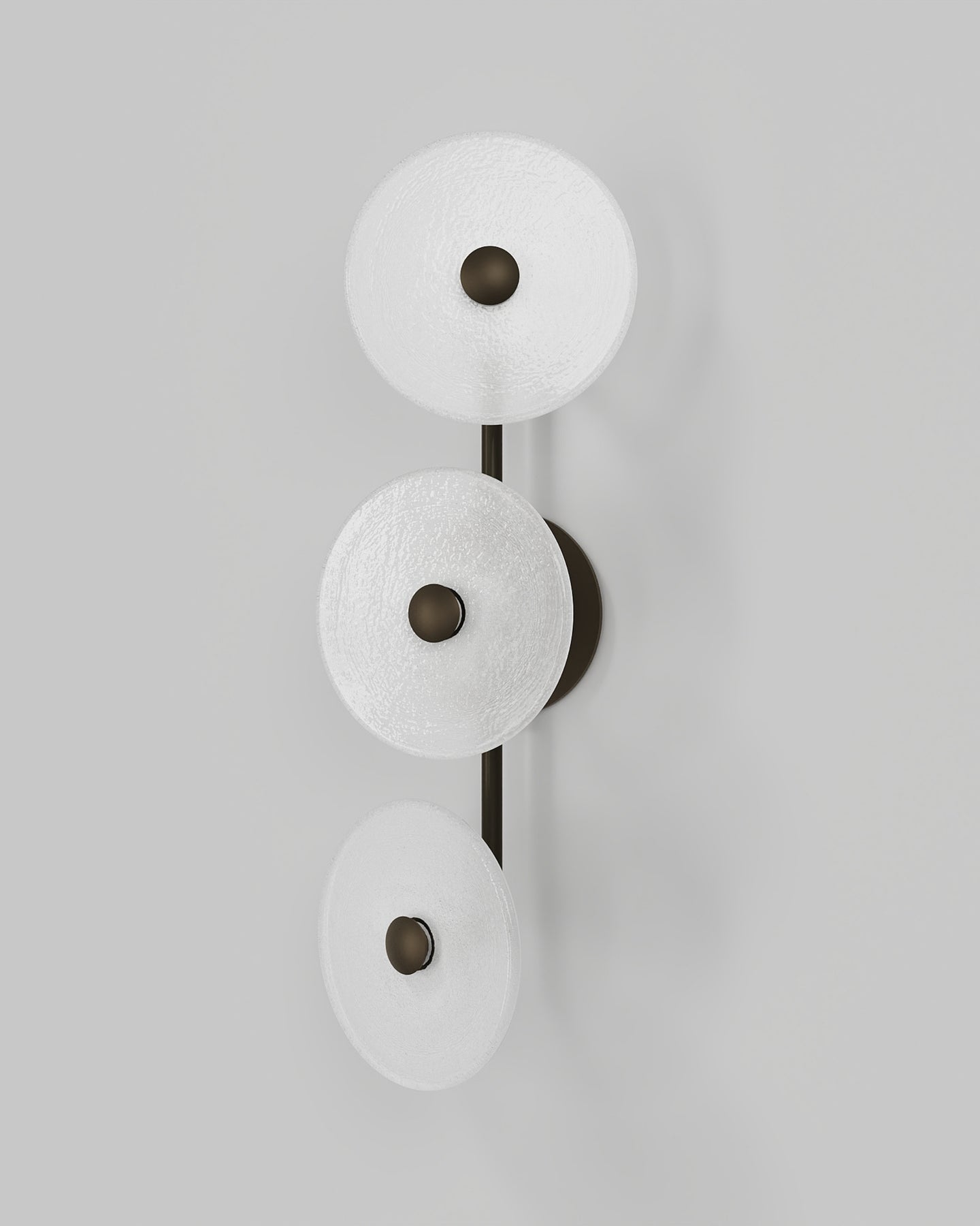 The Asymmetrical Coral Trio Rod Wall Light, designed and crafted in Currumbin, Australia, is a unique fitting made from clear or frosted glass discs. Mounted on a sleek rod, this fitting is a focal piece, as well as a lighting source. Available in Brass, Matte Black, Matte White, Medium Bronze and Steel, this fitting is suitable for a variety of contemporary interiors.