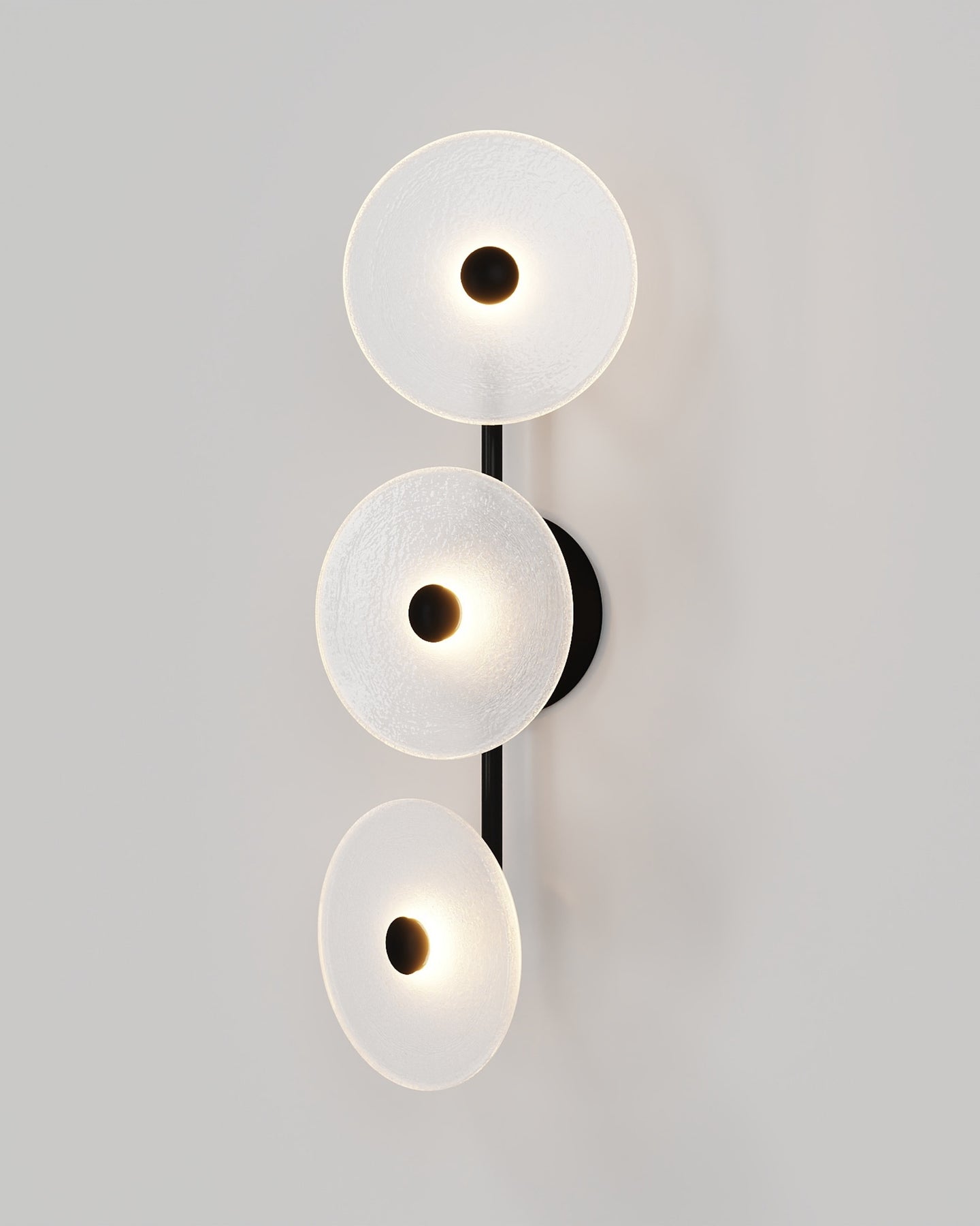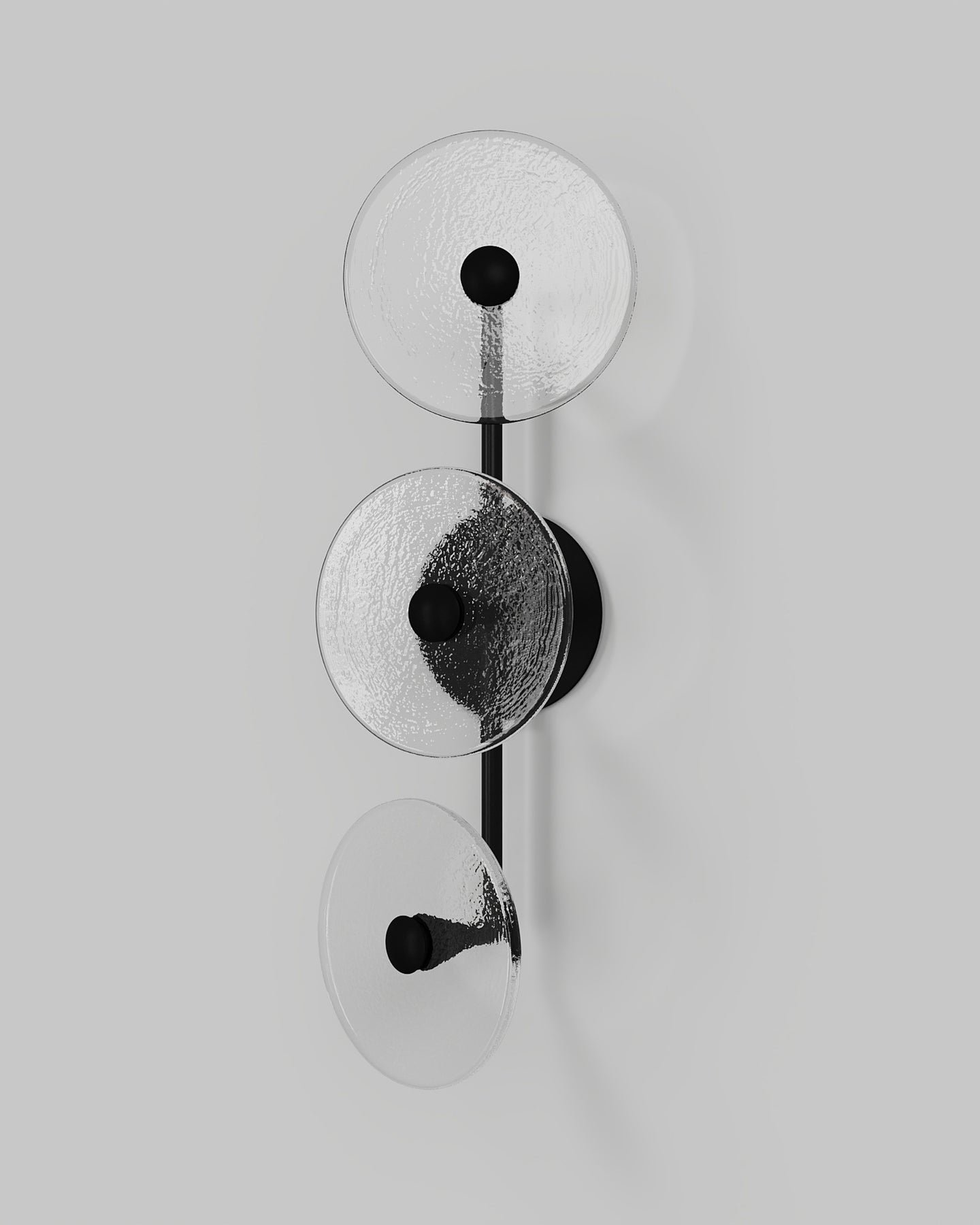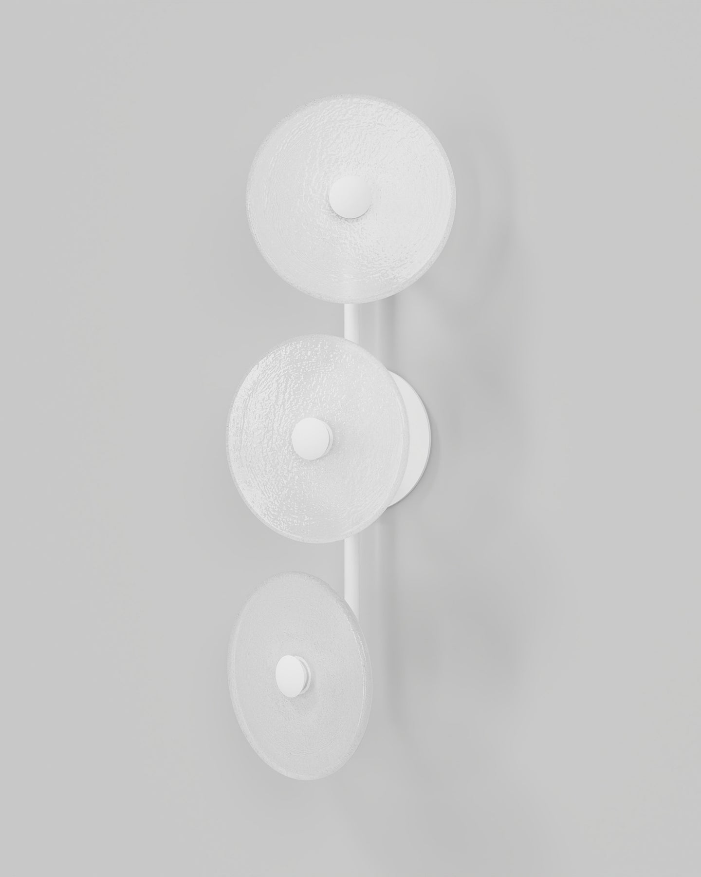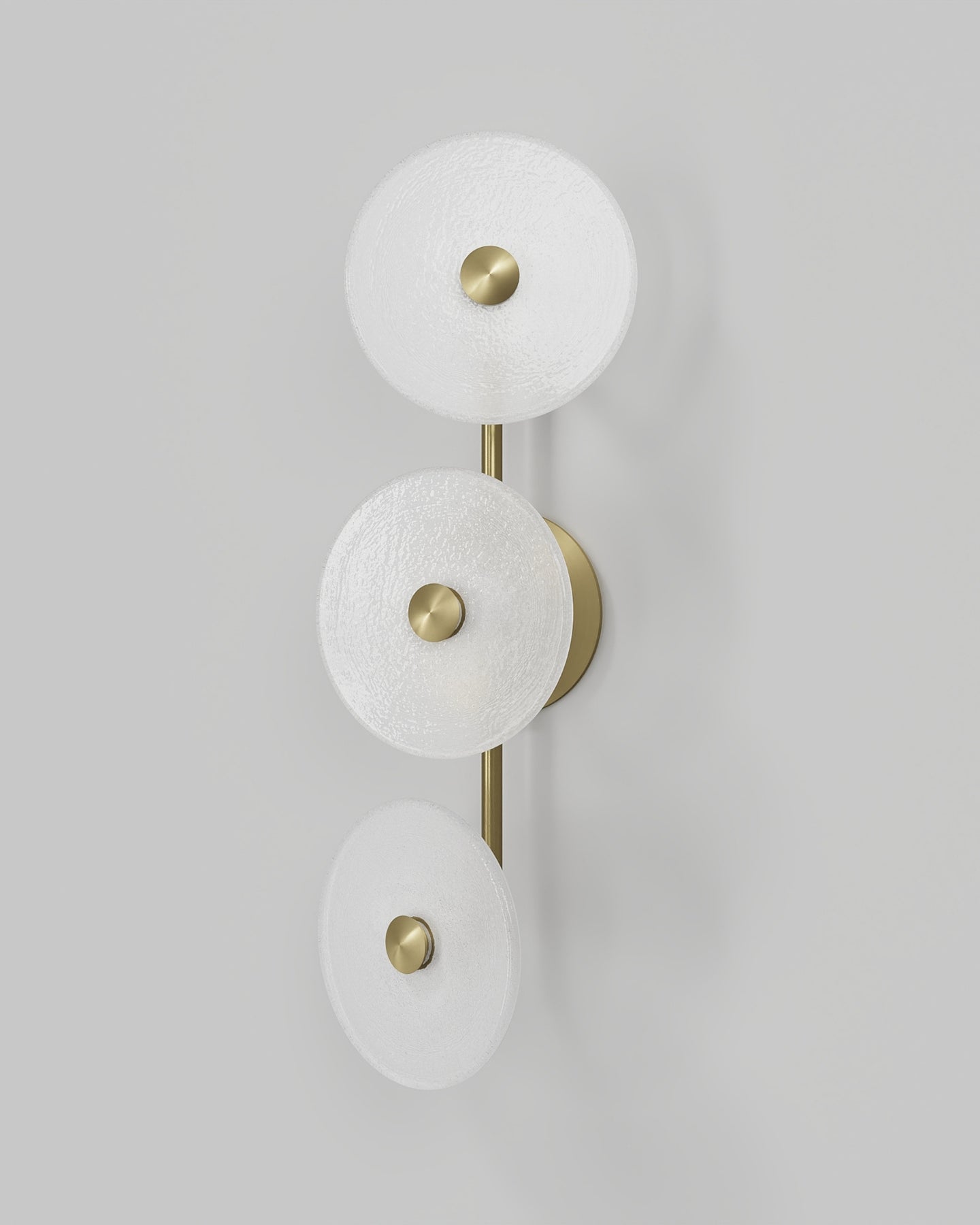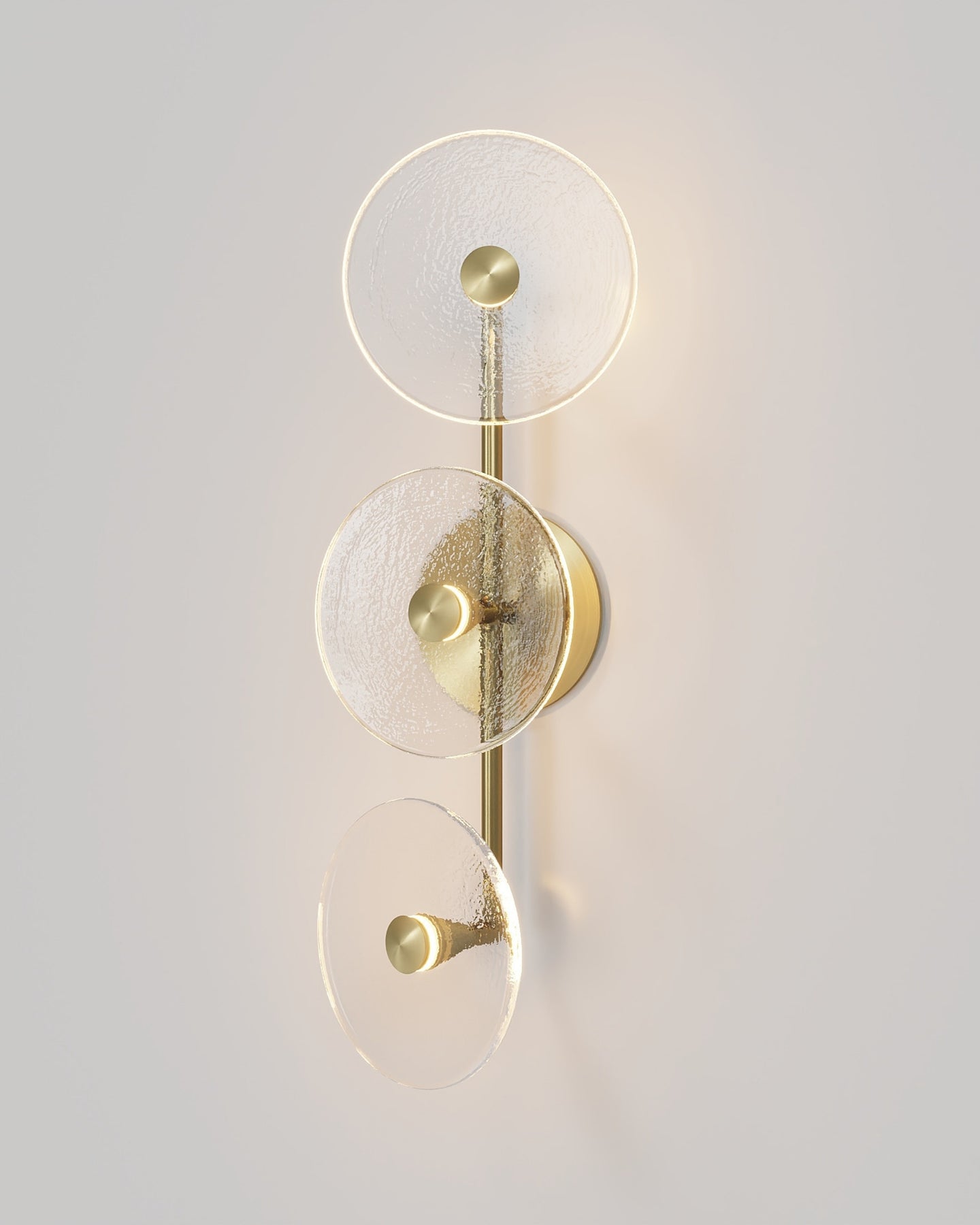 The Asymmetrical Coral Trio Rod Wall Light, designed and crafted in Currumbin, Australia, is a unique fitting made from clear or frosted glass discs. Mounted on a sleek rod, this fitting is a focal piece, as well as a lighting source. Available in Brass, Matte Black, Matte White, Medium Bronze and Steel, this fitting is suitable for a variety of contemporary interiors.