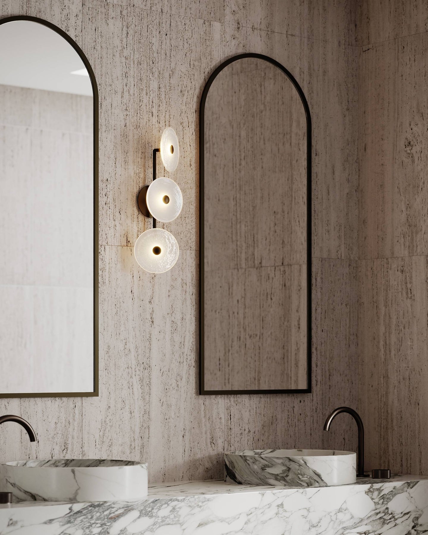 Bathroom with two arched mirrors, a wall sconce, and a marble countertop.
