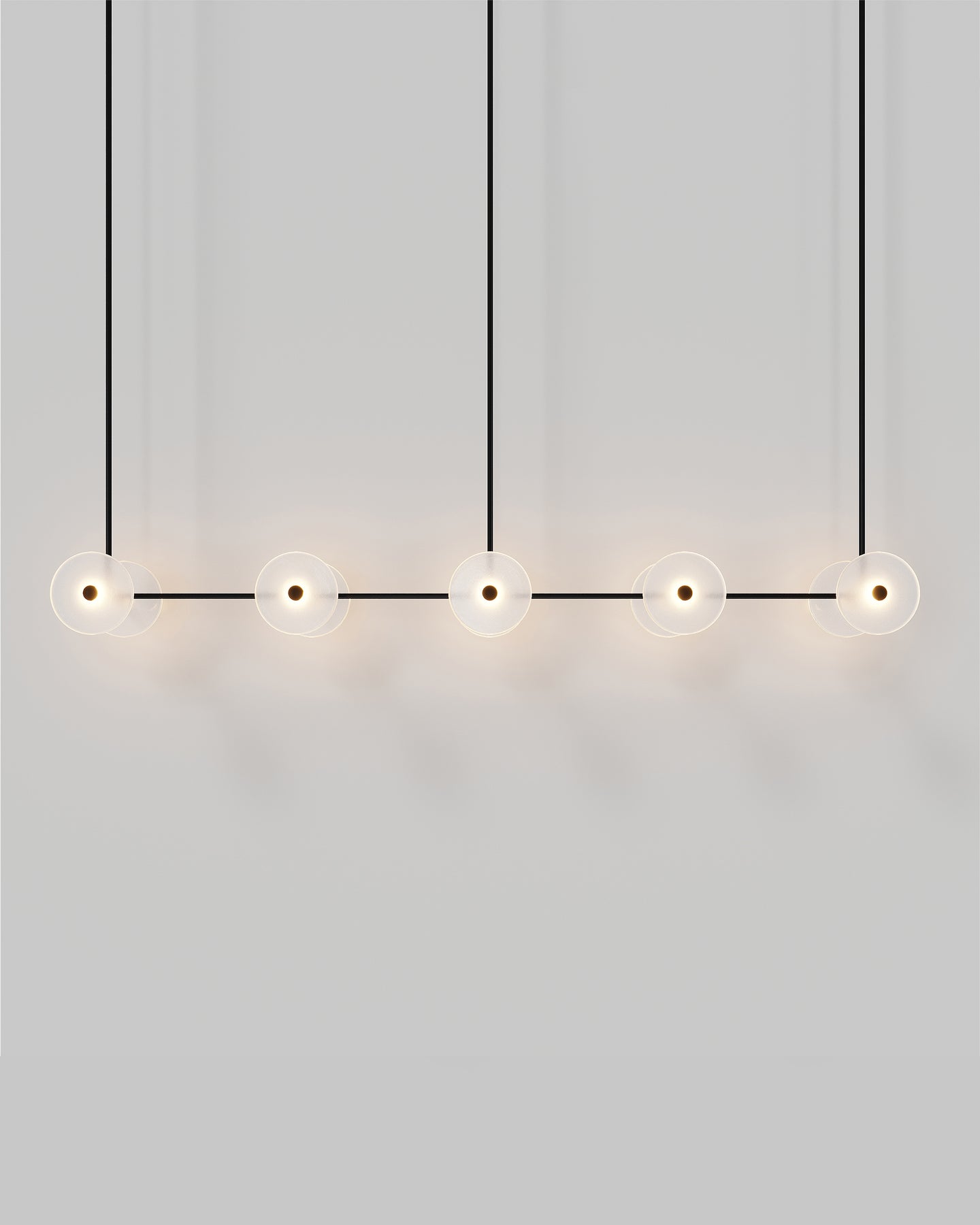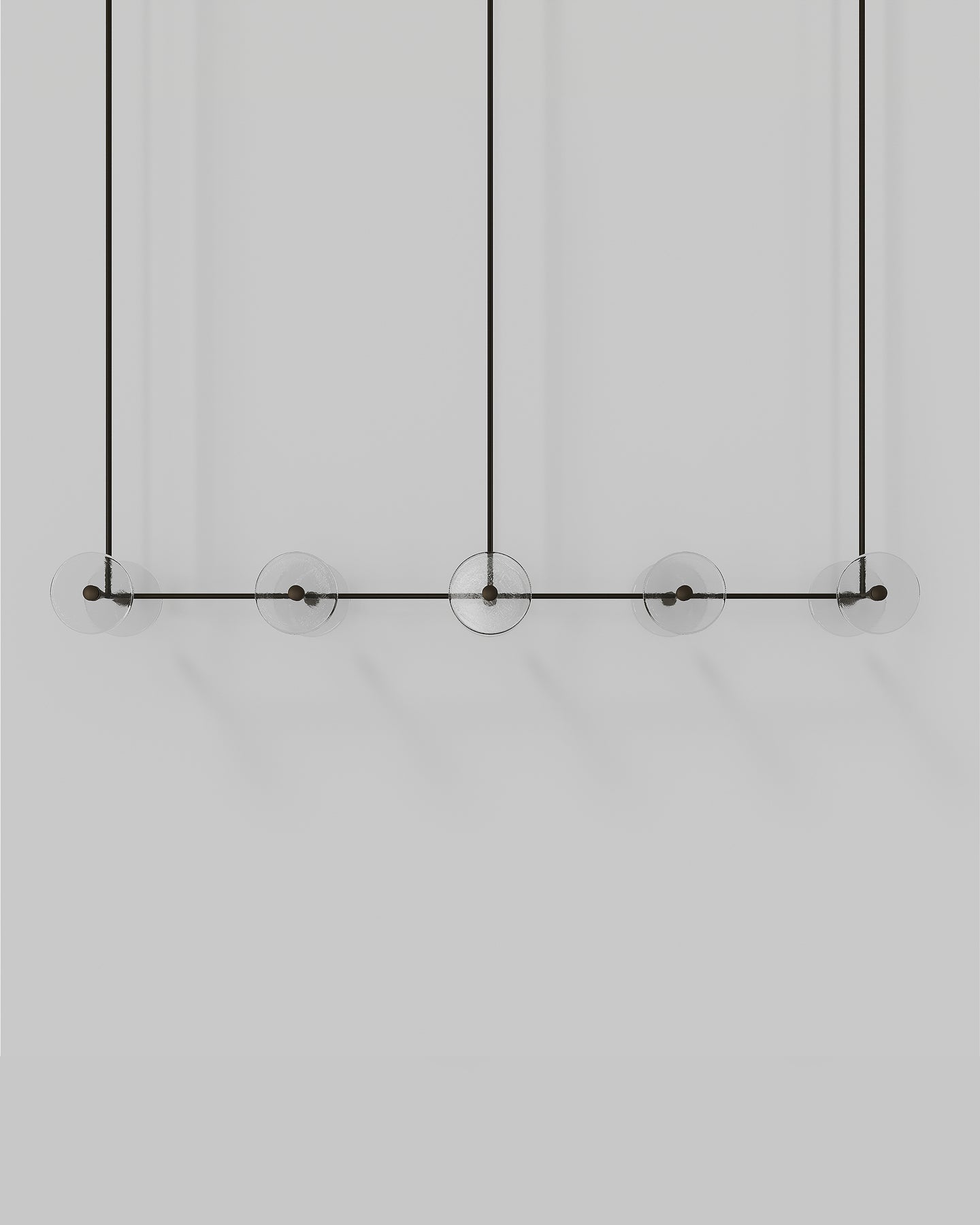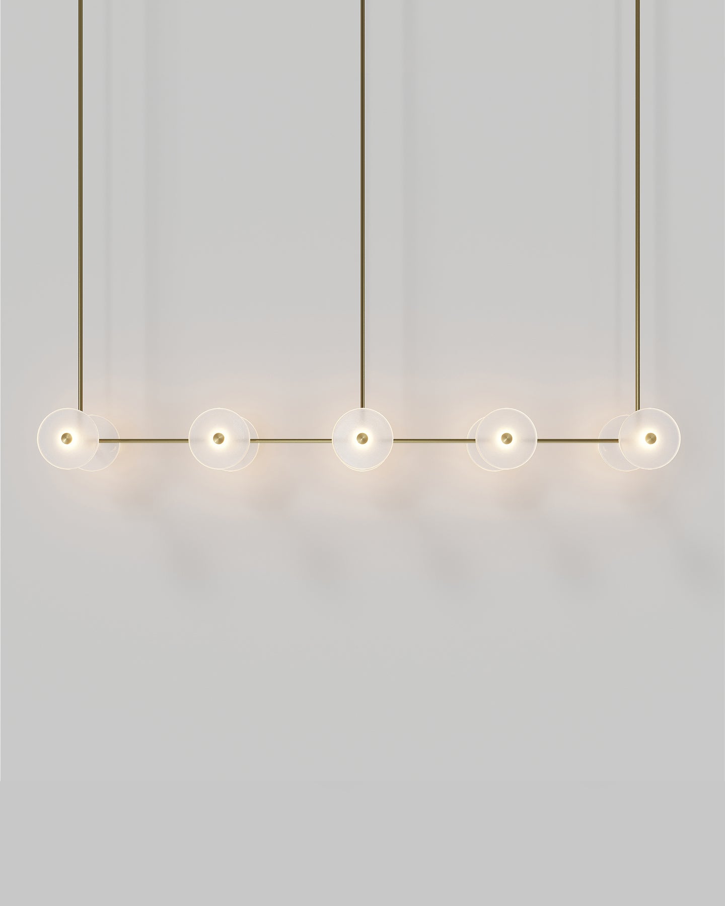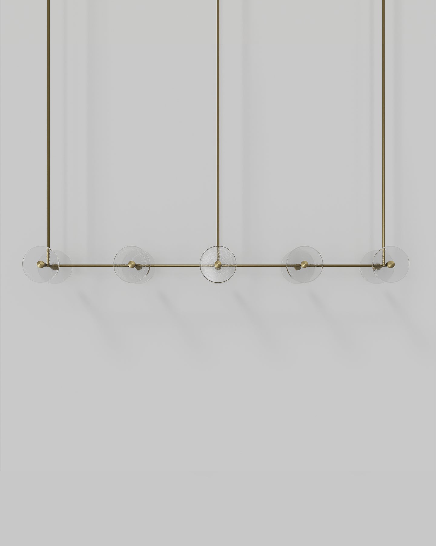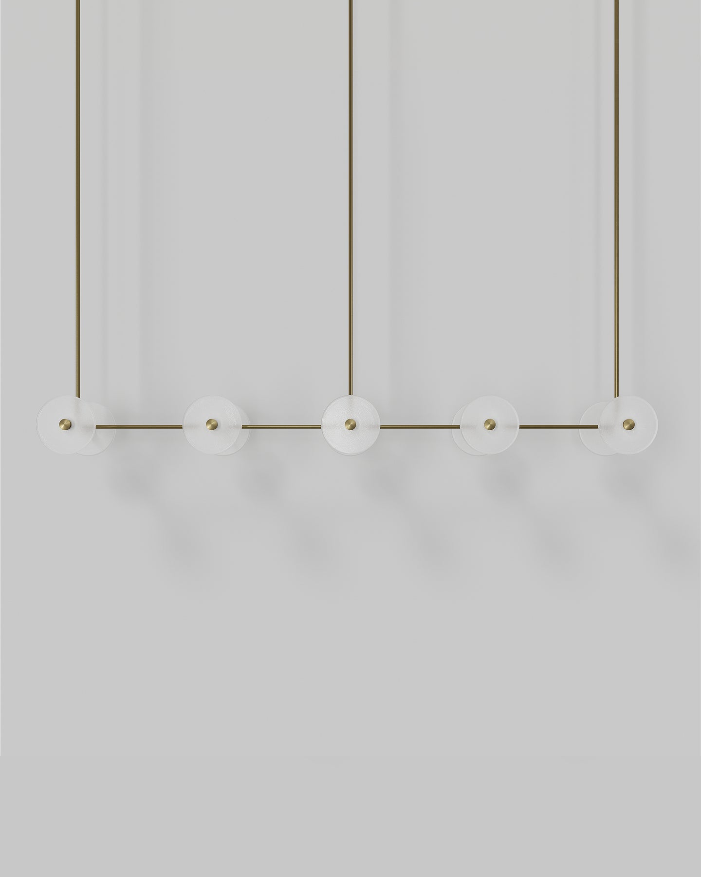 Handmade individually in Currumbin, Australia, this modern centrepiece is a perfect combination of geometry and elegance. Suspended over a kitchen island, a dining table or elevating an office space, this linear pendant features ten unique frosted or clear glass-blown discs suspended on a rod that is available in different finishes: brass, steel, matte black, matte white, or medium bronze powder coating. Easily blending in different interior spaces from classic to contemporary, this fixture will spread a pleasant soft light around and will radiate sophistication.