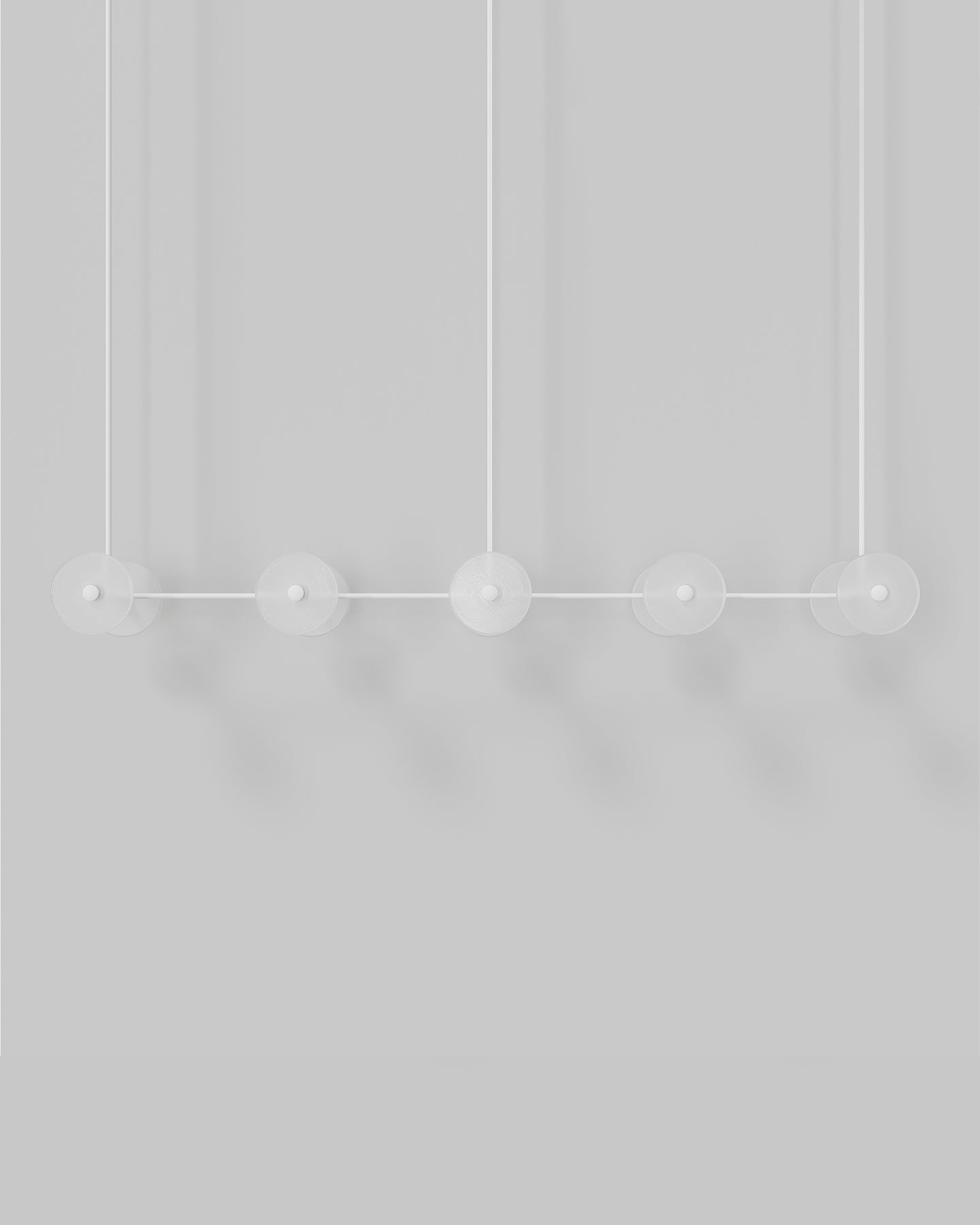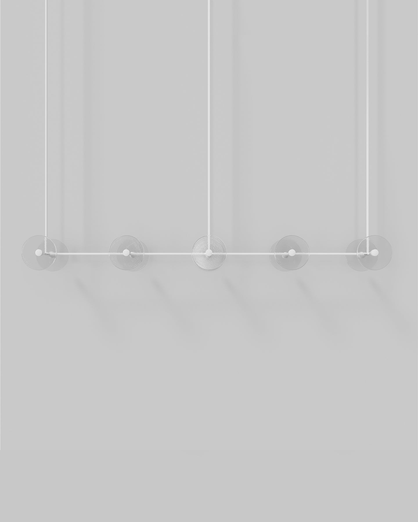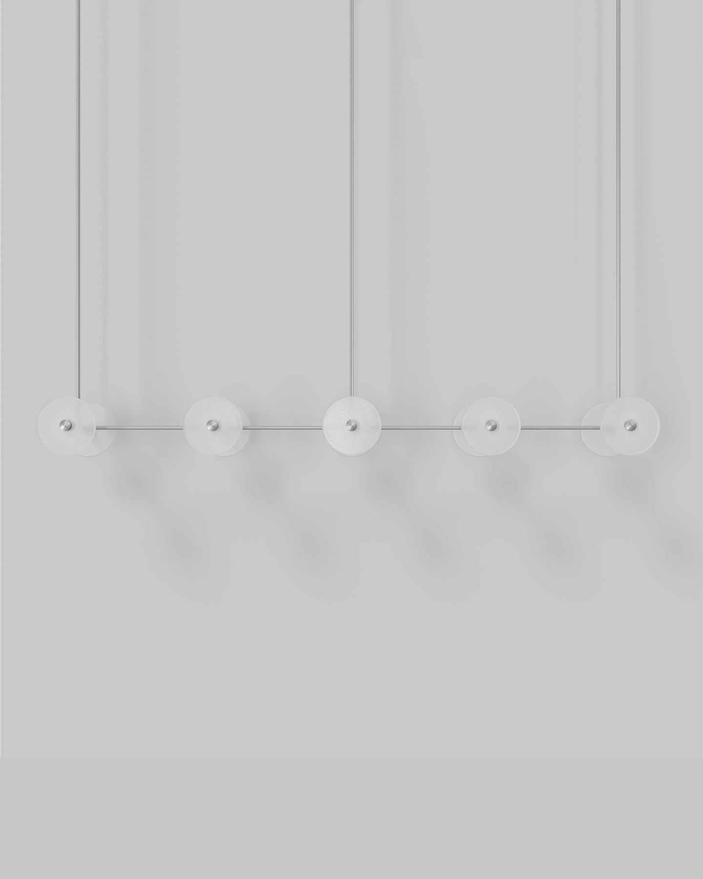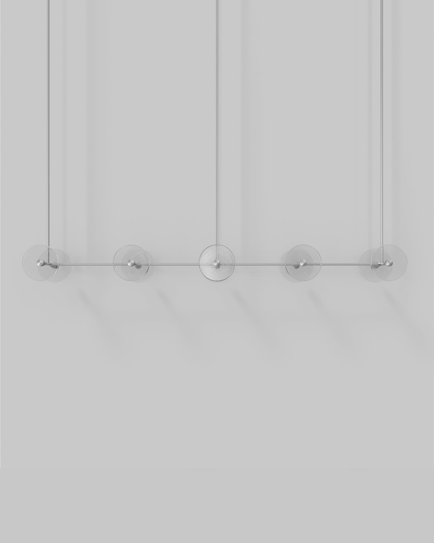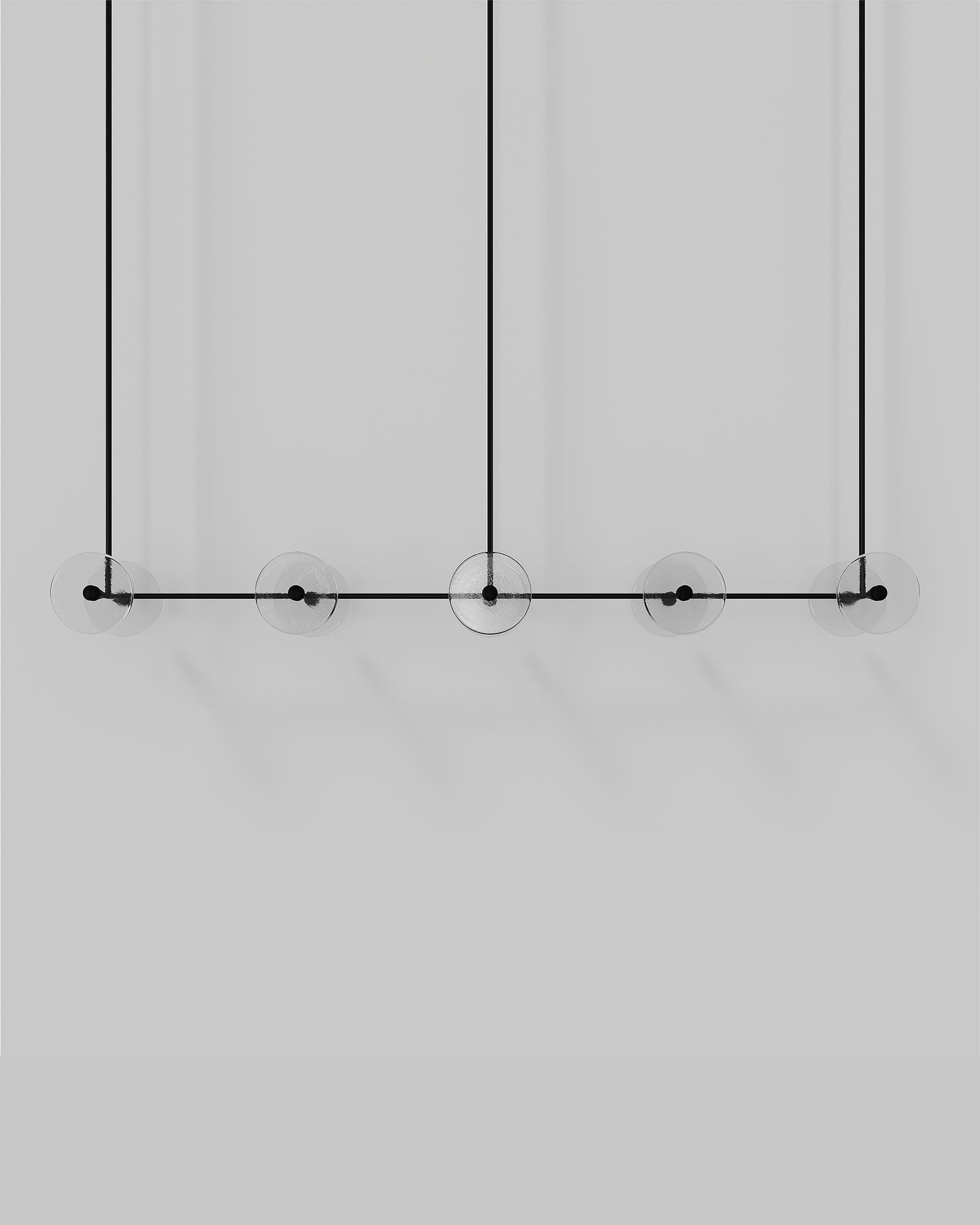 Handmade individually in Currumbin, Australia, this modern centrepiece is a perfect combination of geometry and elegance. Suspended over a kitchen island, a dining table or elevating an office space, this linear pendant features ten unique frosted or clear glass-blown discs suspended on a rod that is available in different finishes: brass, steel, matte black, matte white, or medium bronze powder coating. Easily blending in different interior spaces from classic to contemporary, this fixture will spread a pleasant soft light around and will radiate sophistication.