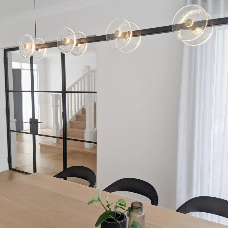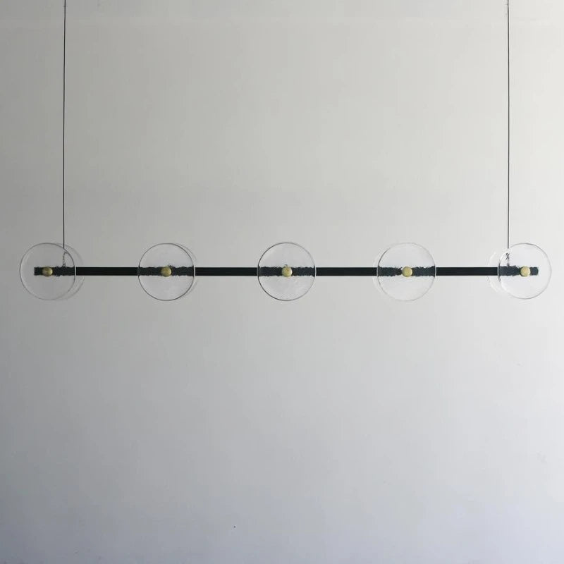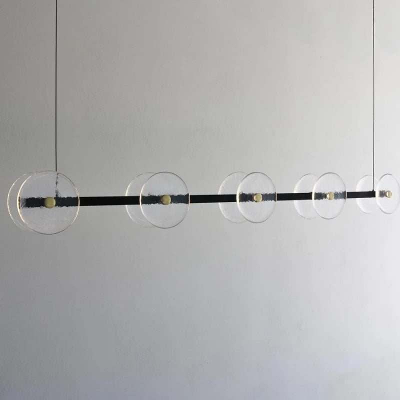 The Coral Linear Pendant boasts a distinctive and unconventional design aesthetic. It is carefully handcrafted to order in Currumbin, Australia, by Oliver Höglund and Ryan Roberts. Featuring ten transparent hand-blown glass discs suspended from a linear bar. Due to the artisanal production process, each pendant is unique and may display slight variations. Equipped with a driver and dedicated LED, this pendant is well-suited for illuminating a variety of settings, ranging from residential and commercial spaces to architectural constructions.