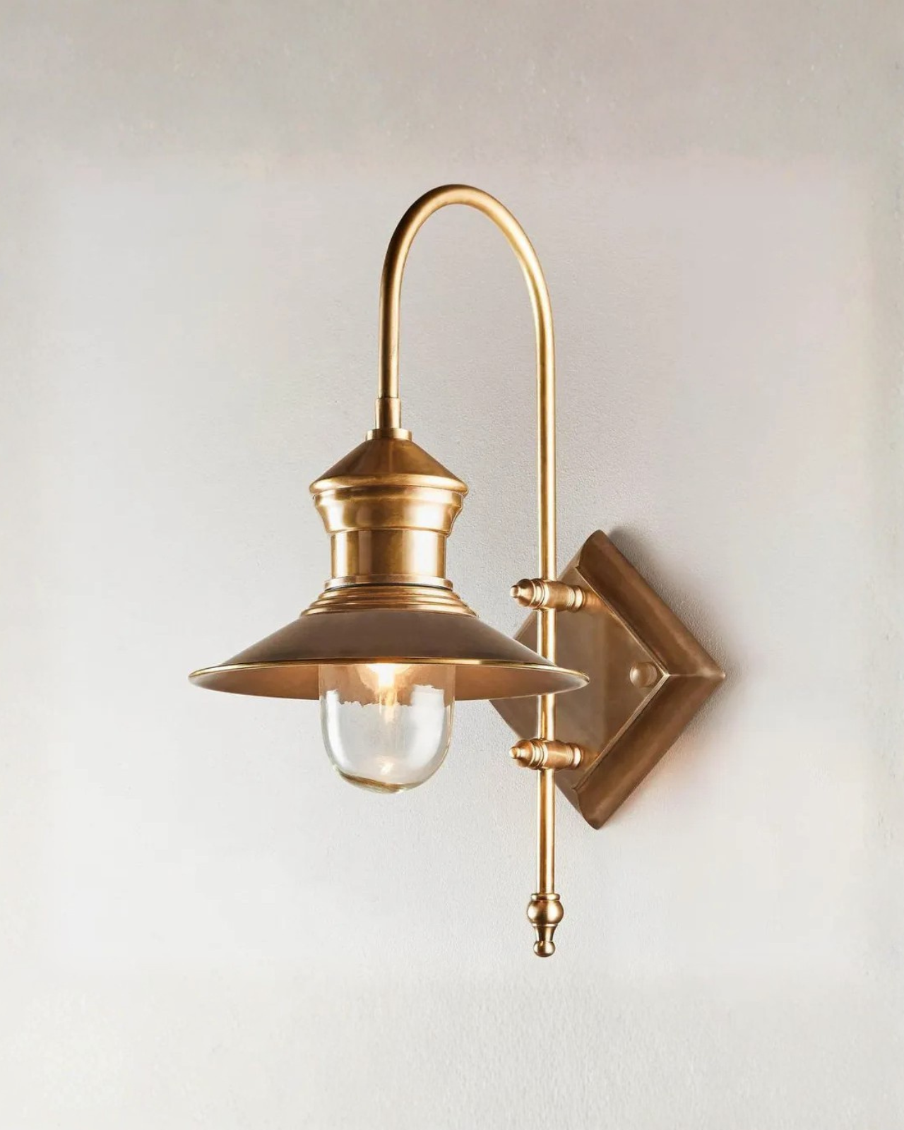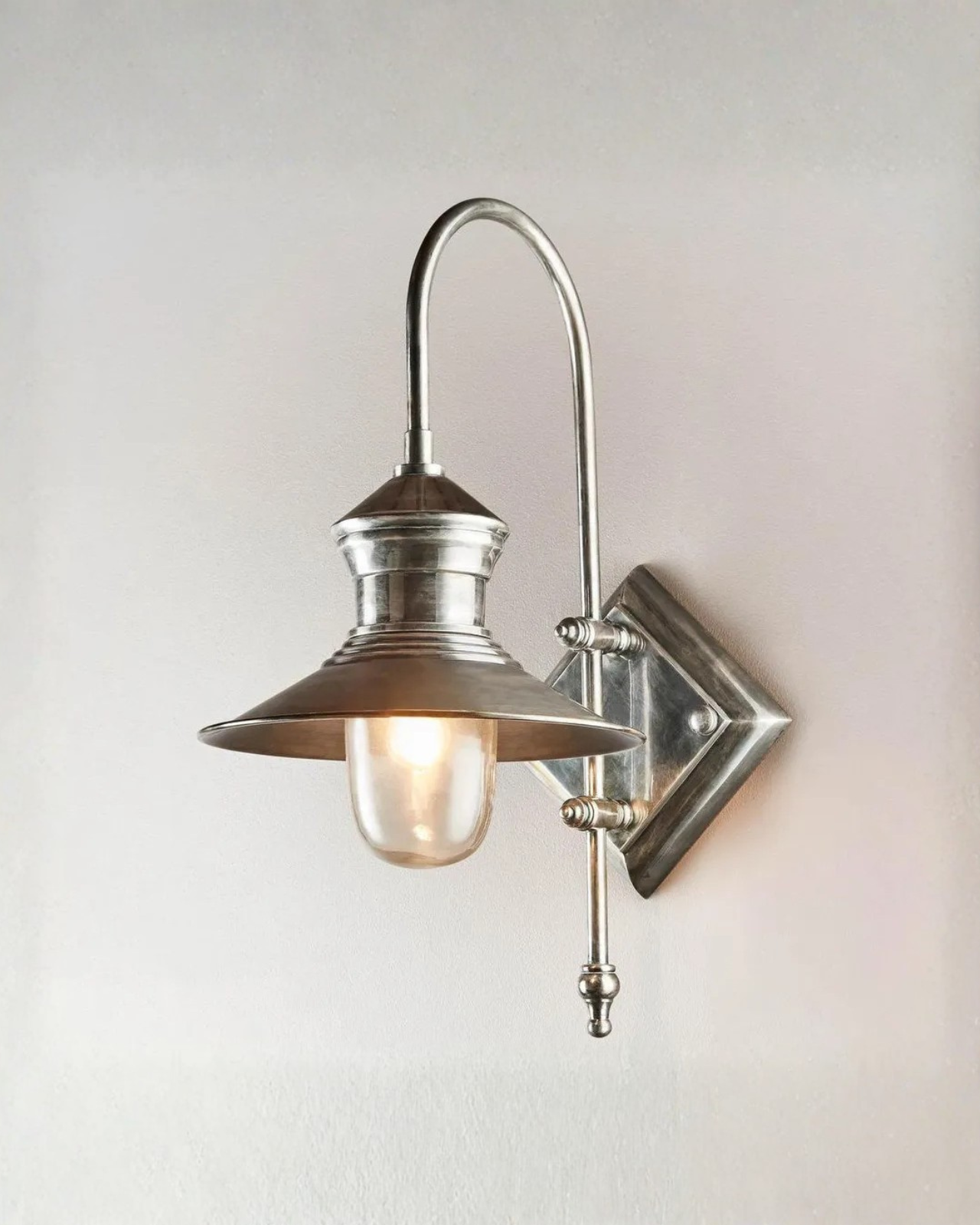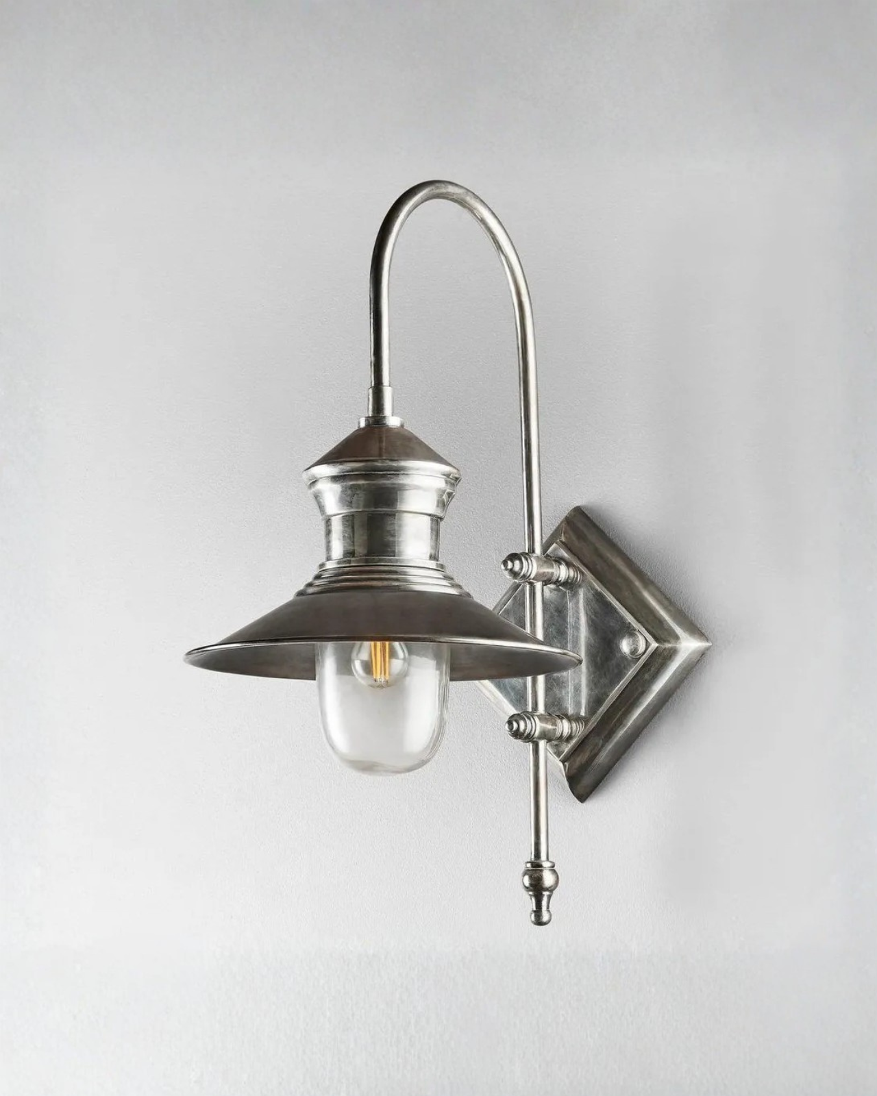 This IP54-rated wall sconce features a clear glass and metal dome shade, making it suitable for both indoor and outdoor applications. Its lantern-inspired design is ideal for gardens, patios, and entryways, while the sleek industrial form allows it to complement bathrooms or interior walls in rustic, loft, or industrial-style spaces.