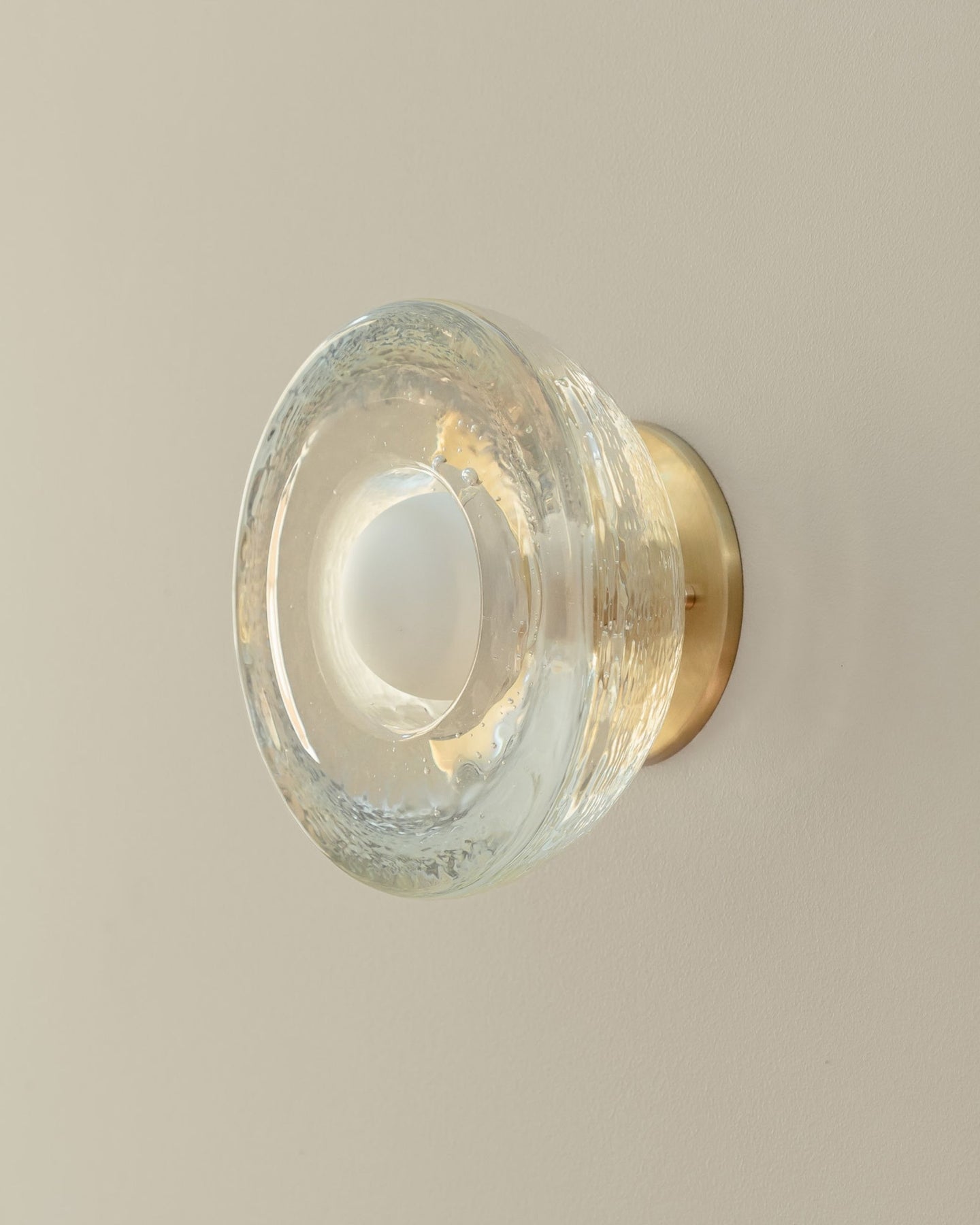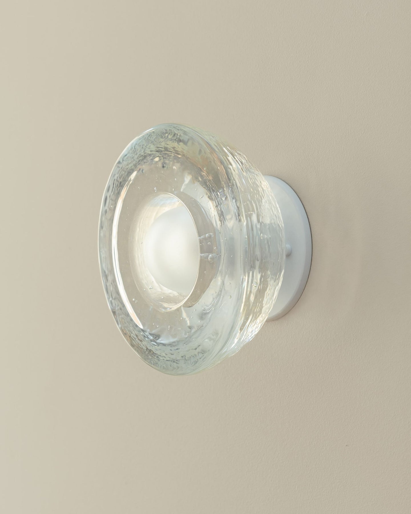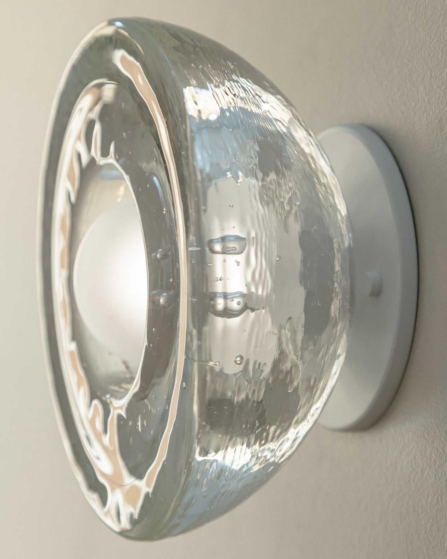 The Cast Glass Wall Sconce is designed and cast by hand in the glass studio at the distinguished Jam Factory, Adelaide. Bearing similarities to water, each fitting is hand-poured, creating unique marks and bubbles that reflect and interact with the light emitted. With an IP44 rating, install this fitting either side of a mirror in bathrooms, or as a cosy bedside light.