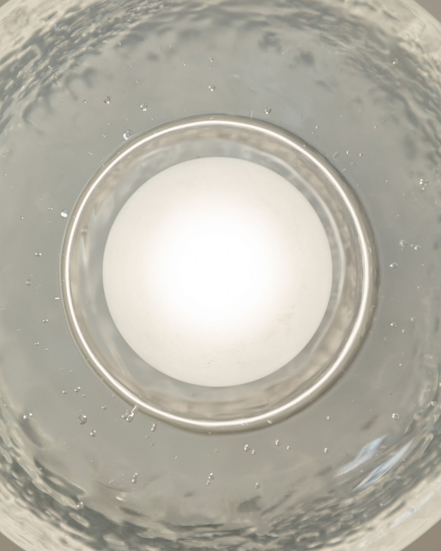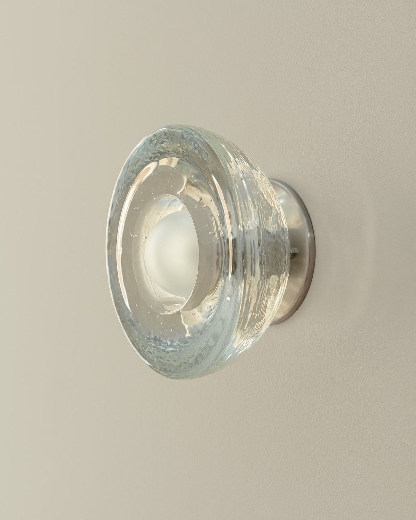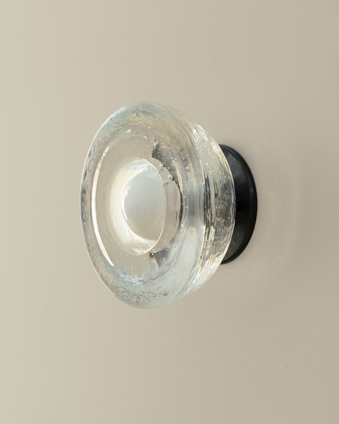 The Cast Glass Wall Sconce is designed and cast by hand in the glass studio at the distinguished Jam Factory, Adelaide. Bearing similarities to water, each fitting is hand-poured, creating unique marks and bubbles that reflect and interact with the light emitted. With an IP44 rating, install this fitting either side of a mirror in bathrooms, or as a cosy bedside light.