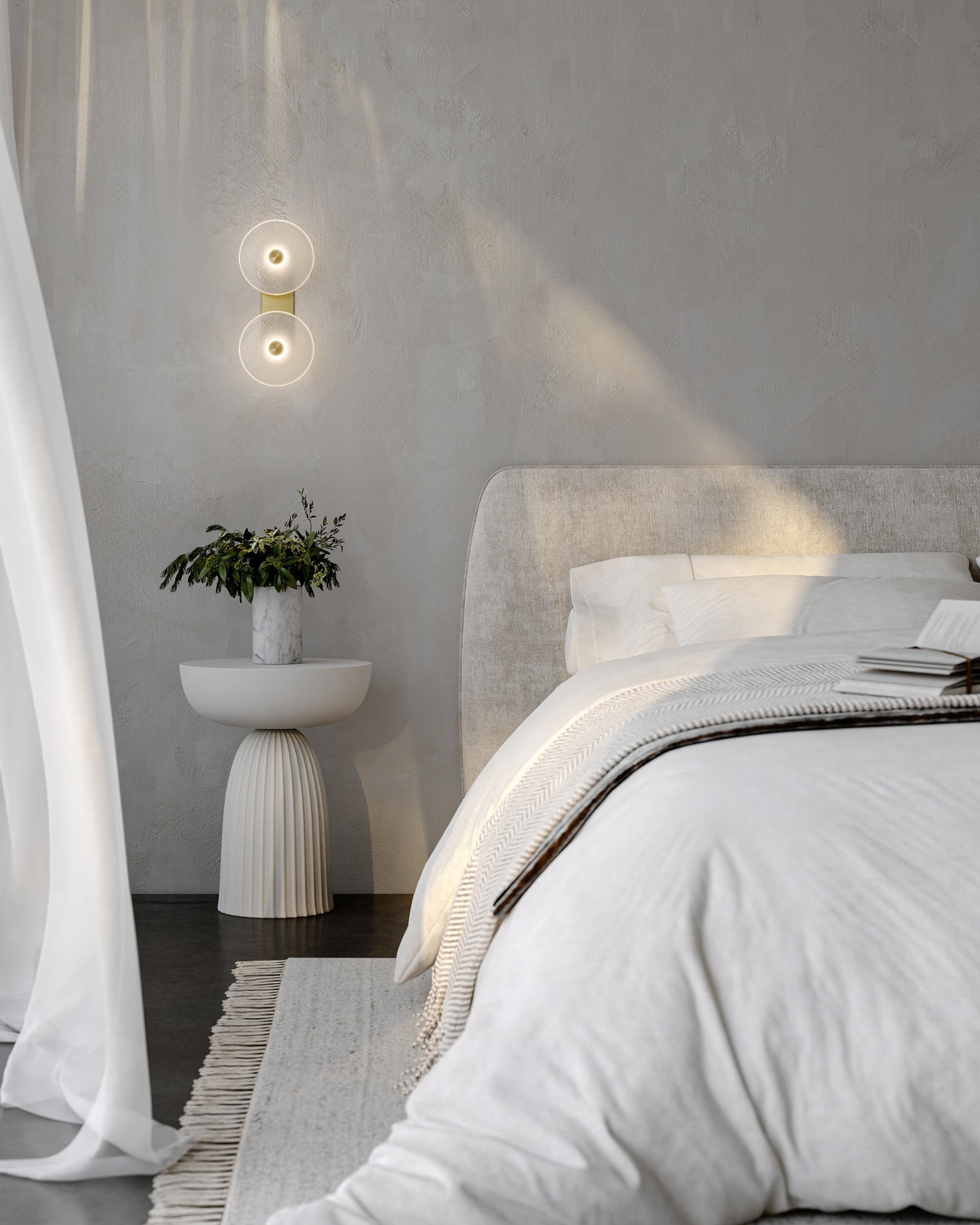 The Coral Duo Glass Wall Light is designed to add an eclectic yet minimal styled touch to any interior space. Comprised of two hand-blown frosted glass discs mounted on a choice of Matte Black, White, or Brass metal this wall light is suited for singular or grouped application. Handmade in Currumbin, Australia by Oliver Höglund and Ryan Roberts, this low-voltage design can be safely applied in bathrooms and powder rooms. The handmade process of this beautiful fitting results in subtle differences, making each wall light aesthetically unique.