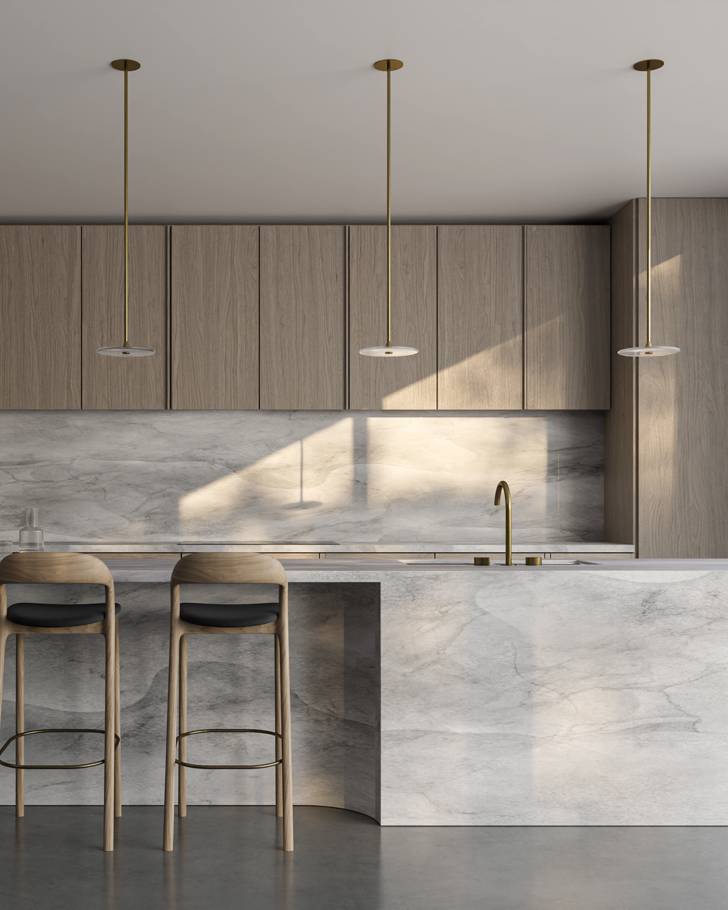 Modern kitchen with wooden cabinets, marble countertop, and pendant lights.