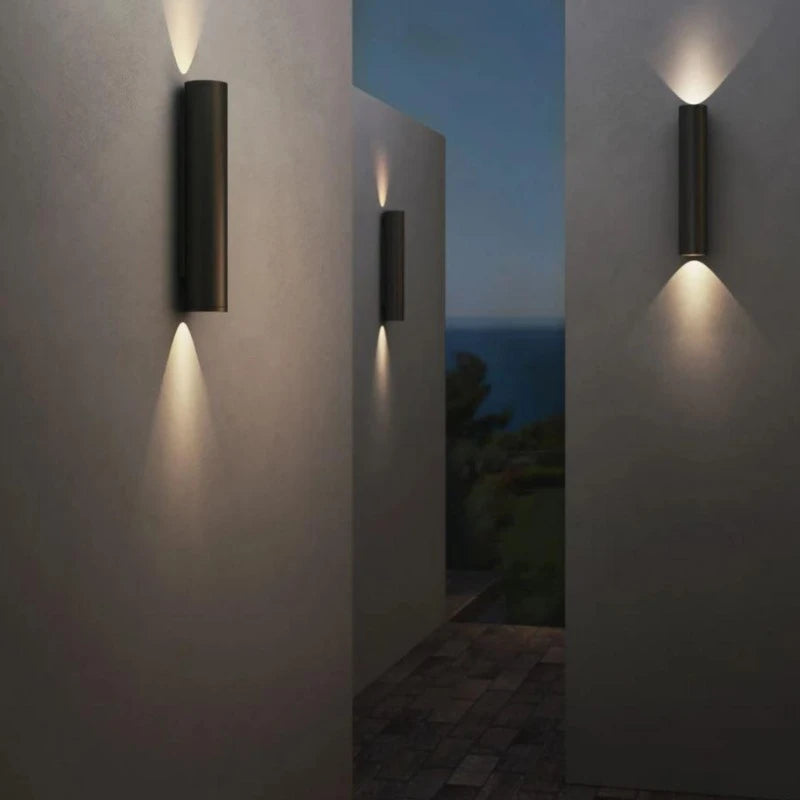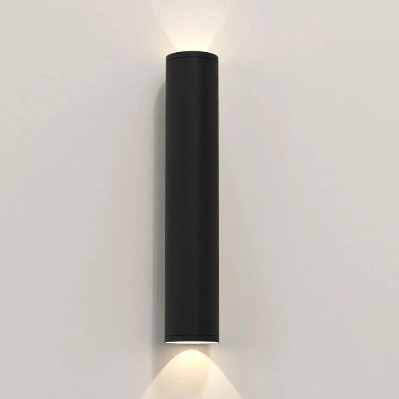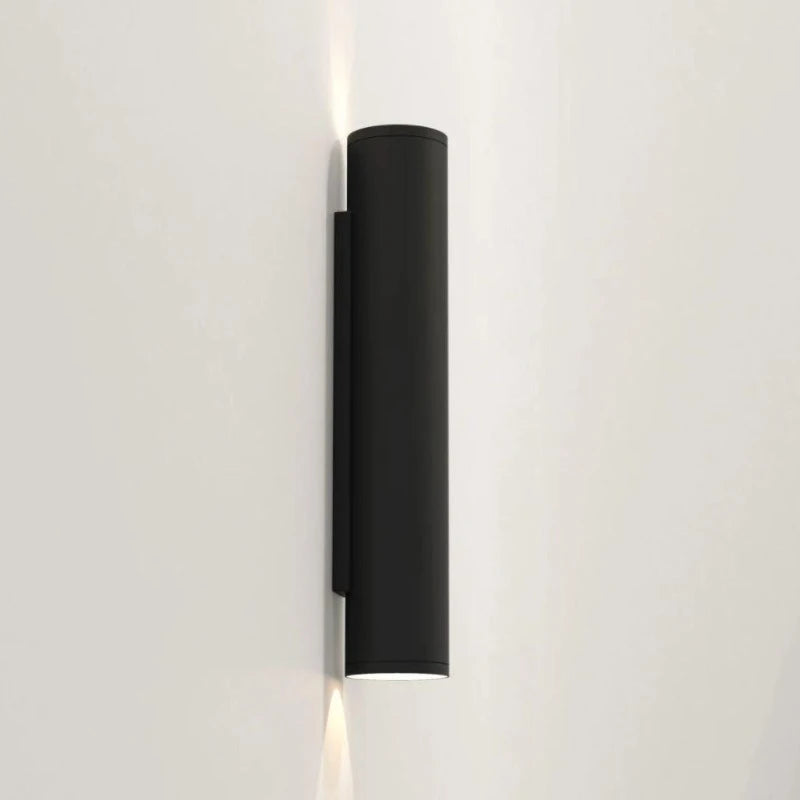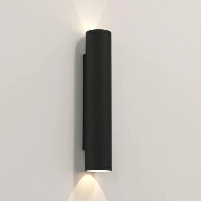 This textured Black Tubular Wall Light offers Upwards and Downwards illumination. Crafted from high-quality Aluminium this fitting has a protection level of IP44. Its Textured Black finish gives this Wall light a crisp outlined form, providing a strong contrast to light-coloured backgrounds.