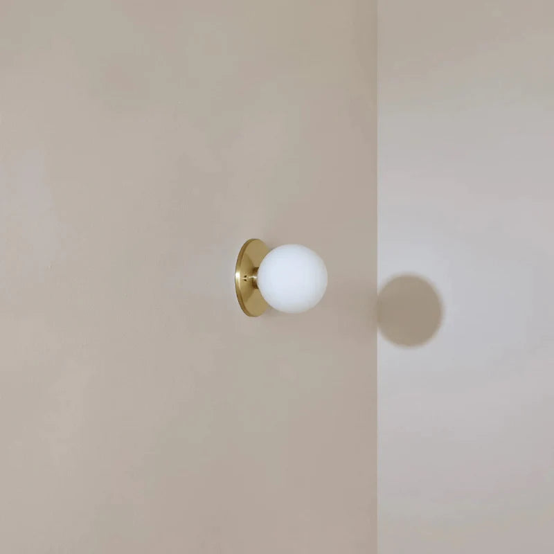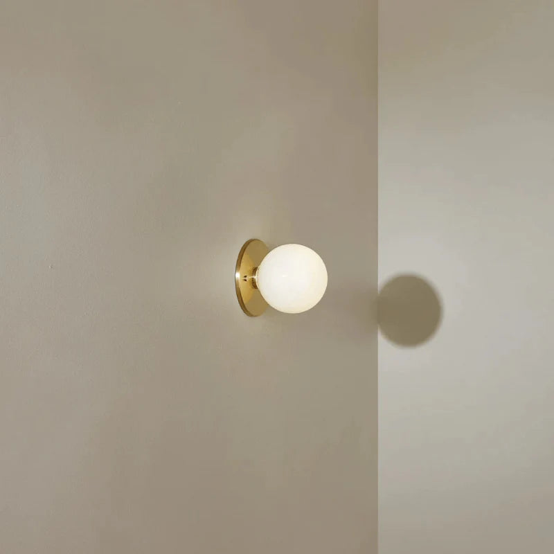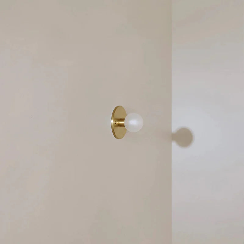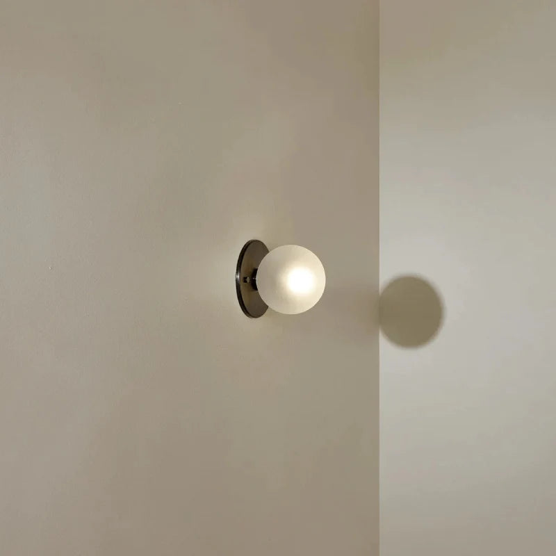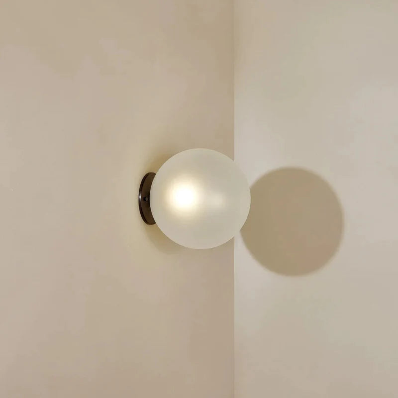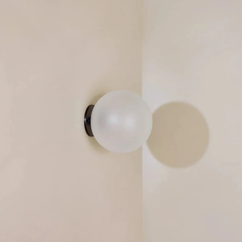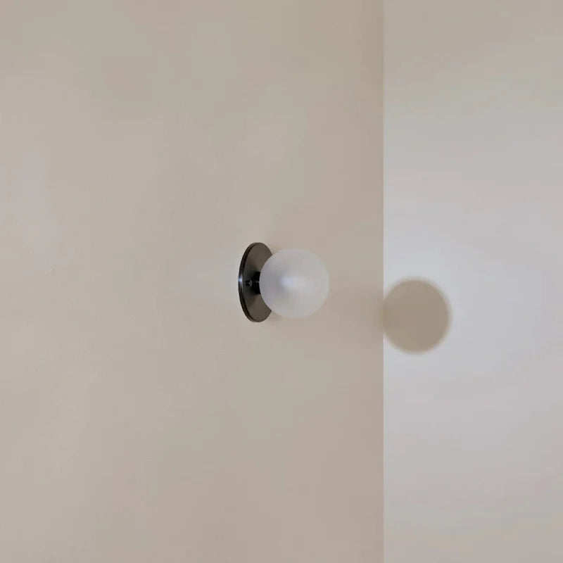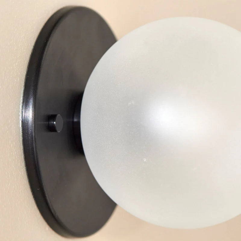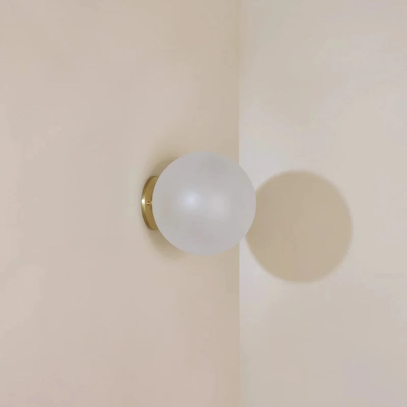 Enhancing any bedroom, kitchen, living room or entrance hall, this spherical wall light is made of glass with three elegant finishes, white frosted, clear frosted or opal, and of a simple metal thin circular mount available in brass, brushed black or satin white. Minimalist and timeless, this small, medium or large fixture will make a statement in any modern or contemporary interior bringing a glare-free cosy light in the surroundings.