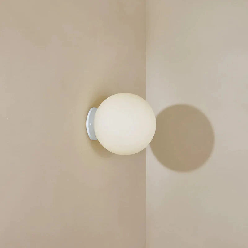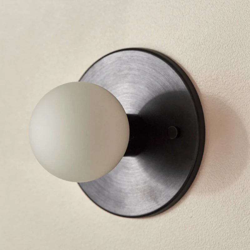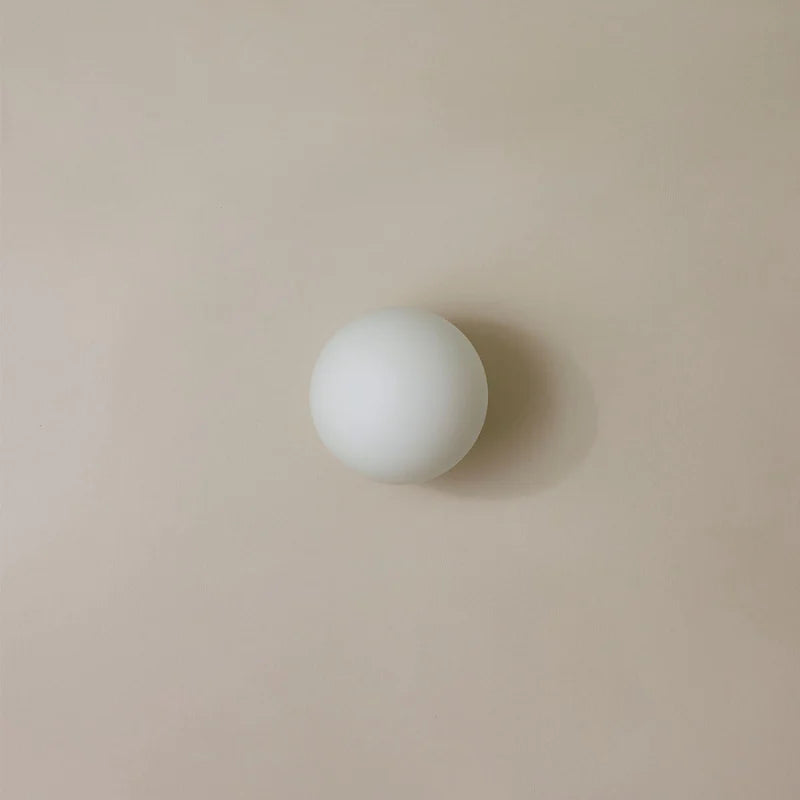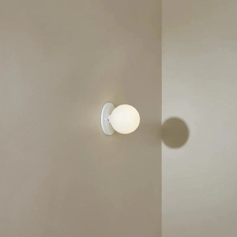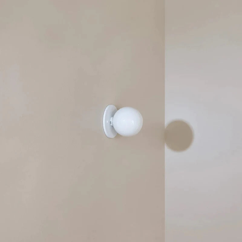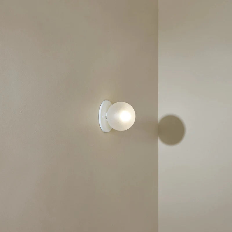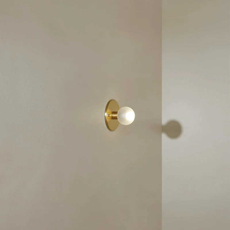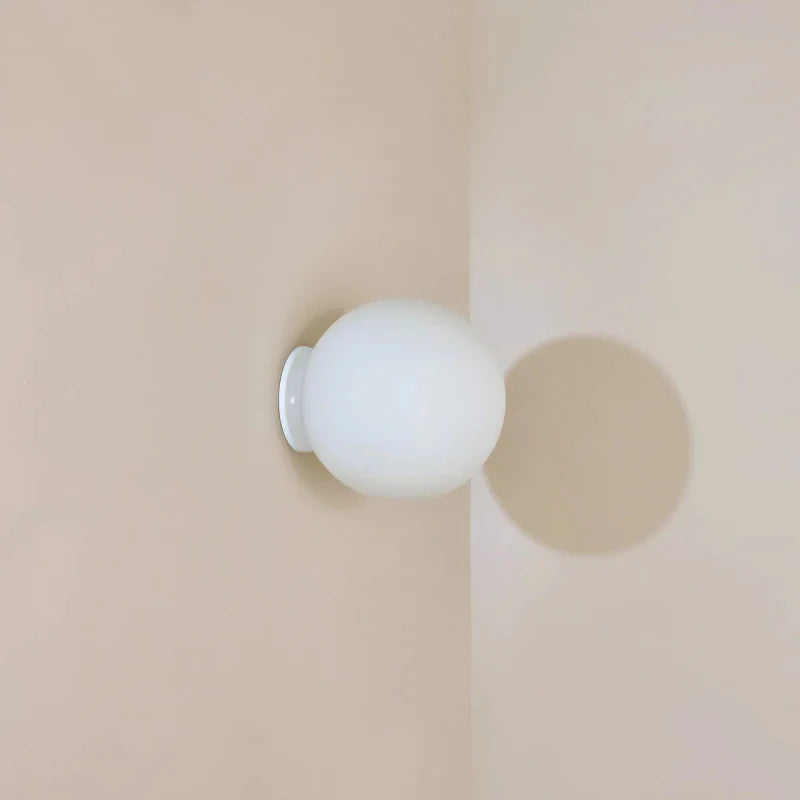 Enhancing any bedroom, kitchen, living room or entrance hall, this spherical wall light is made of glass with three elegant finishes, white frosted, clear frosted or opal, and of a simple metal thin circular mount available in brass, brushed black or satin white. Minimalist and timeless, this small, medium or large fixture will make a statement in any modern or contemporary interior bringing a glare-free cosy light in the surroundings.