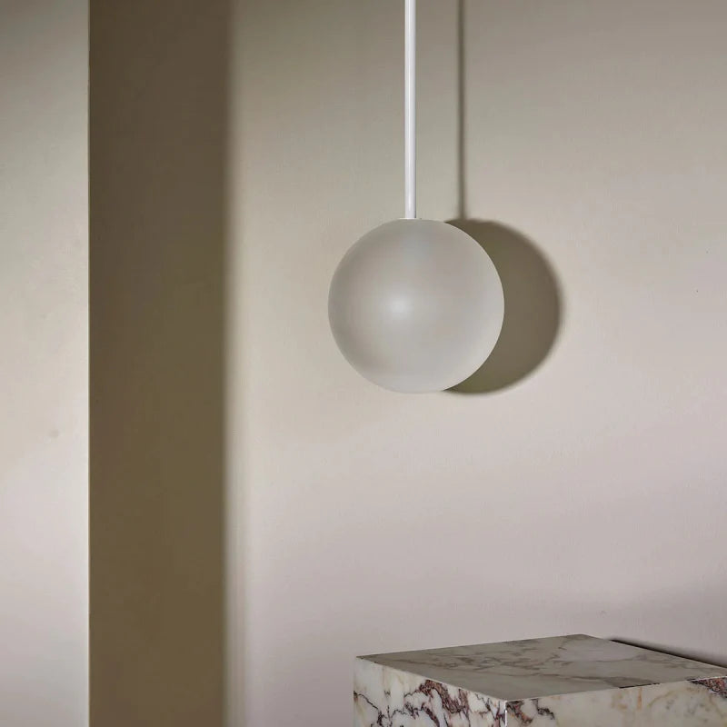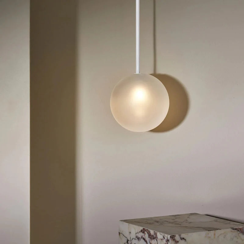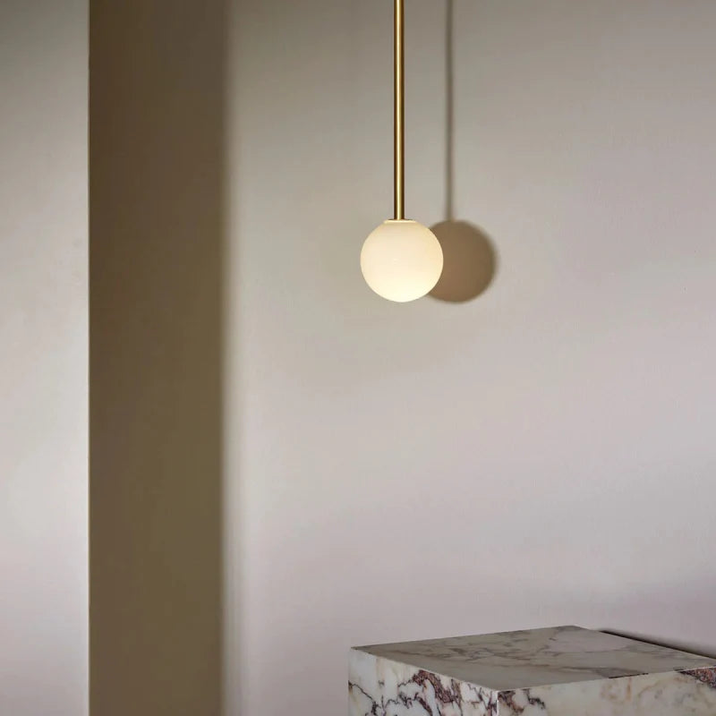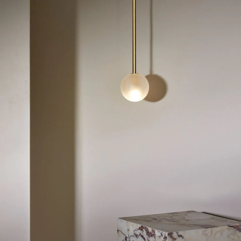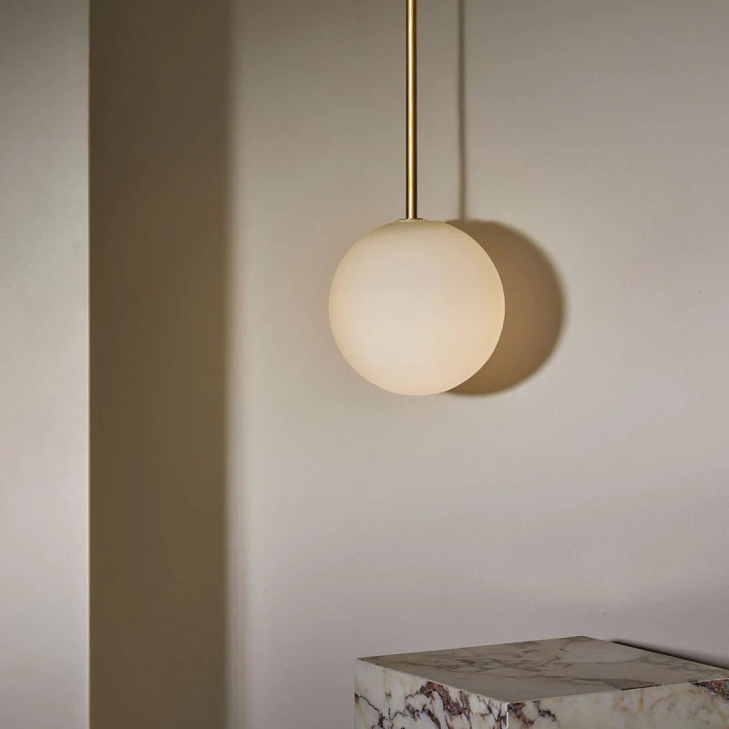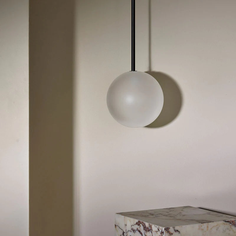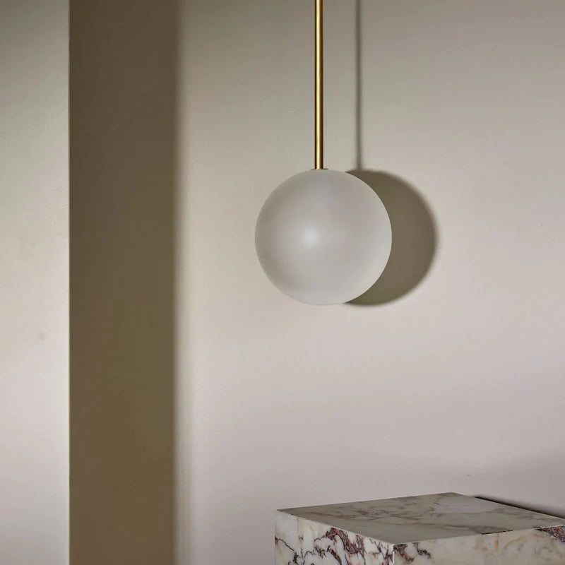 Clear frosted, white frosted or opal, the glass spherical shade which is available as well in three sizes will make a striking statement in classic or modern interiors. IP44 rated, dimmable and composed of brass, brushed black or satin white metal details, this fixture will bring a minimalist yet elegant touch to living rooms, dining rooms, entrance halls or bedrooms.