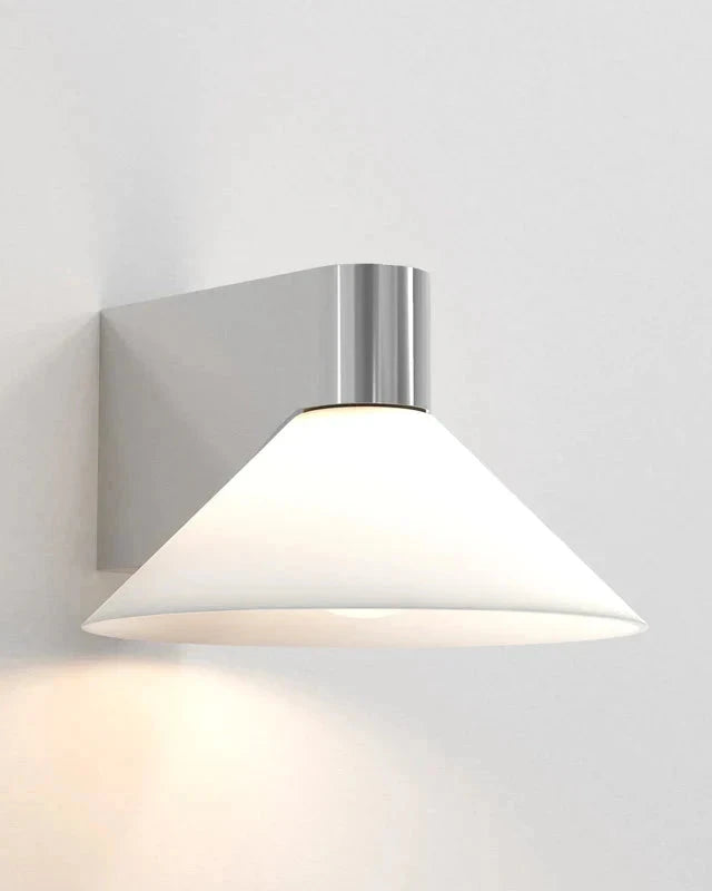 This geometric wall light will spread a soft downward light suited for vanities, hallways or beside the bed. The conical shape of the blown glass shade paired with a sleek zinc fixing delivers a sense of symmetrical elegance. The light is available in a matte black or polished chrome finish. Featured with an IP44 rating, this fixture is suitable for bathrooms.