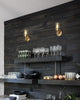 two glass vintage lights installed above a kitchen with black shelves and walls
