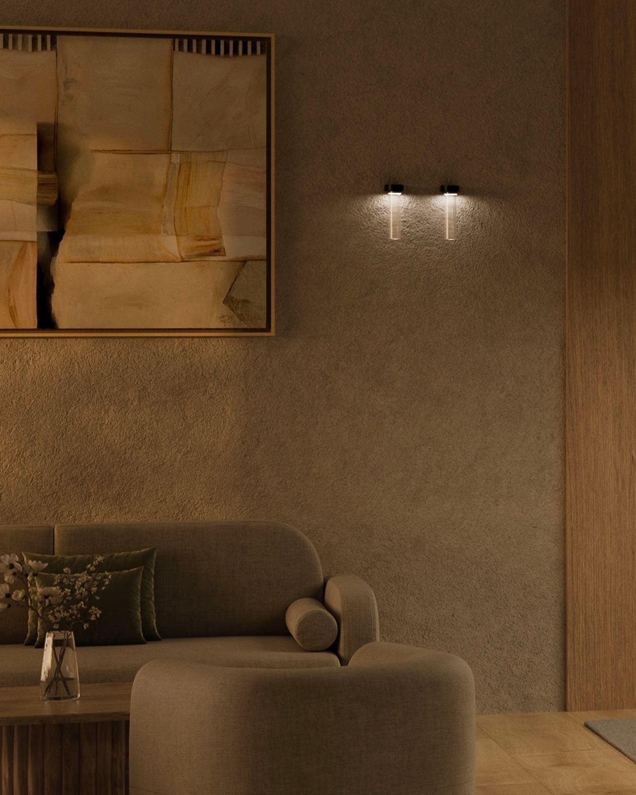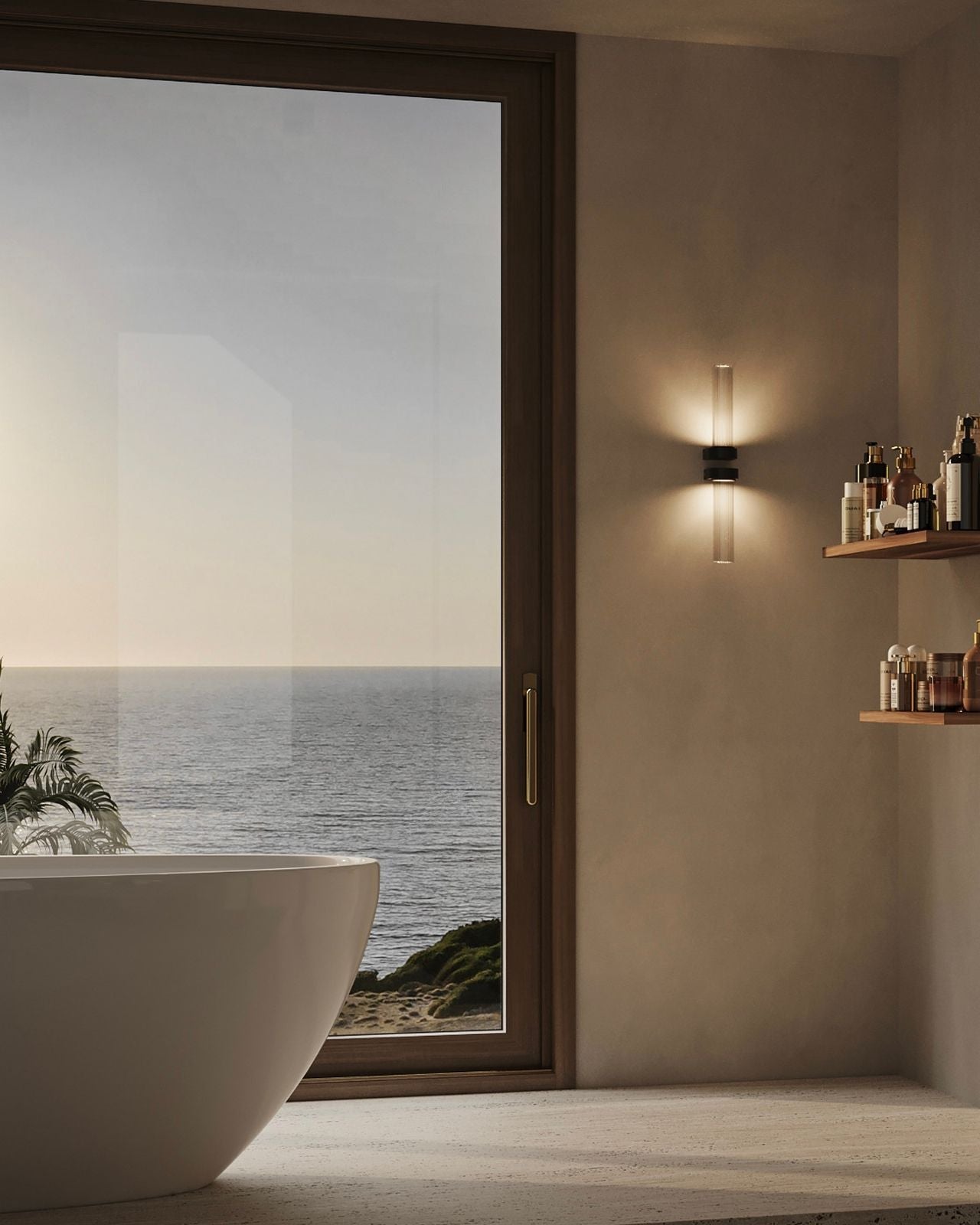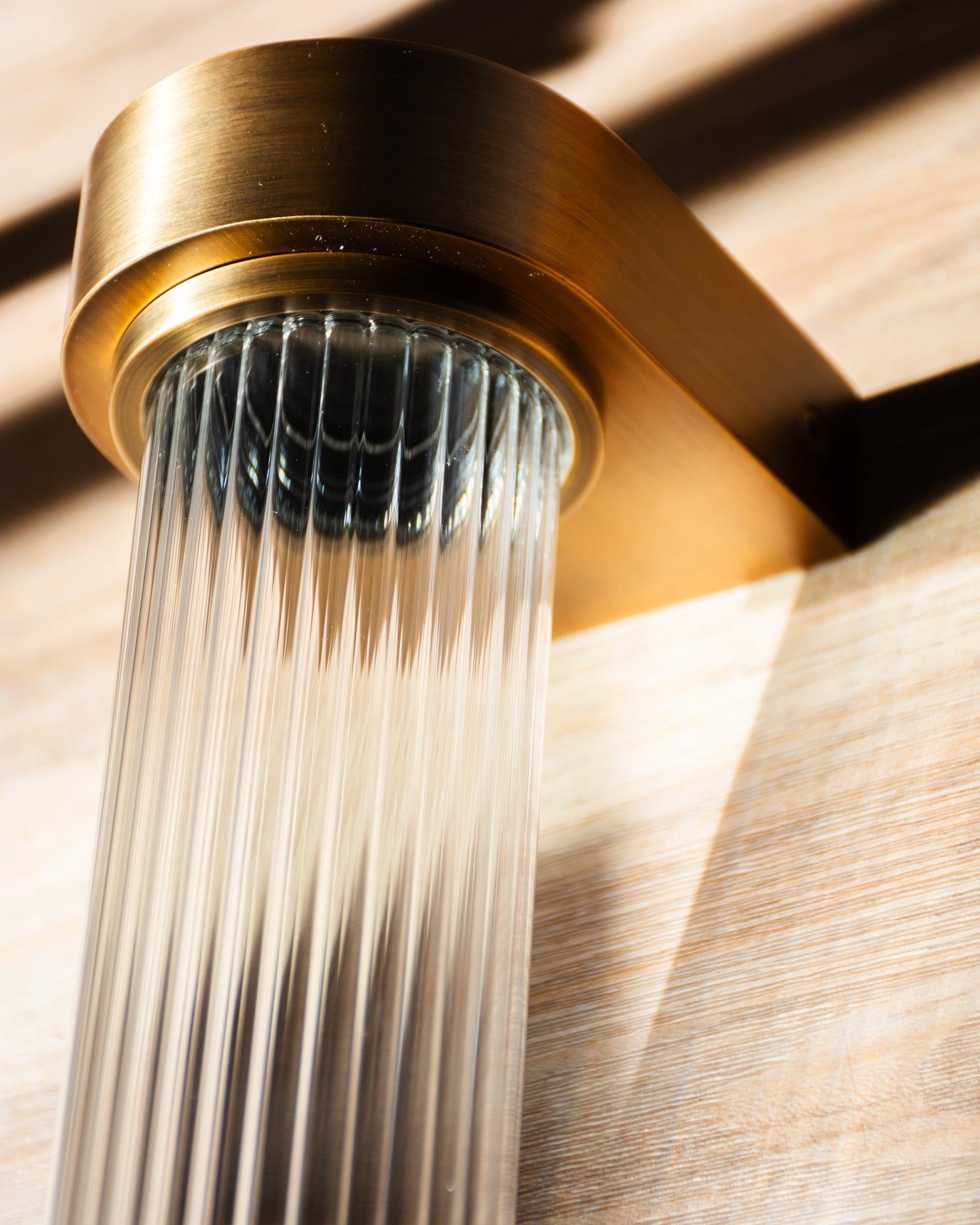 The Cylindrical Glass Wall Light presents a contemporary interpretation of classic design. A slim wall-mounted bracket, offered in Old Brass or Iron, supports a cylindrical borosilicate glass shade, available in clear, ribbed, or frosted finishes. Its balanced proportions and versatile design make it well-suited to a range of applications, from framing mirrors and illuminating hallways to enhancing bathroom interiors. With an IP44 rating, the fixture is suitable for damp environments while maintaining its refined appearance and can be installed with glass facing upwards or downwards.