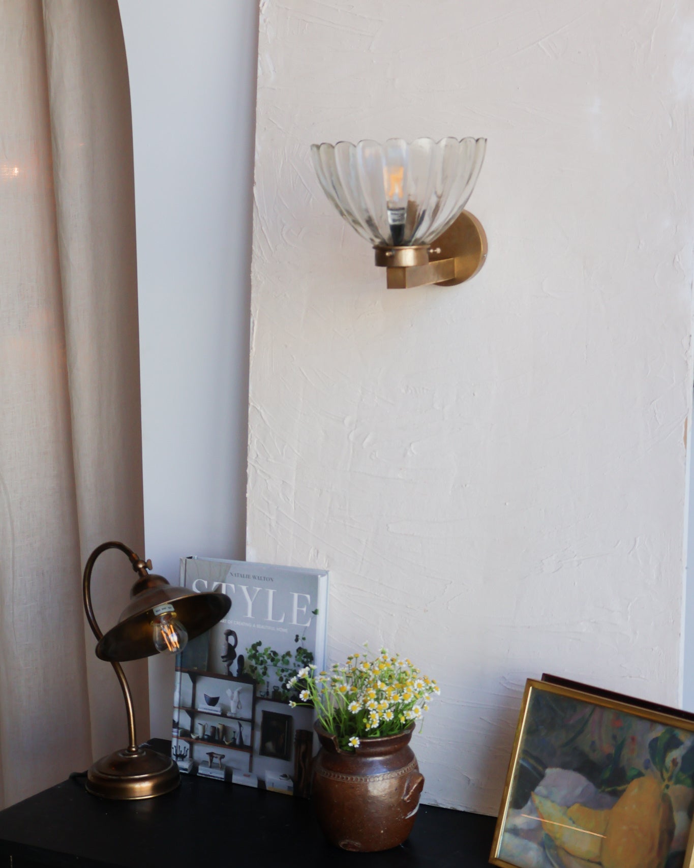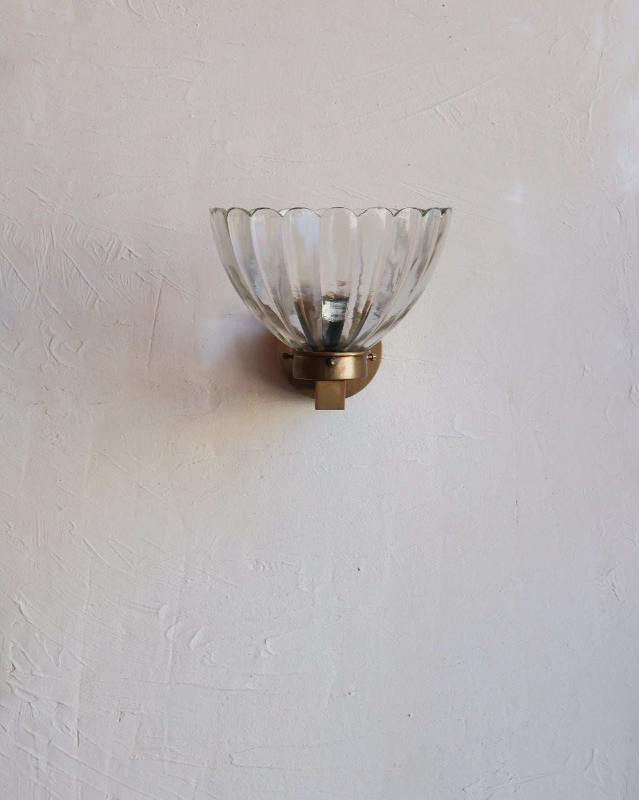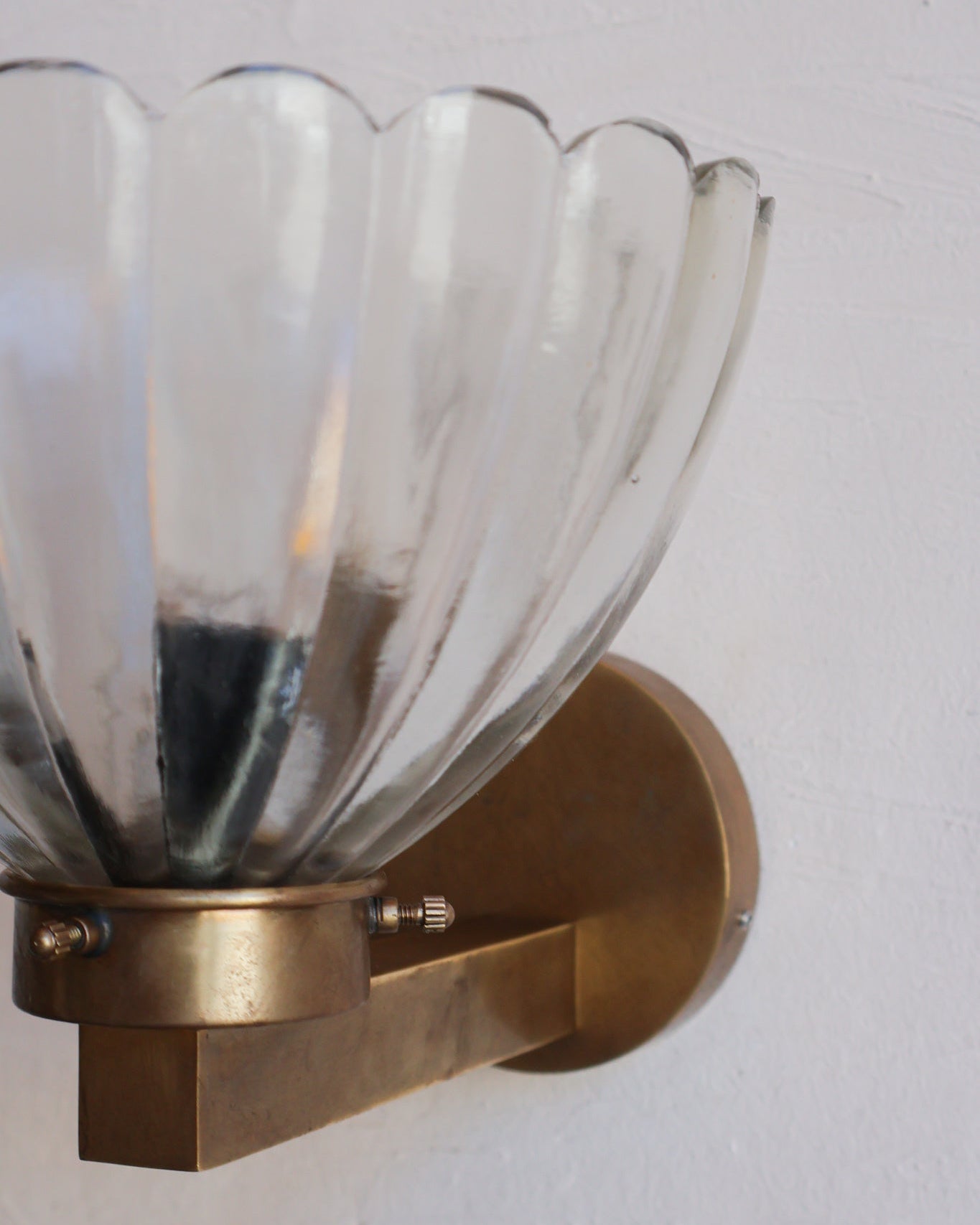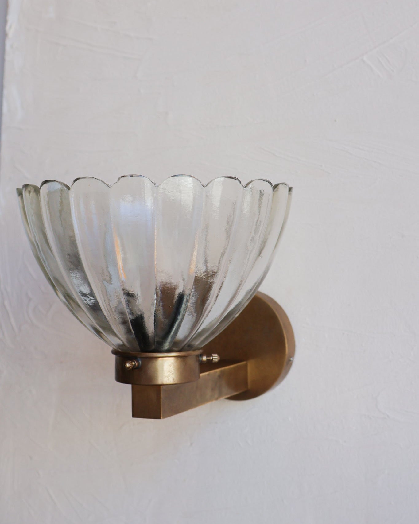 The Floral Art Deco Wall Light adds an element of elegance and uniqueness to any living room or hallway and is a perfect complement to mirrors in dressing rooms. Its modernist Art Deco style is enhanced by a beautiful hand-blown clear glass shade with a flower shape, mounted on a short antique brass arm. Each piece is unique due to its handmade glass production, with slight variations that may occur.