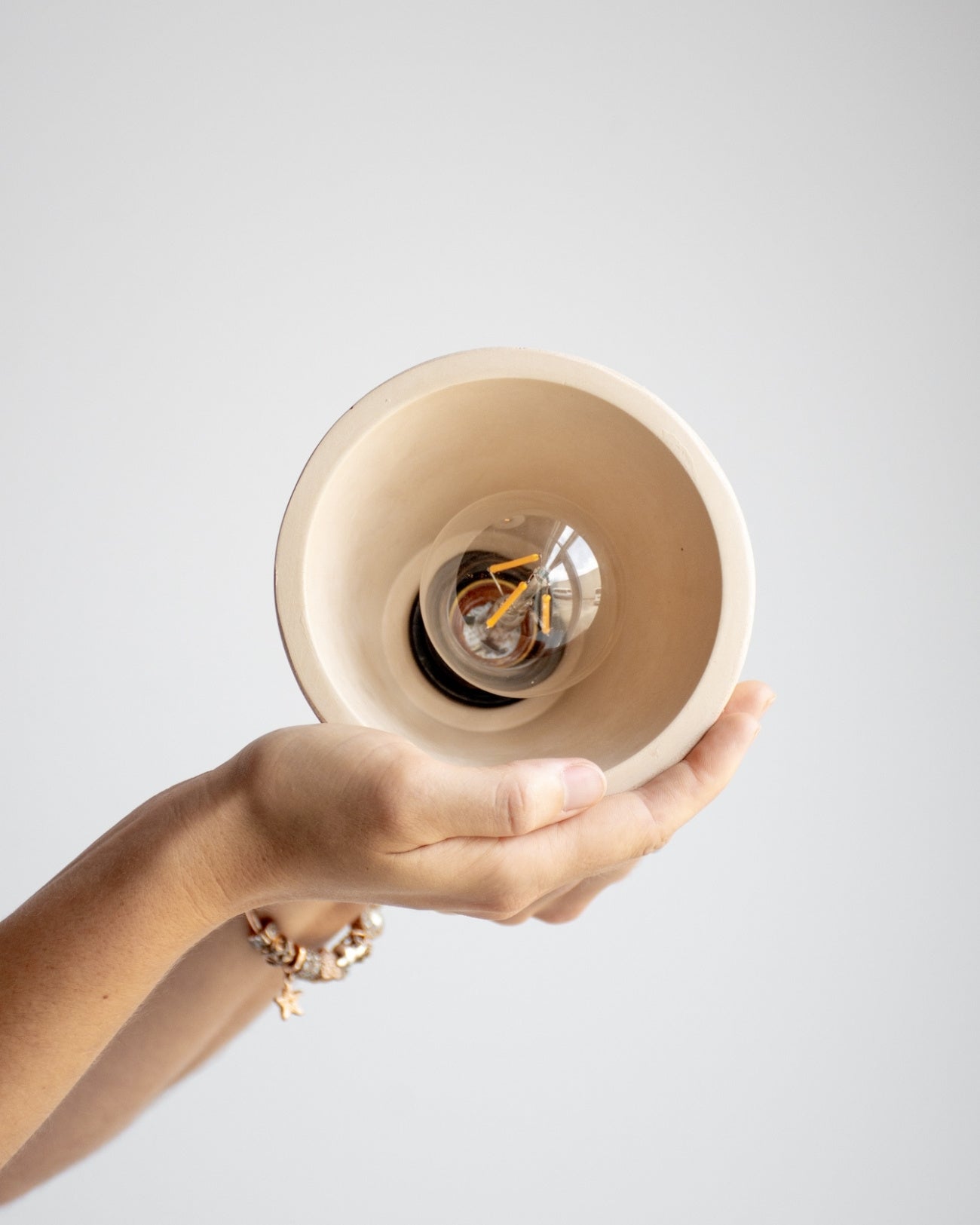Hand holding a cone-shaped lamp with a textured beige shade against a gray background