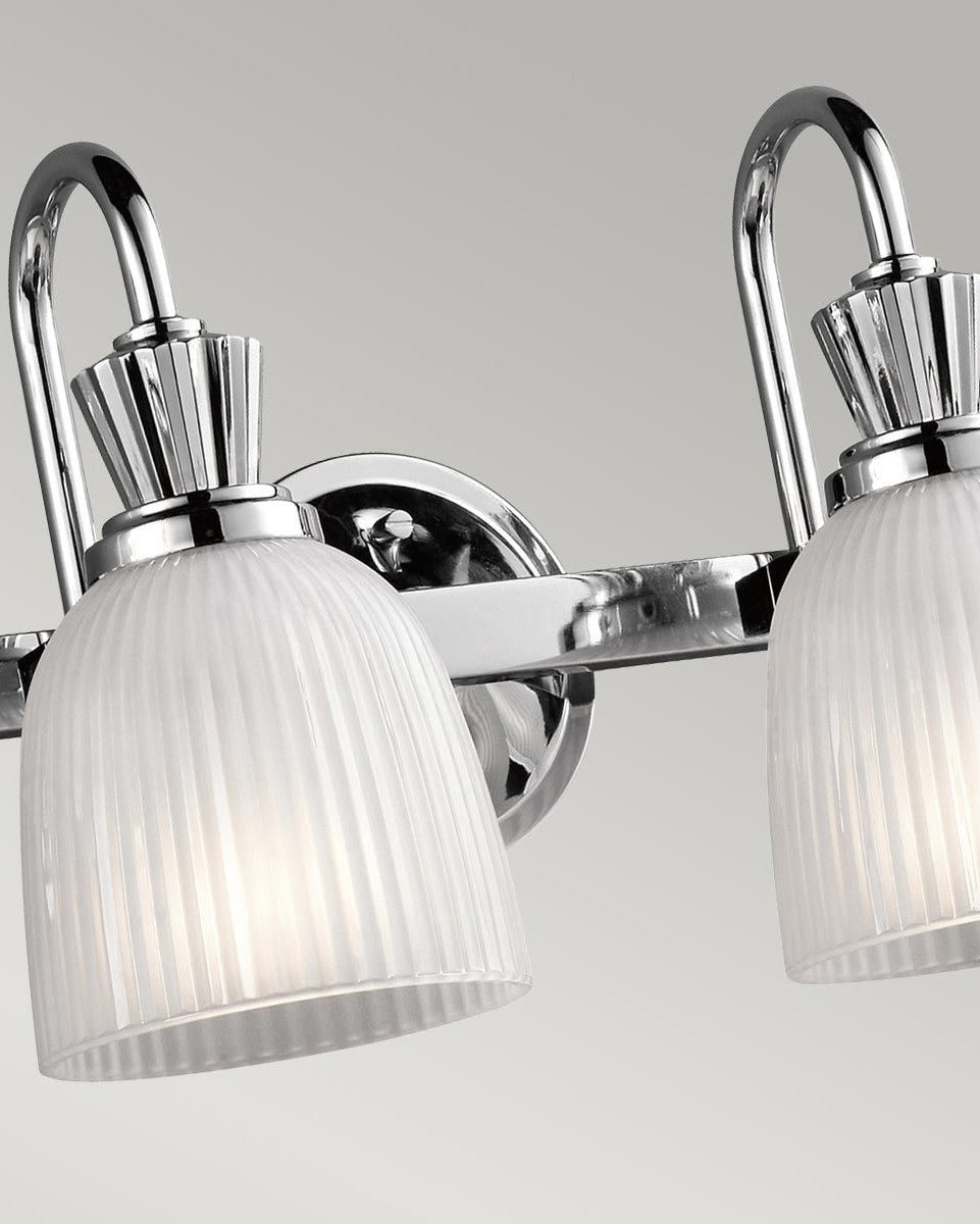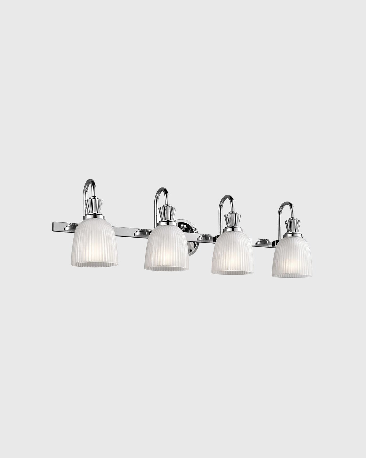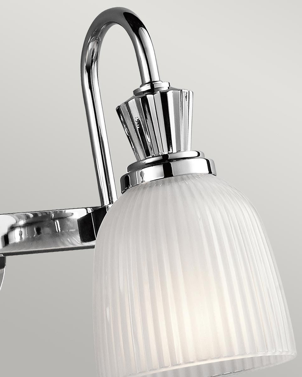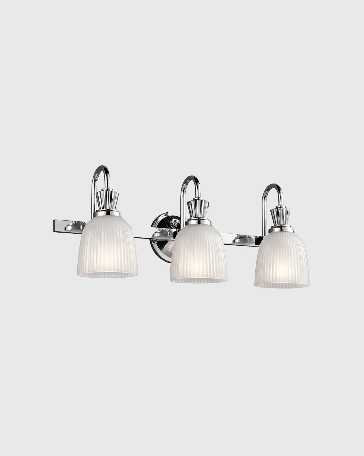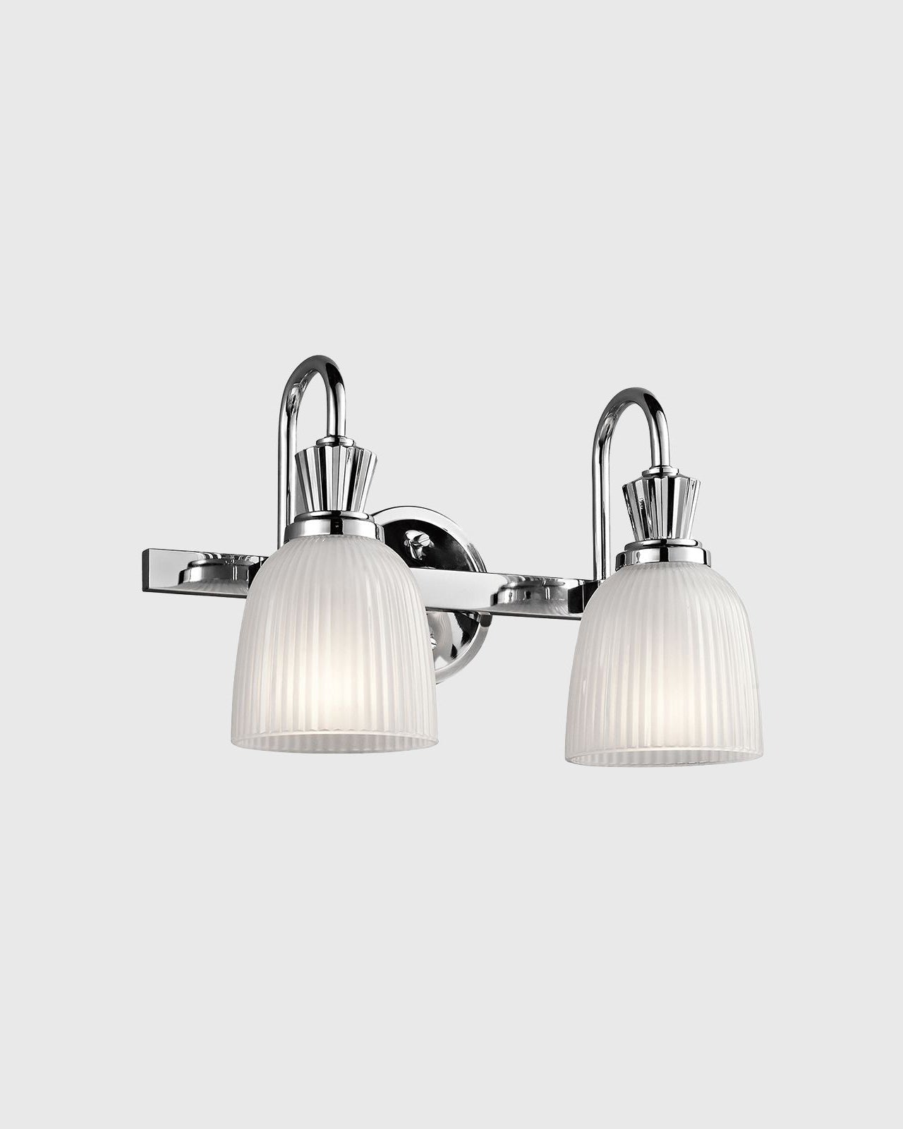 This classic bell shade wall light features clean detailed chrome arms and glass bell shades. A simple elegant detail to your lighting selections in polished chrome and ribbed glass available different sizes.