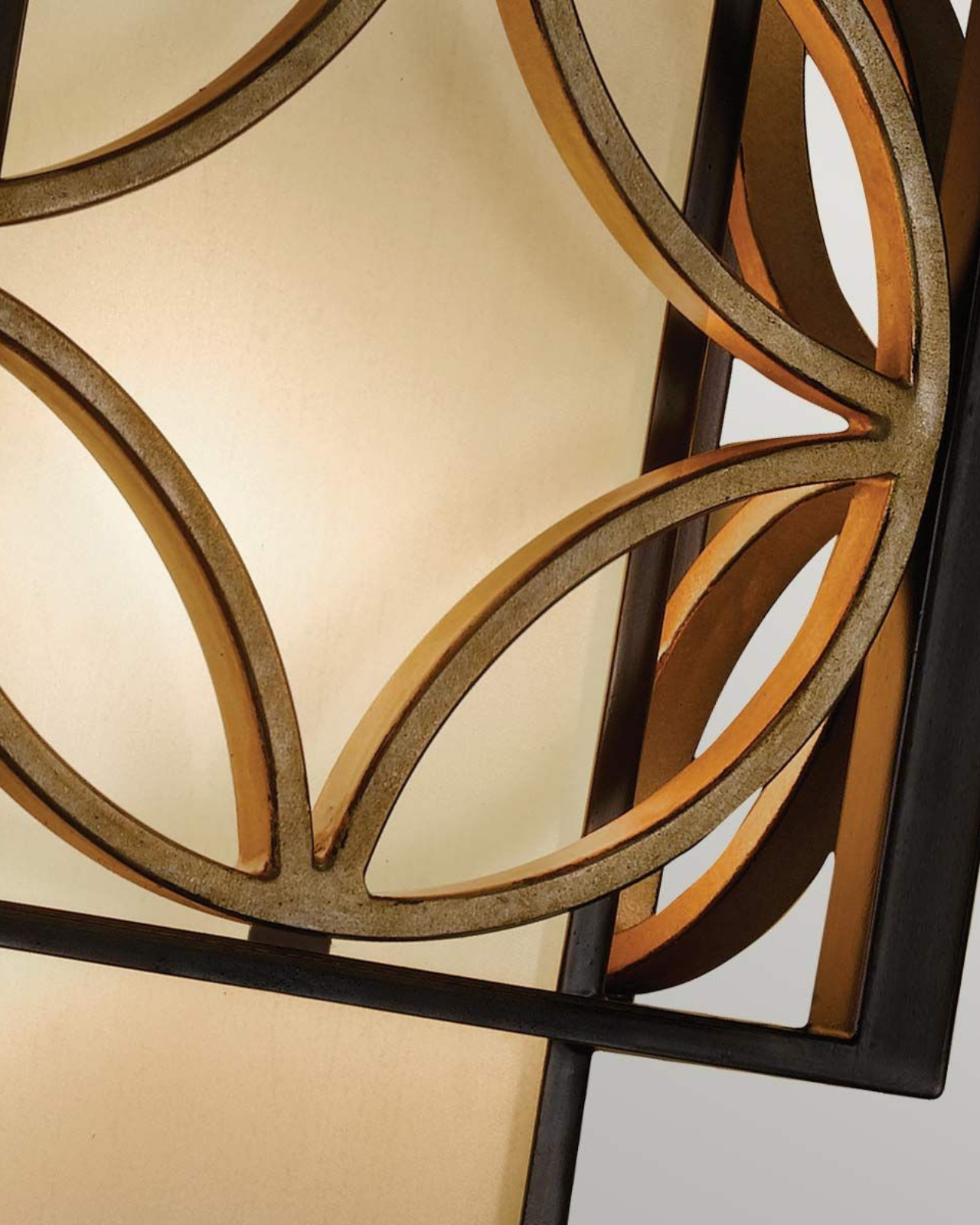 Drawing inspiration from French art, this stunning wall fitting features a classic mid-century motif which makes up the decorative outer frame. This decorative frame has been finished in Parisienne Gold, which beautifully complements the soft bronze organza interior shade.