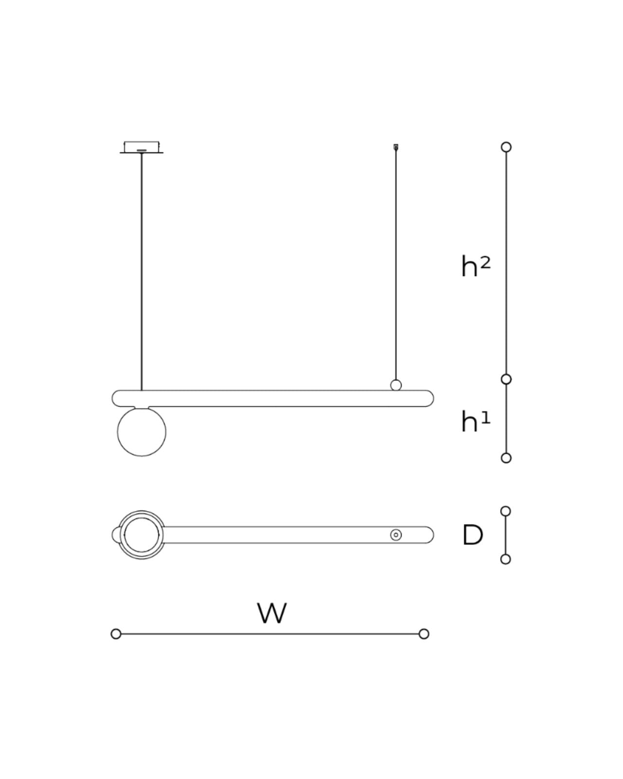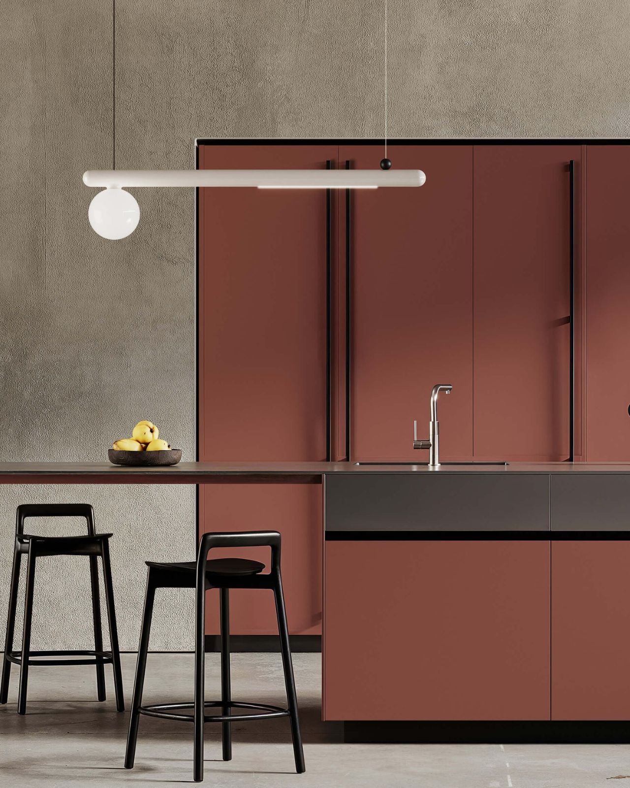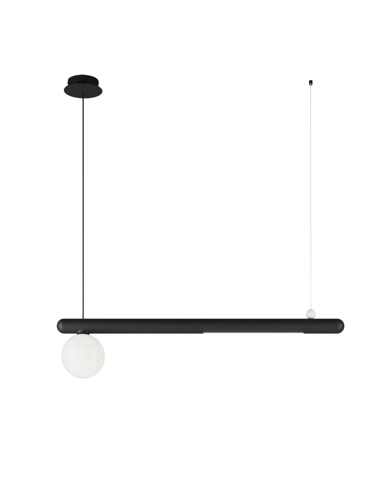 The Asymmetrical Linear Pendant features a cylindrical bar with a smooth, glossy finish, suspended delicately by near-invisible wires for a floating effect. At one end, a rounded opal glass globe emits a soft, diffused glow, while the central section integrates a discreet downward LED strip for task lighting. The offset composition creates a sense of balance and tension, blending sculptural design with functionality. Ideal over kitchen islands or dining tables. Available in glossy lava red, matte midnight grey, or a glossy white finish, featuring a white glass diffuser and a decorative metal sphere that matches the frame finish.