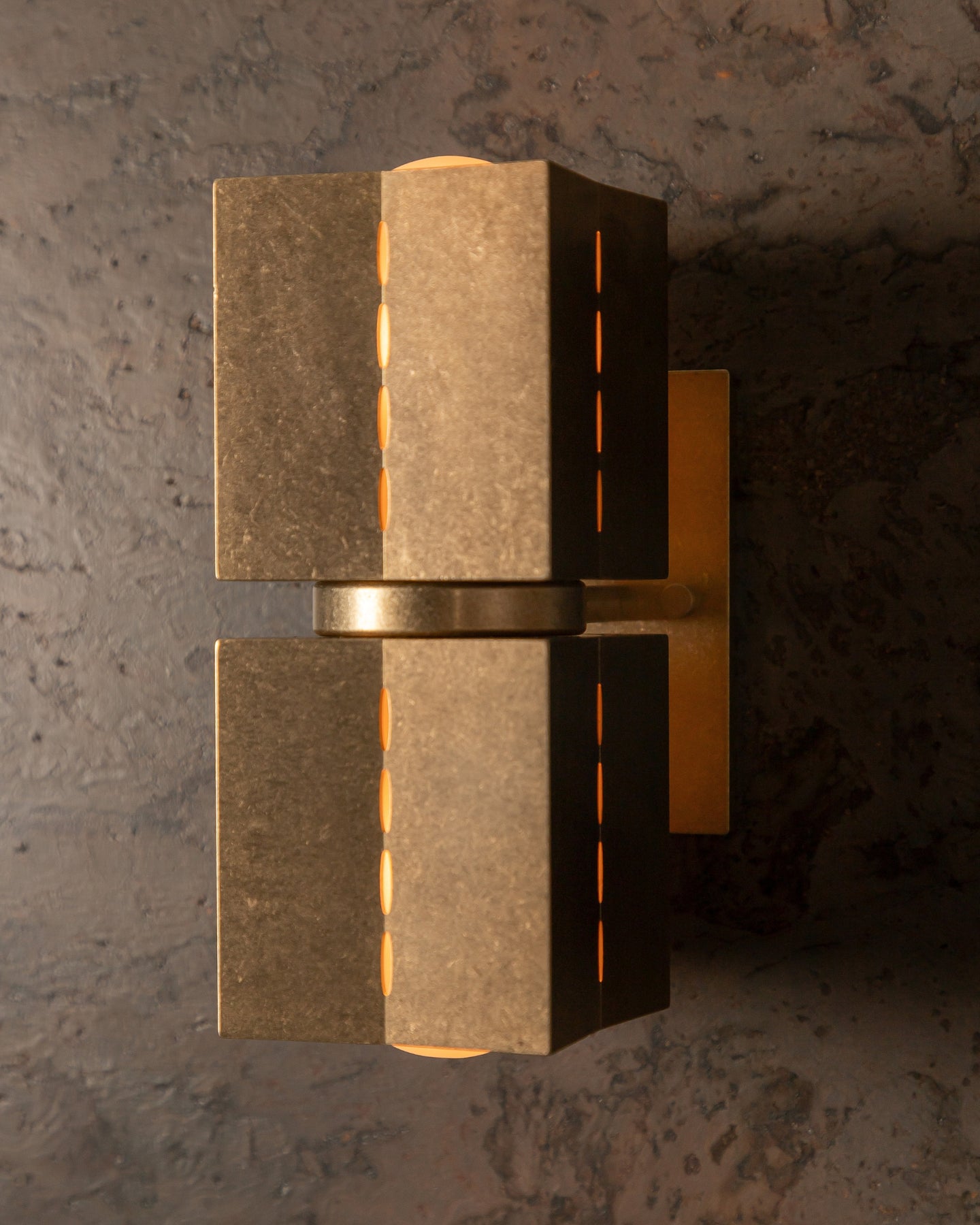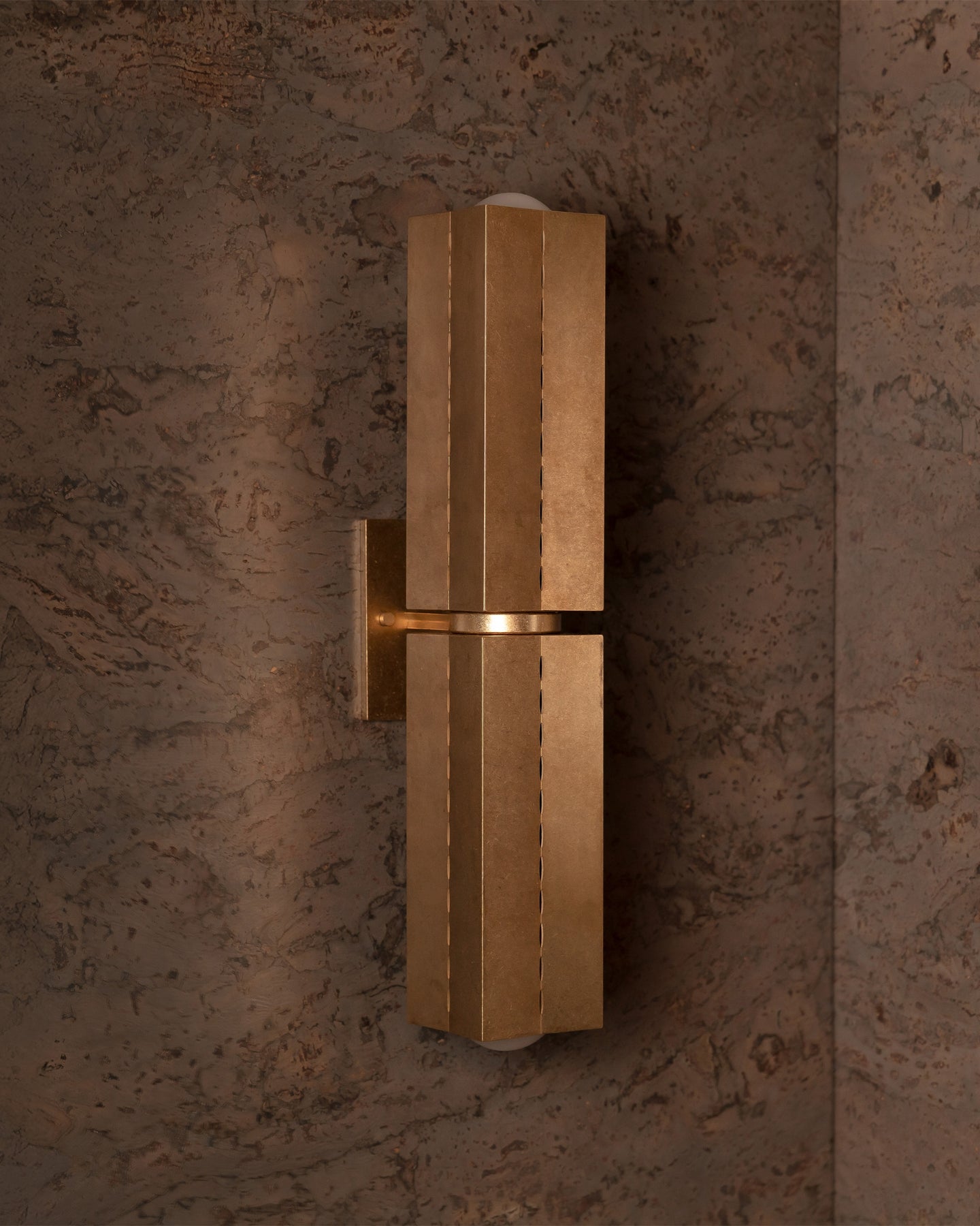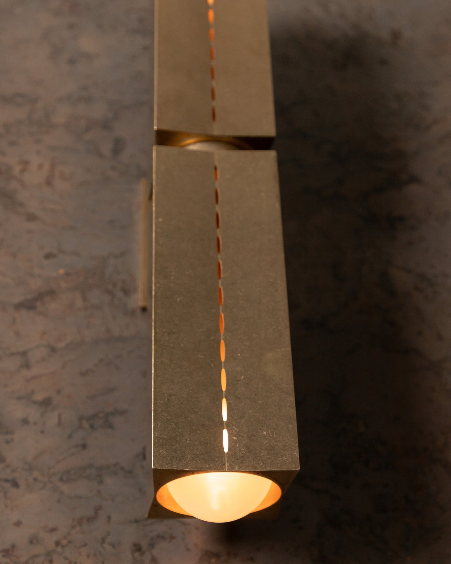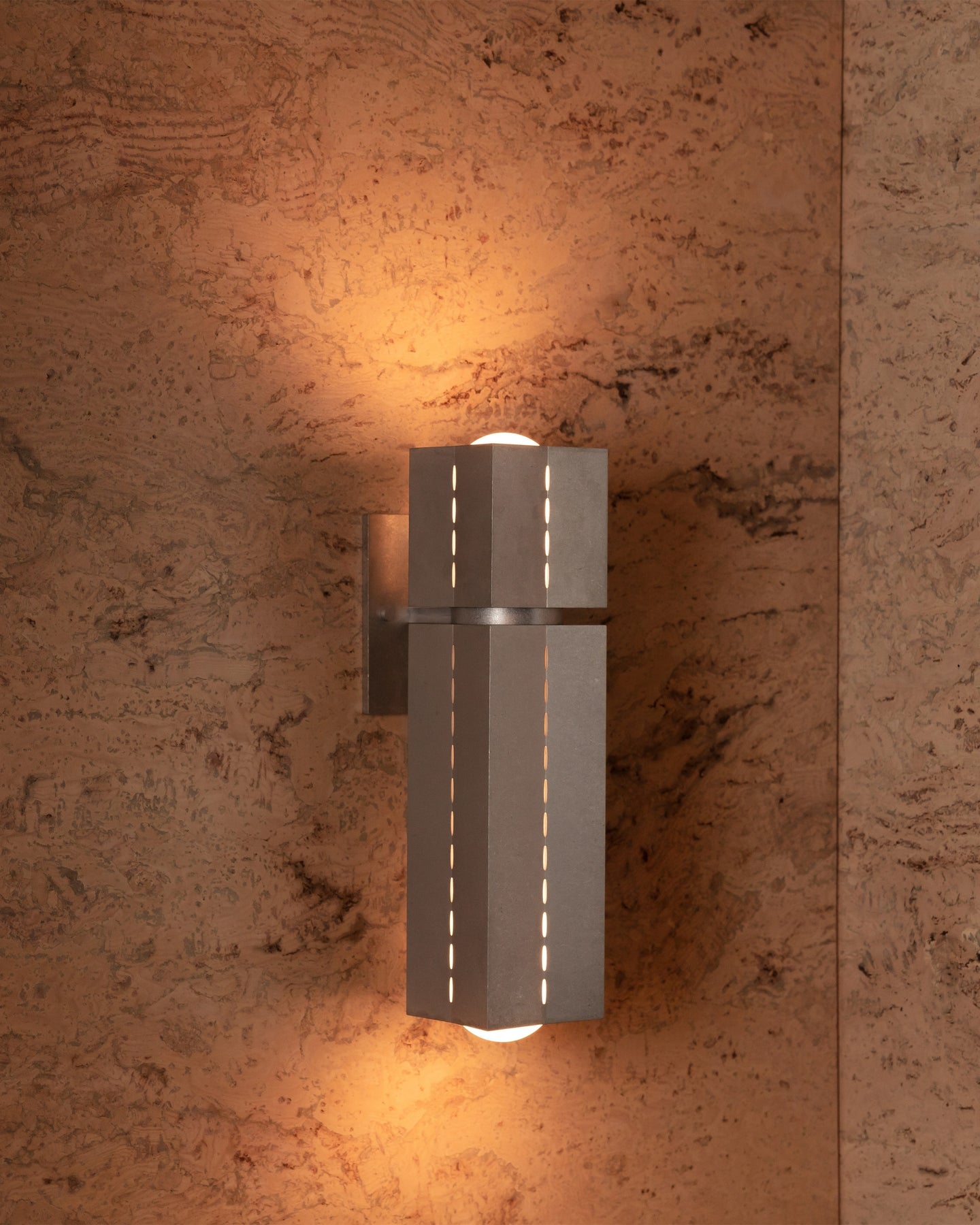 The Perforated Metal Wall Light | Polaris takes inspiration from Brutalist architecture and the guiding symbolism of the North Star. Defined by its geometric form and celestial illumination, this sculptural fixture features machined metal shades with fine linear perforations that create a striking interplay of light and shadow when illuminated.