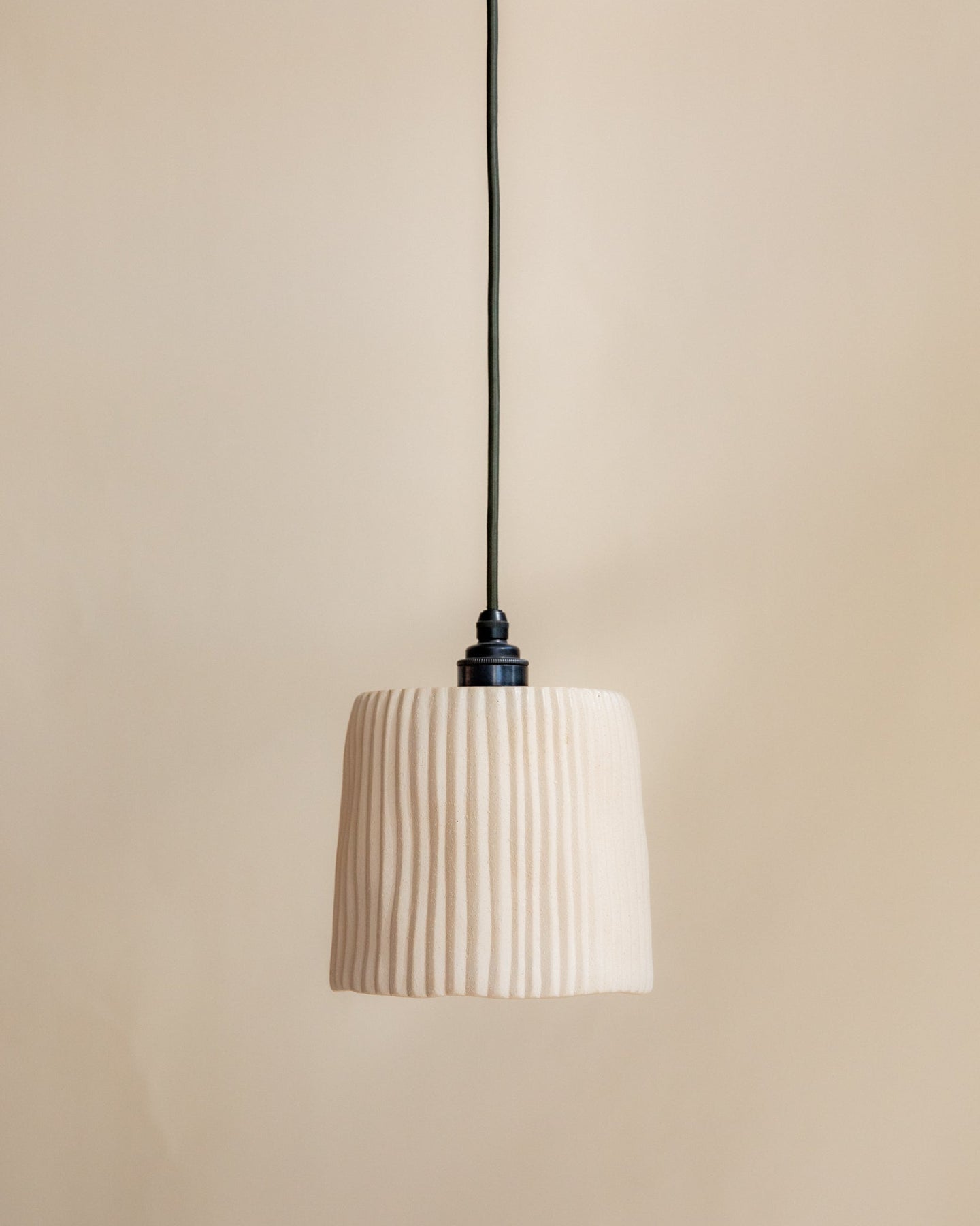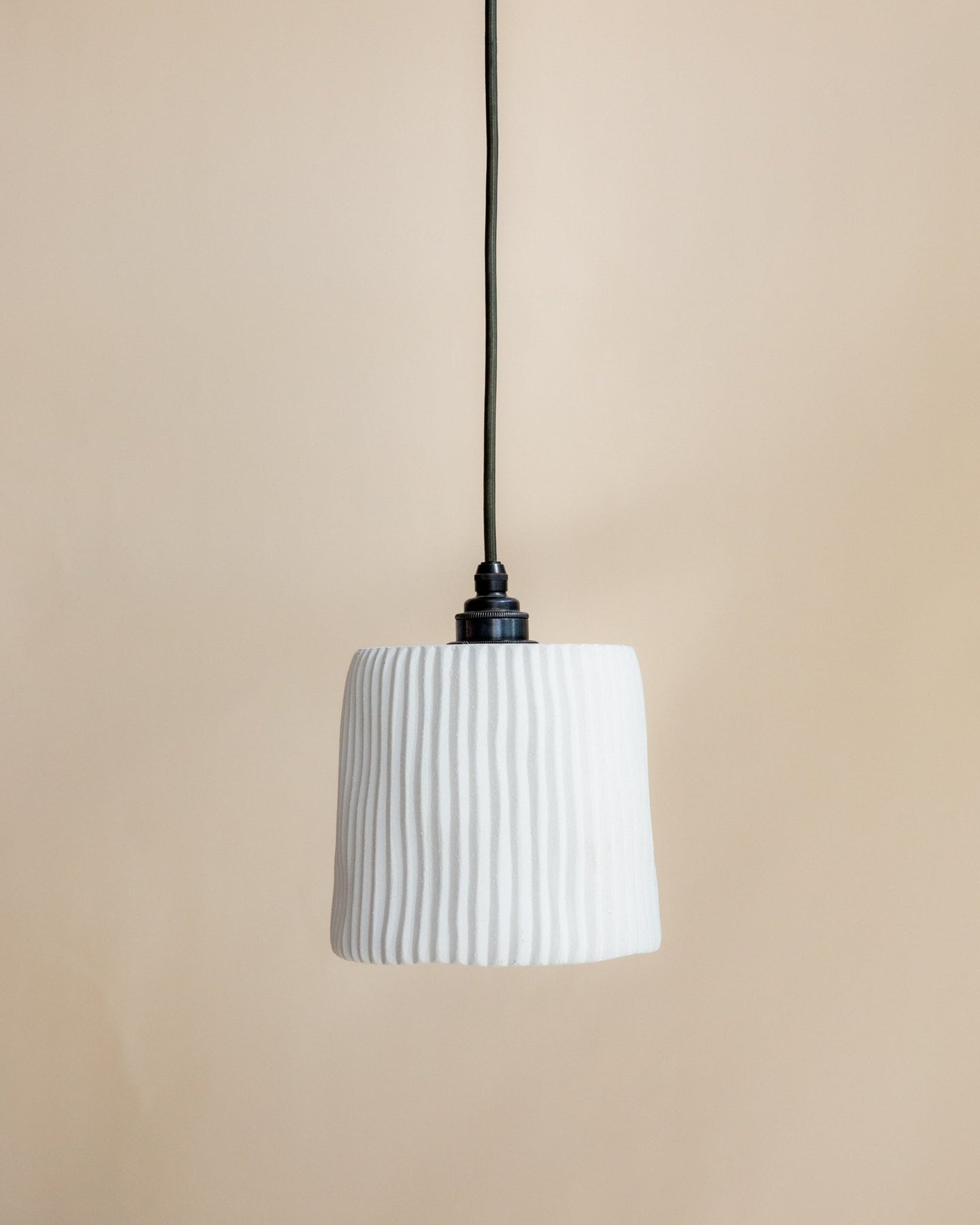 Ribbed Cylindrical Concrete Pendant - Bone White / Brass / Canvas Pulley