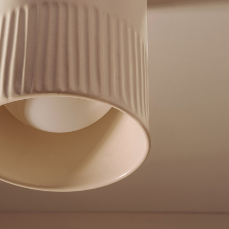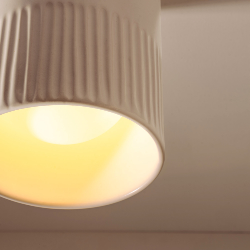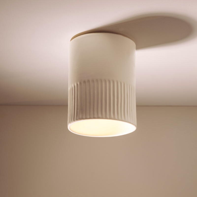 Carefully crafted from smooth ceramic clay in Tasmania, Australia this ceiling light is designed to bring elemental ambience to any interior space. Individually hand-dipped in an eggshell white glaze, the rippled cylindrical shape of Day is a stunning ceramic feature for lighting up a room.