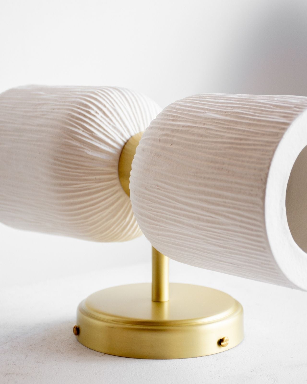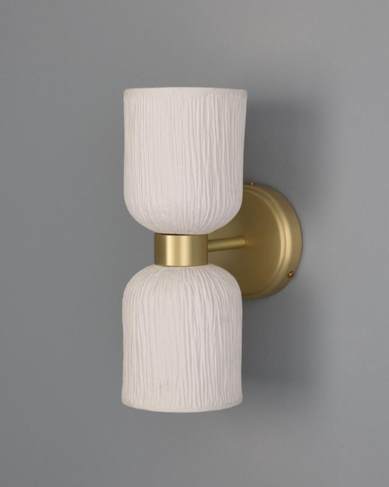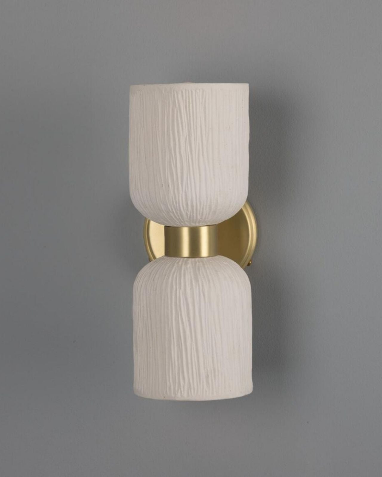 Featuring two curved cylindrical ceramic shades, the Ceramic Cylindrical Double Wall Light is a timeless design inspired by Sakura trees. Hand-carved in Ireland, the matte white striped finish adds a touch of sophistication. Available in a satin brass or antique brass finish.