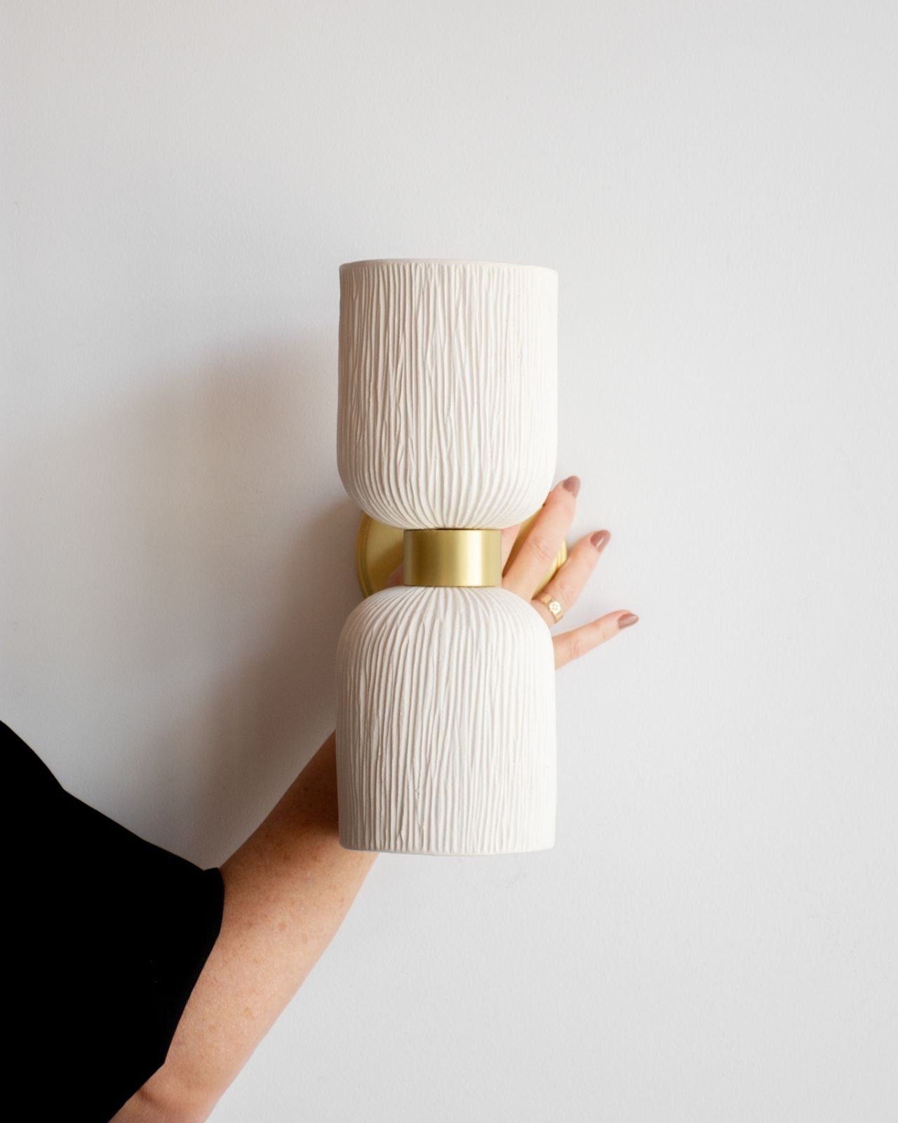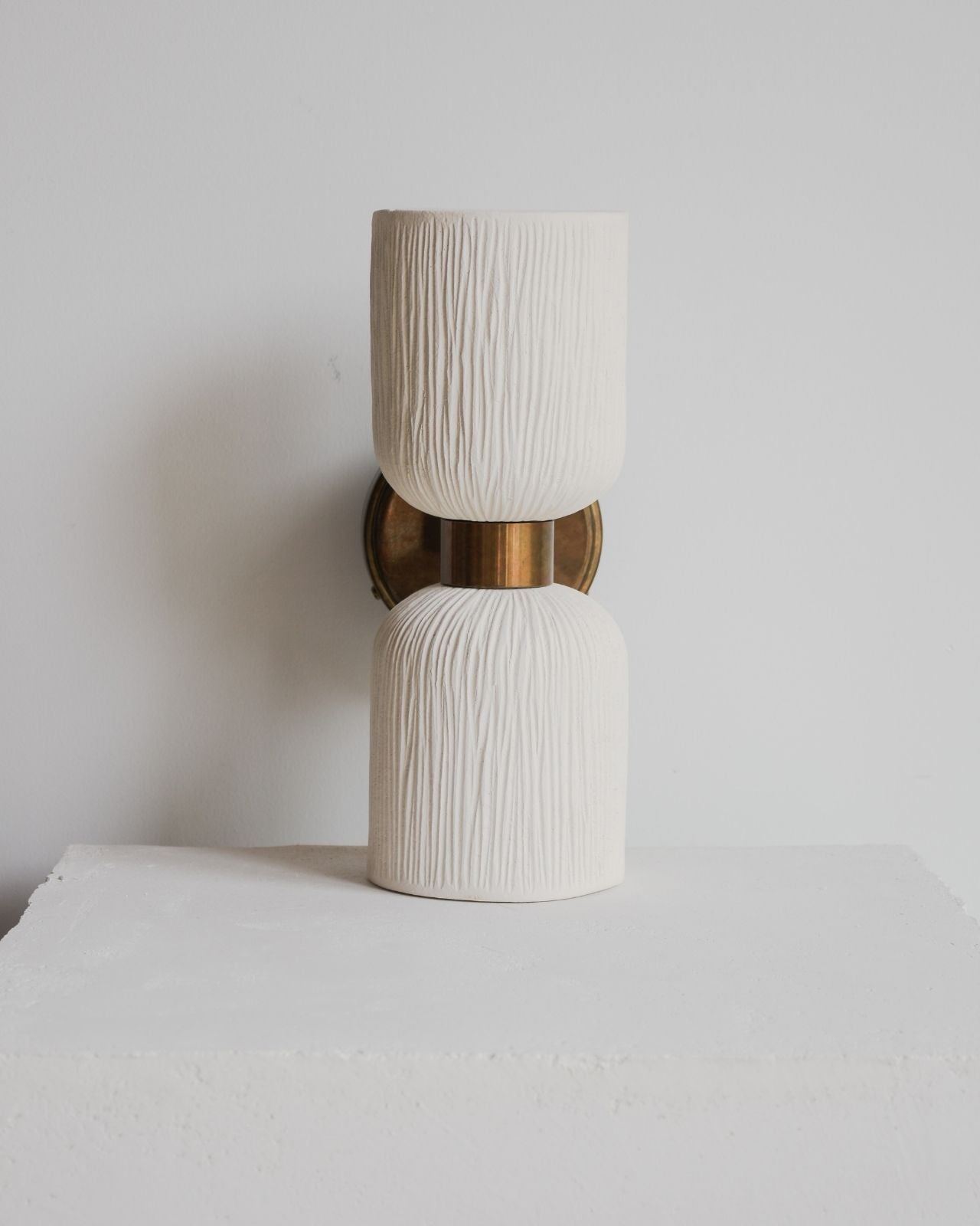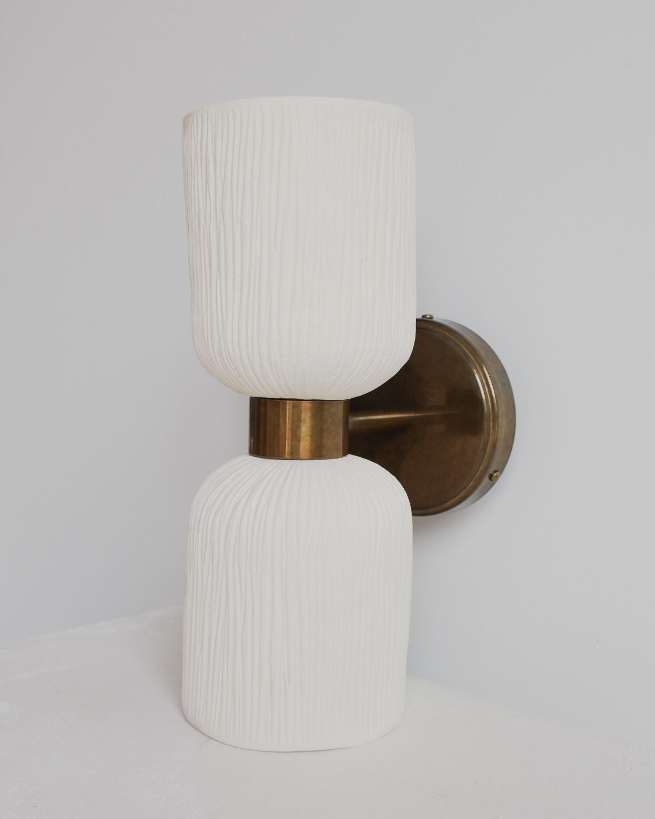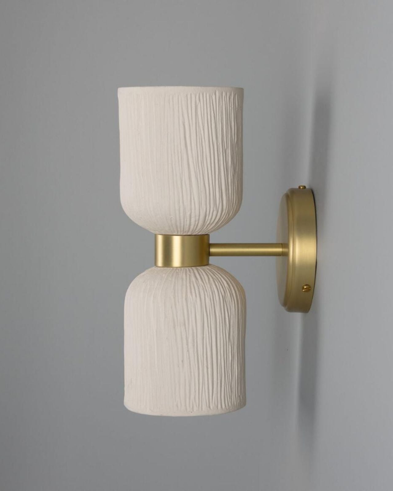 Featuring two curved cylindrical ceramic shades, the Ceramic Cylindrical Double Wall Light is a timeless design inspired by Sakura trees. Hand-carved in Ireland, the matte white striped finish adds a touch of sophistication. Available in a satin brass or antique brass finish.