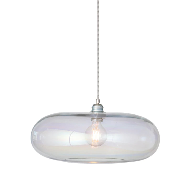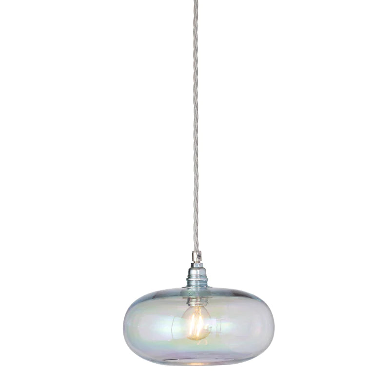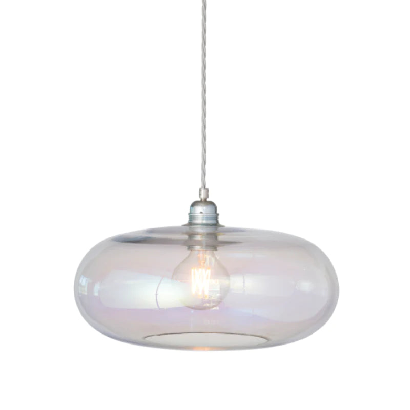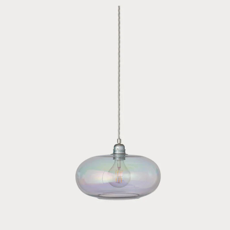 Pendant light with iridescent glass shade on a white background