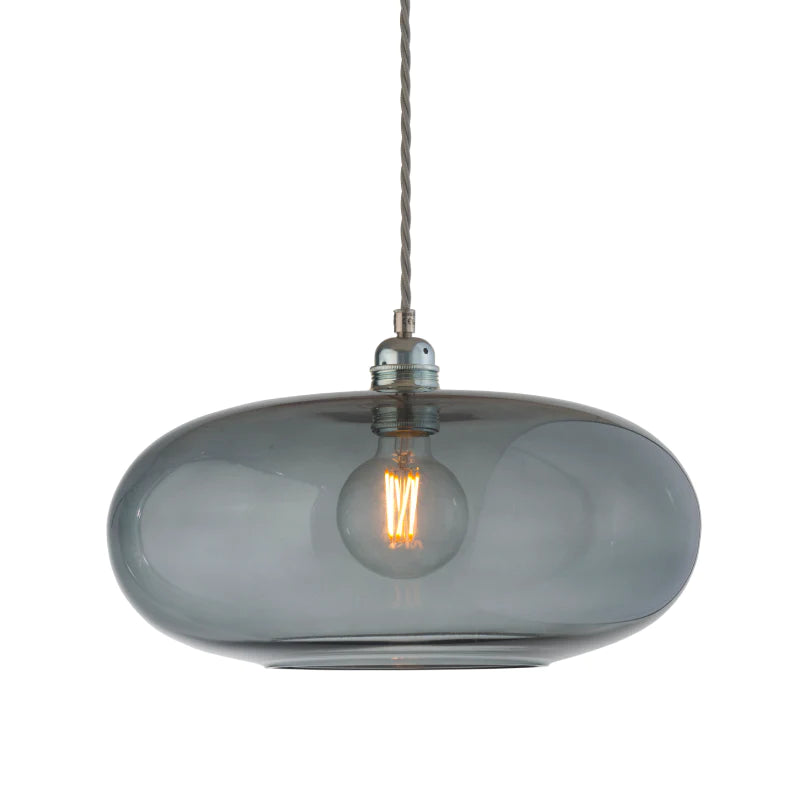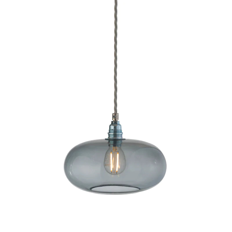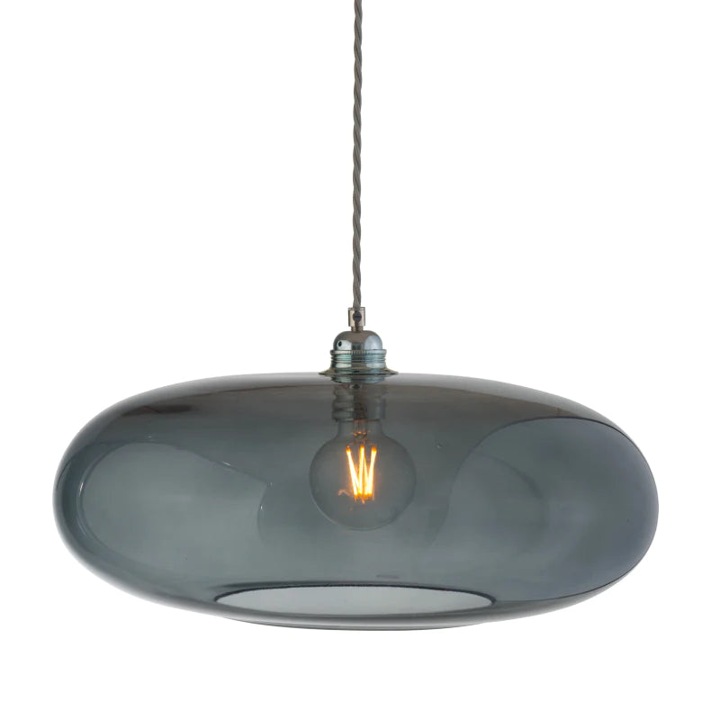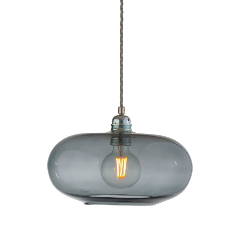 Smoky grey pendant light with a visible bulb on a white background