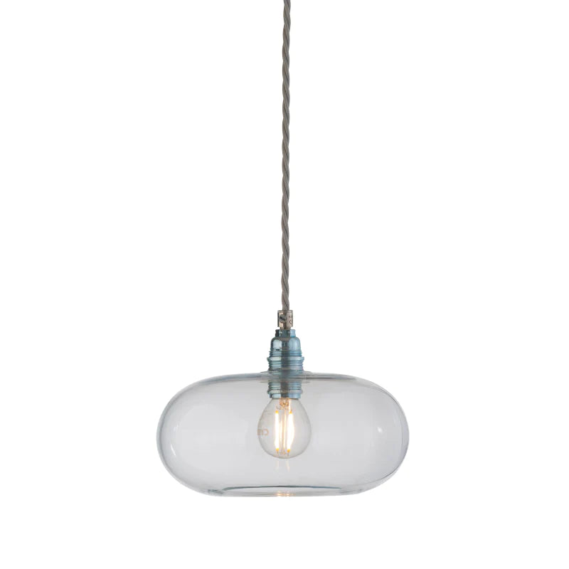 Blue pendant light with clear glass shade on a white background