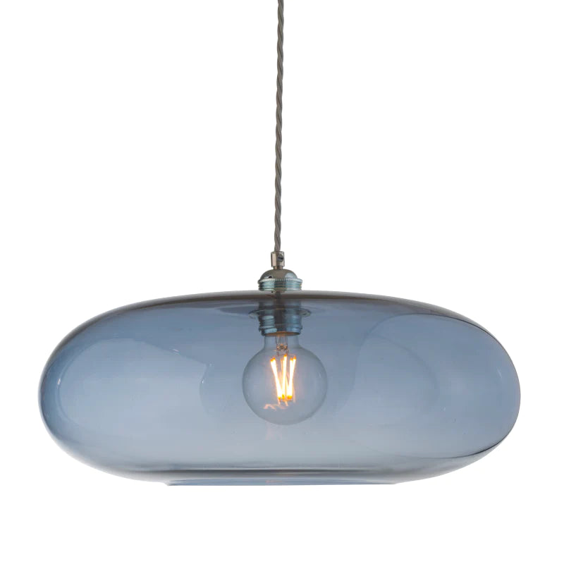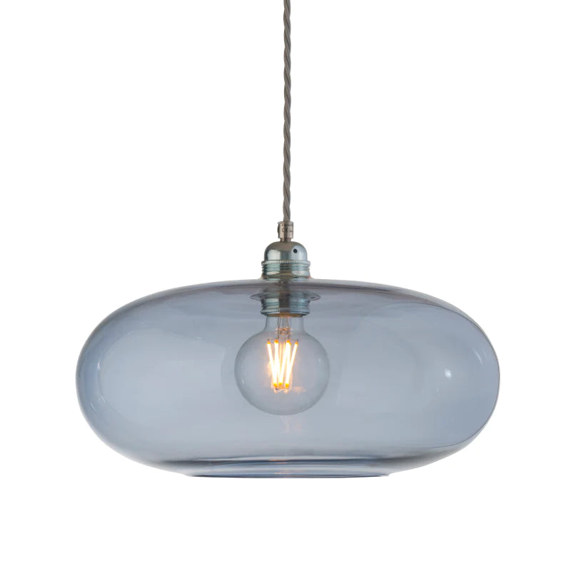 This pendant is an artisan piece that features a wide shape and a shallow height. It is designed and crafted by hand in Denmark, using mouth-blown glass techniques and silver detailing to create a retro aesthetic that adds a touch of sophistication to any interior. You can use it as a single installation to make a focal point in your home or install it as a cluster. It requires an E27 globe, which is not included. You can choose from a variety of sizes and glass colours to suit your interior space.