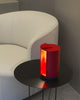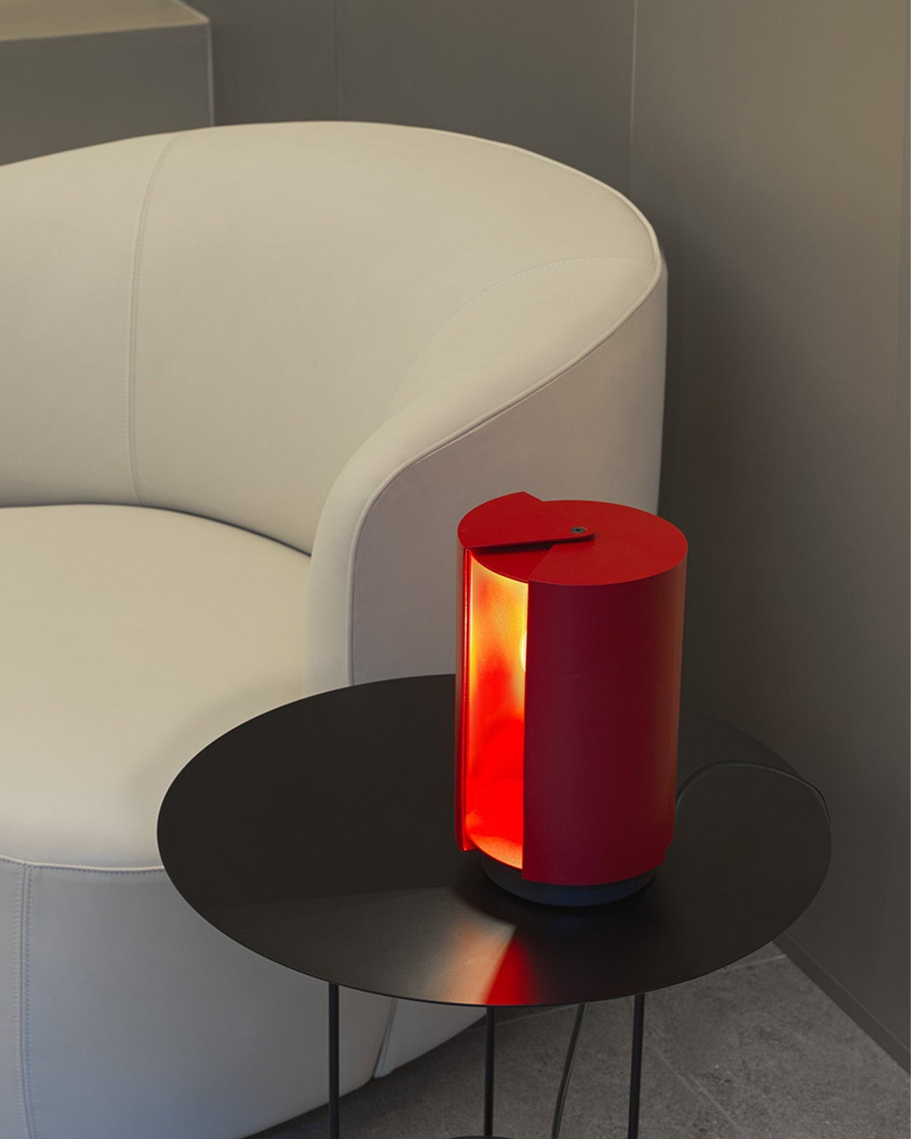 Mid-century Red cylindrical lamp on a black side table next to a white curved chair.