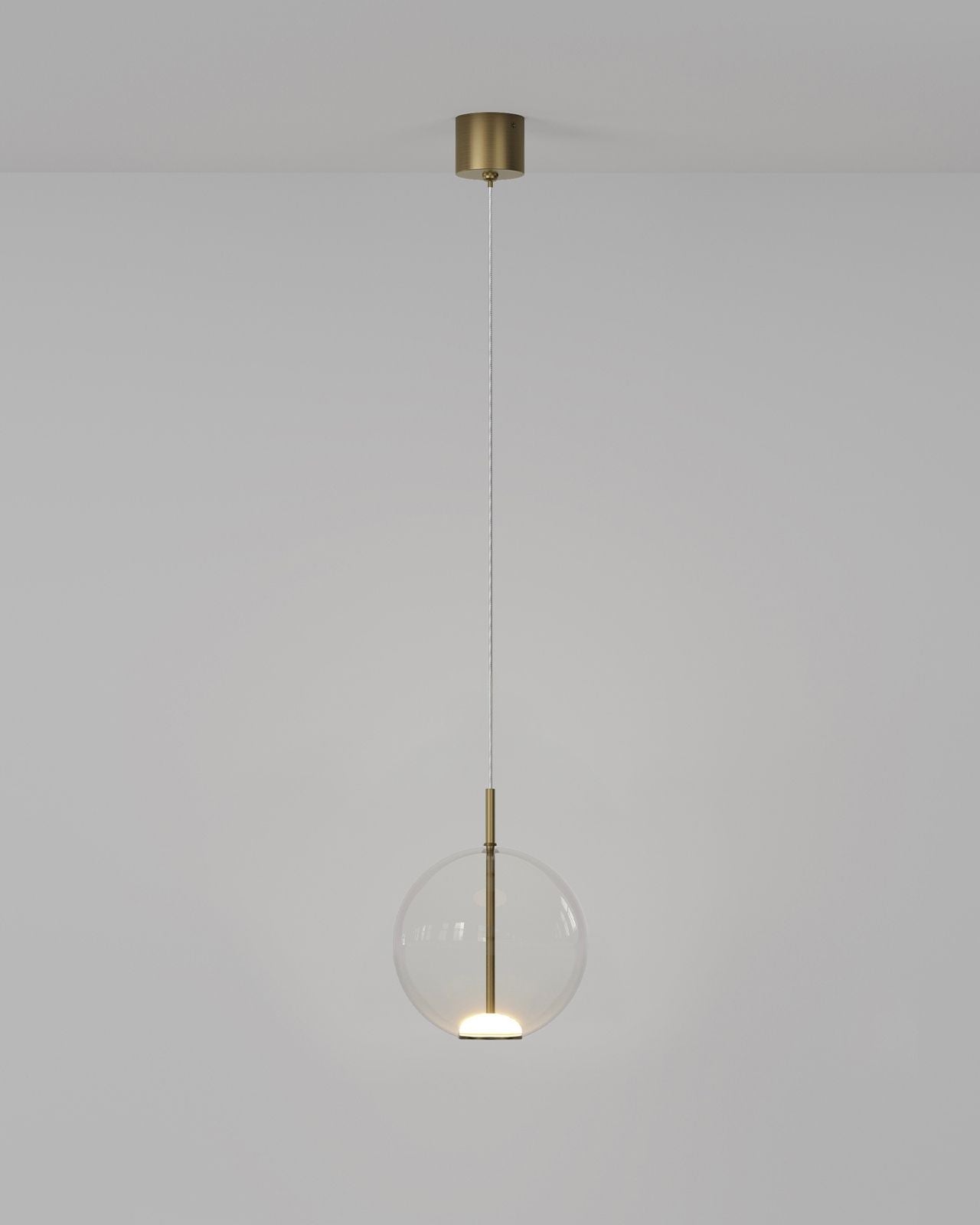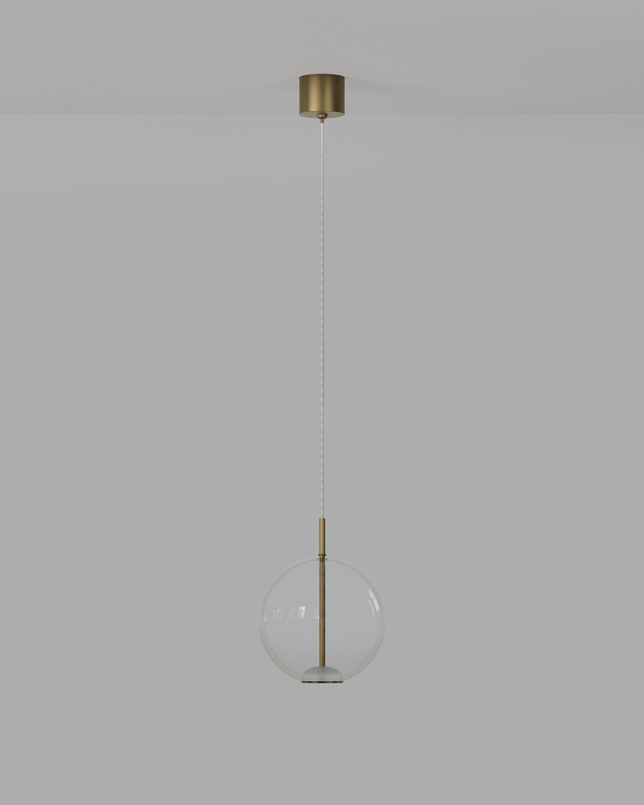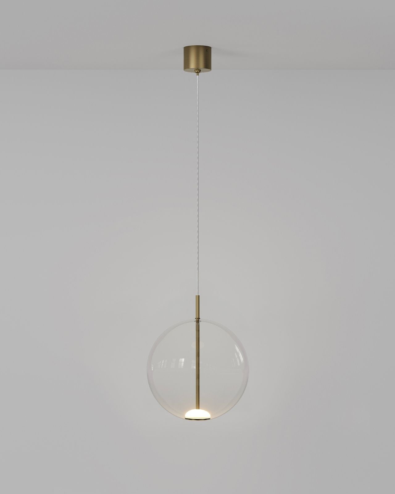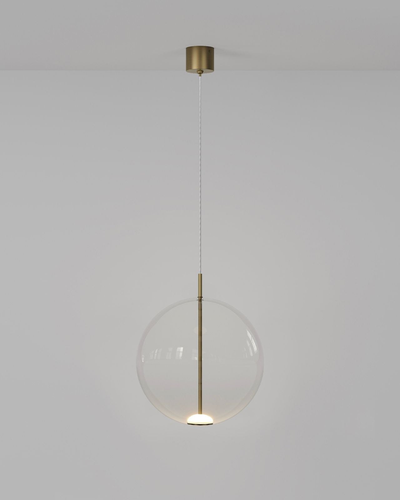 This Floating Orb Pendant is expertly crafted from borosilicate glass to create a sense of delicate weightlessness. Its elegant design features a brass rod intersecting the sphere, holding a radiant dimmable LED light. With a celestial ambience and a fusion of contemporary aesthetics and timeless elegance, this pendant is available in three sizes and two finishes, providing flexibility for individual suspensions or cluster arrangements.