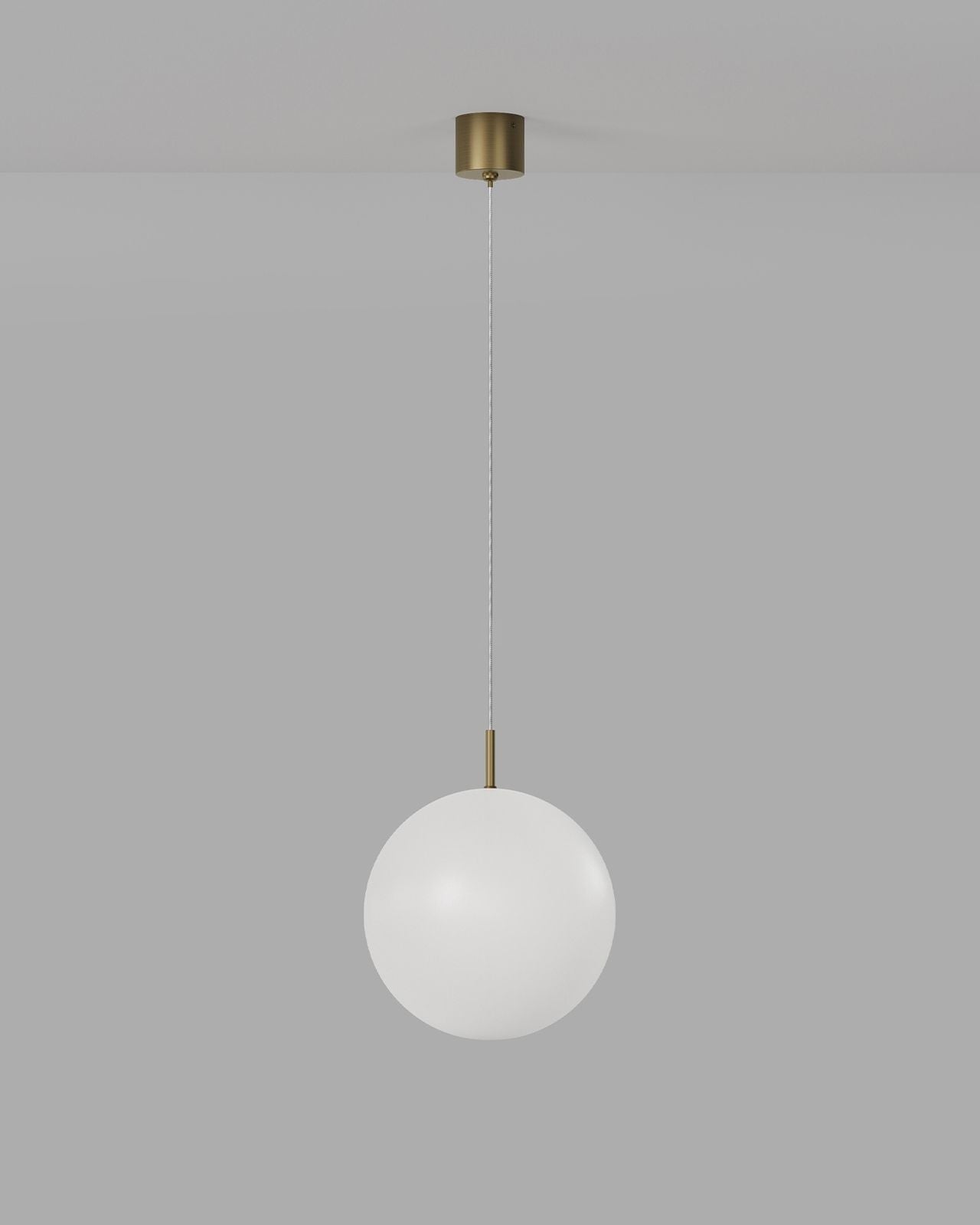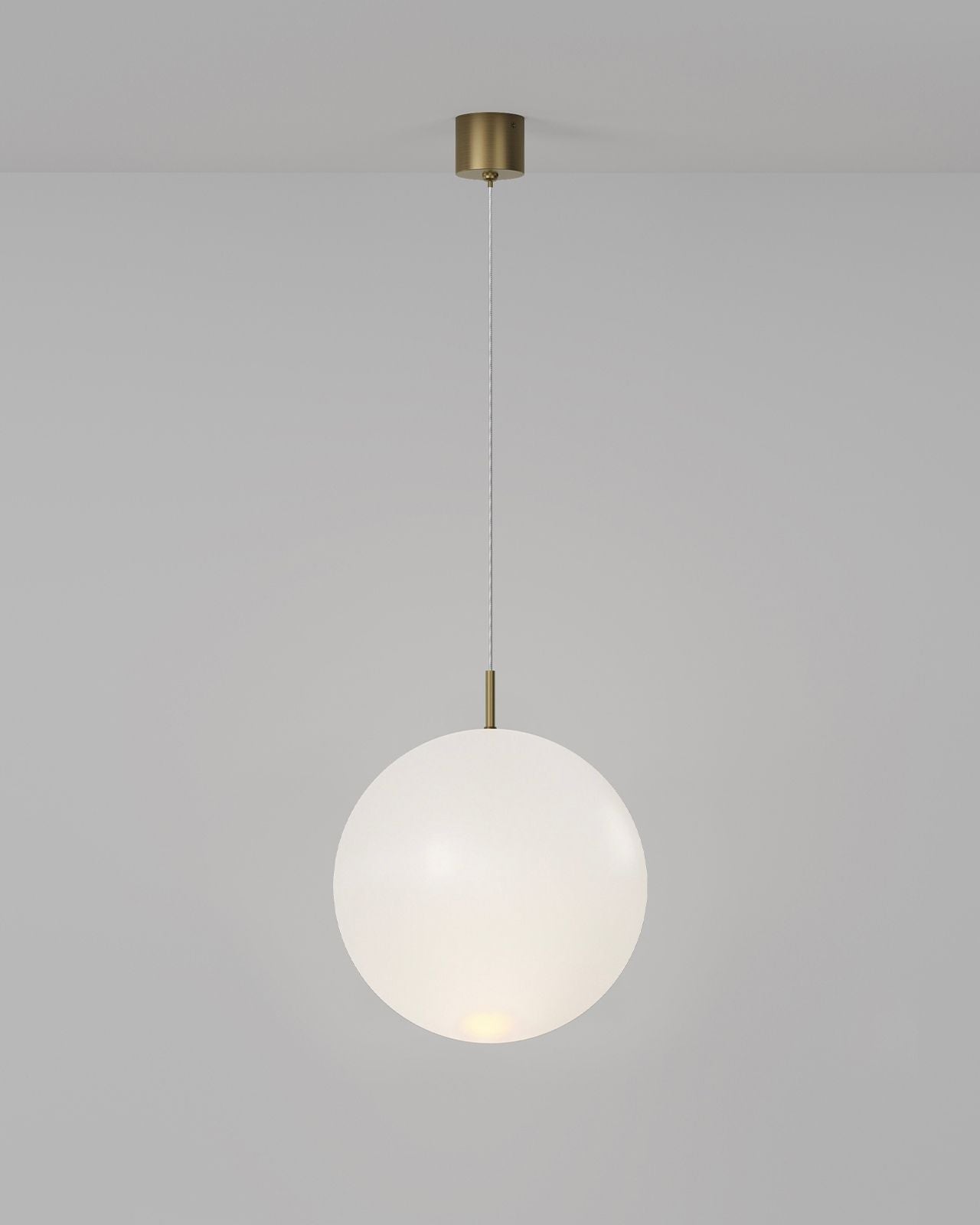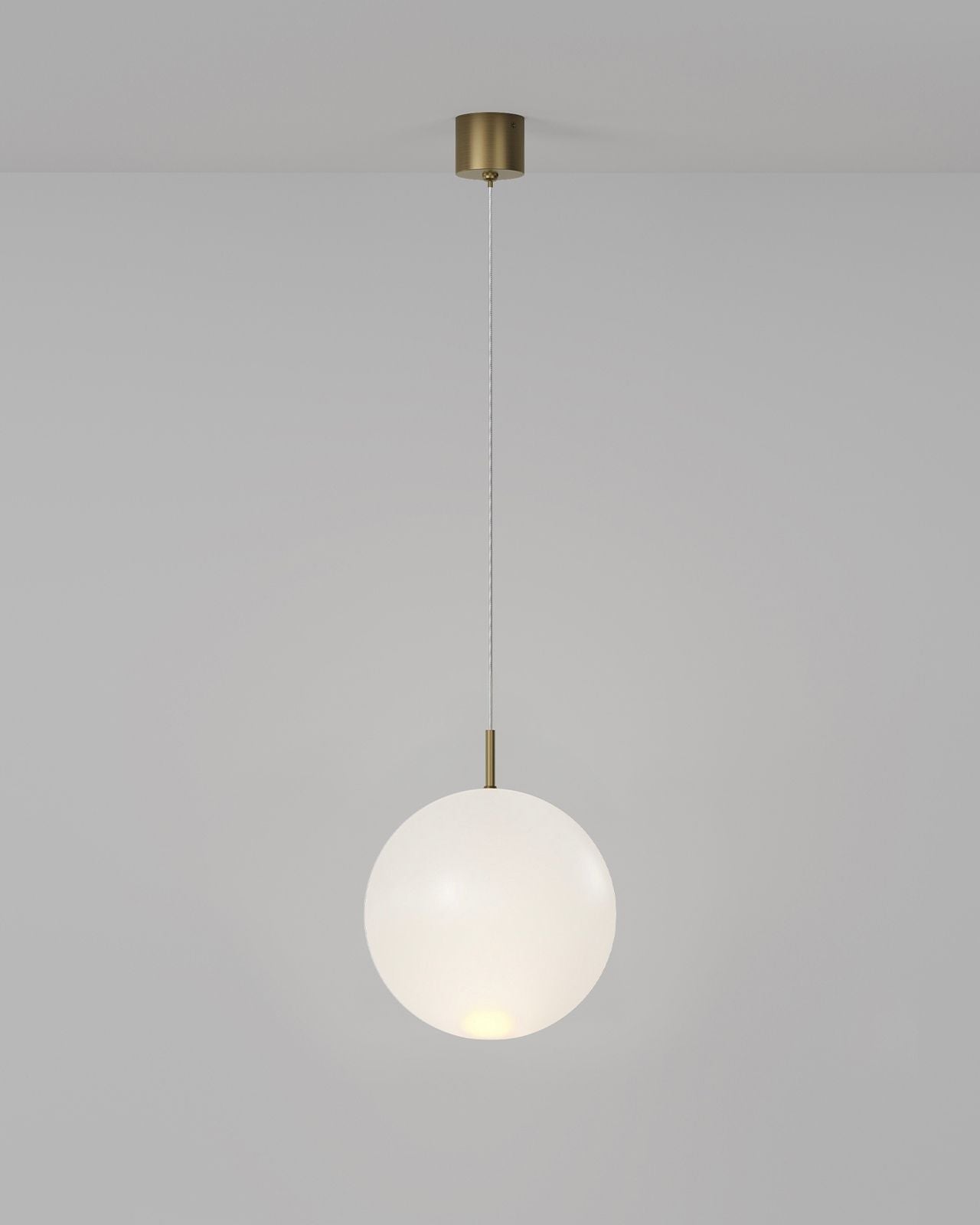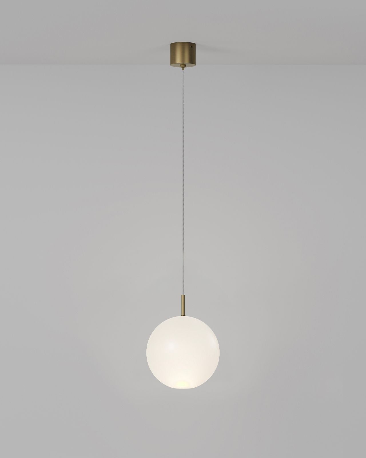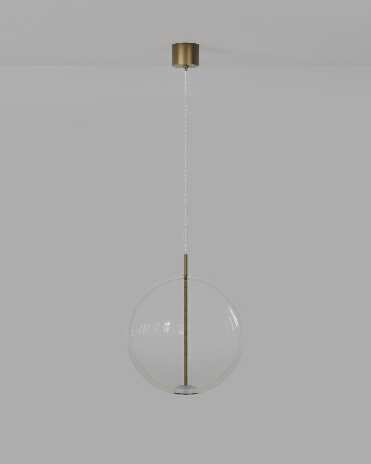 This Floating Orb Pendant is expertly crafted from borosilicate glass to create a sense of delicate weightlessness. Its elegant design features a brass rod intersecting the sphere, holding a radiant dimmable LED light. With a celestial ambience and a fusion of contemporary aesthetics and timeless elegance, this pendant is available in three sizes and two finishes, providing flexibility for individual suspensions or cluster arrangements.