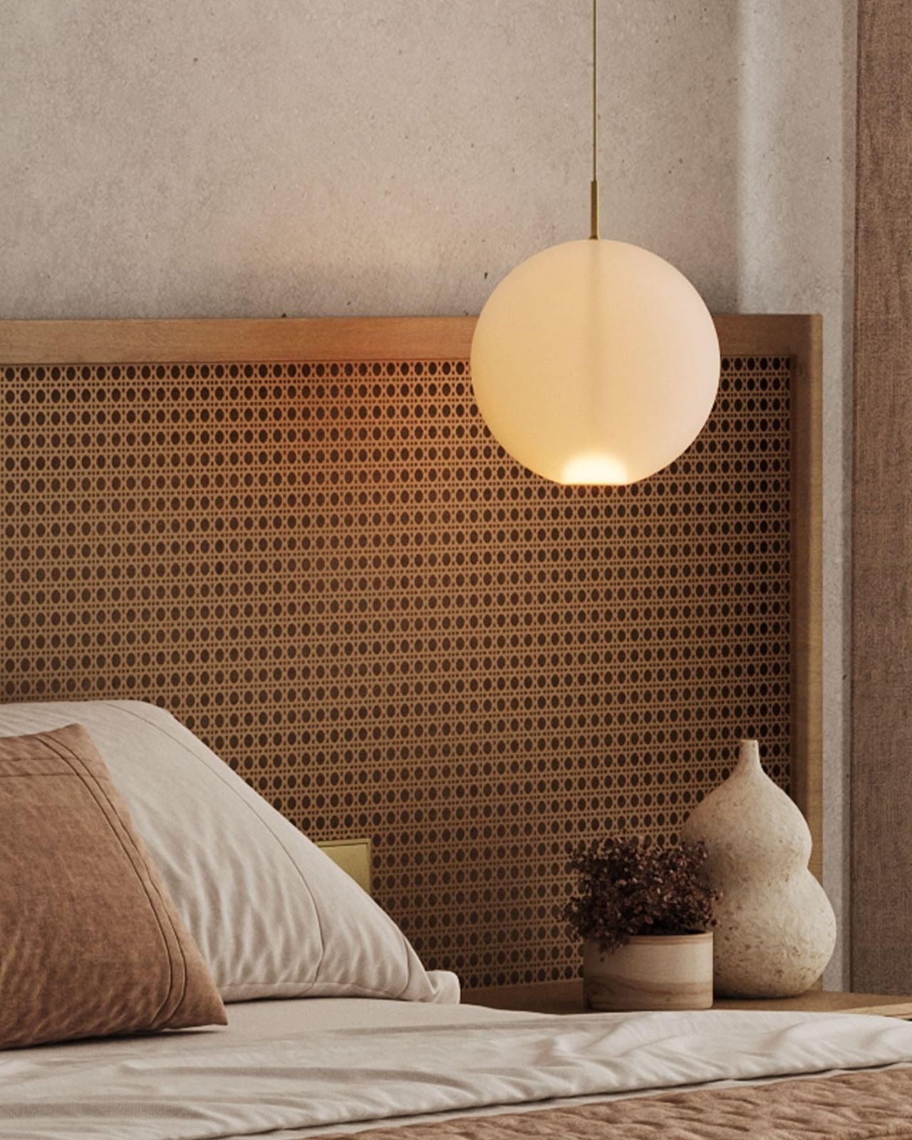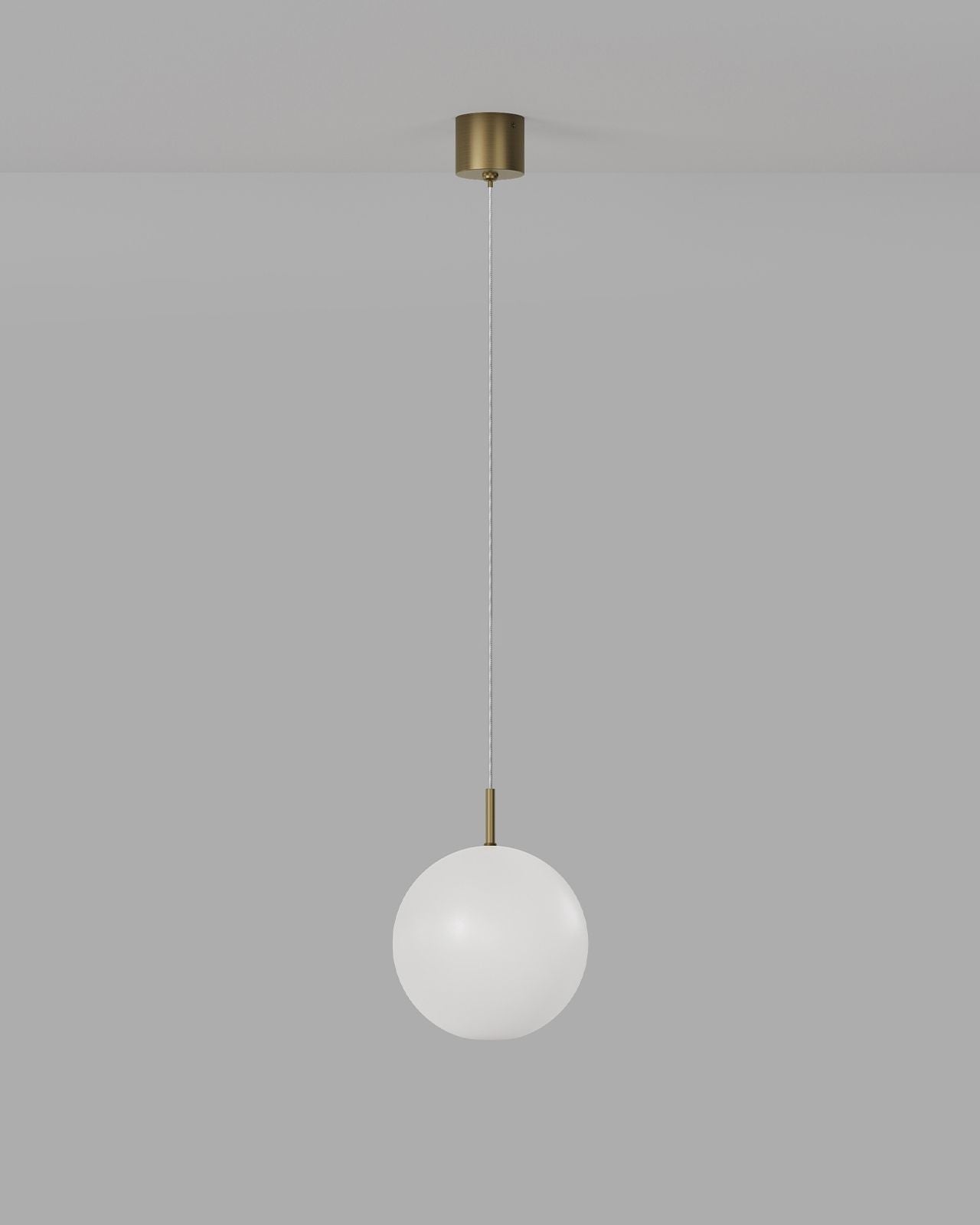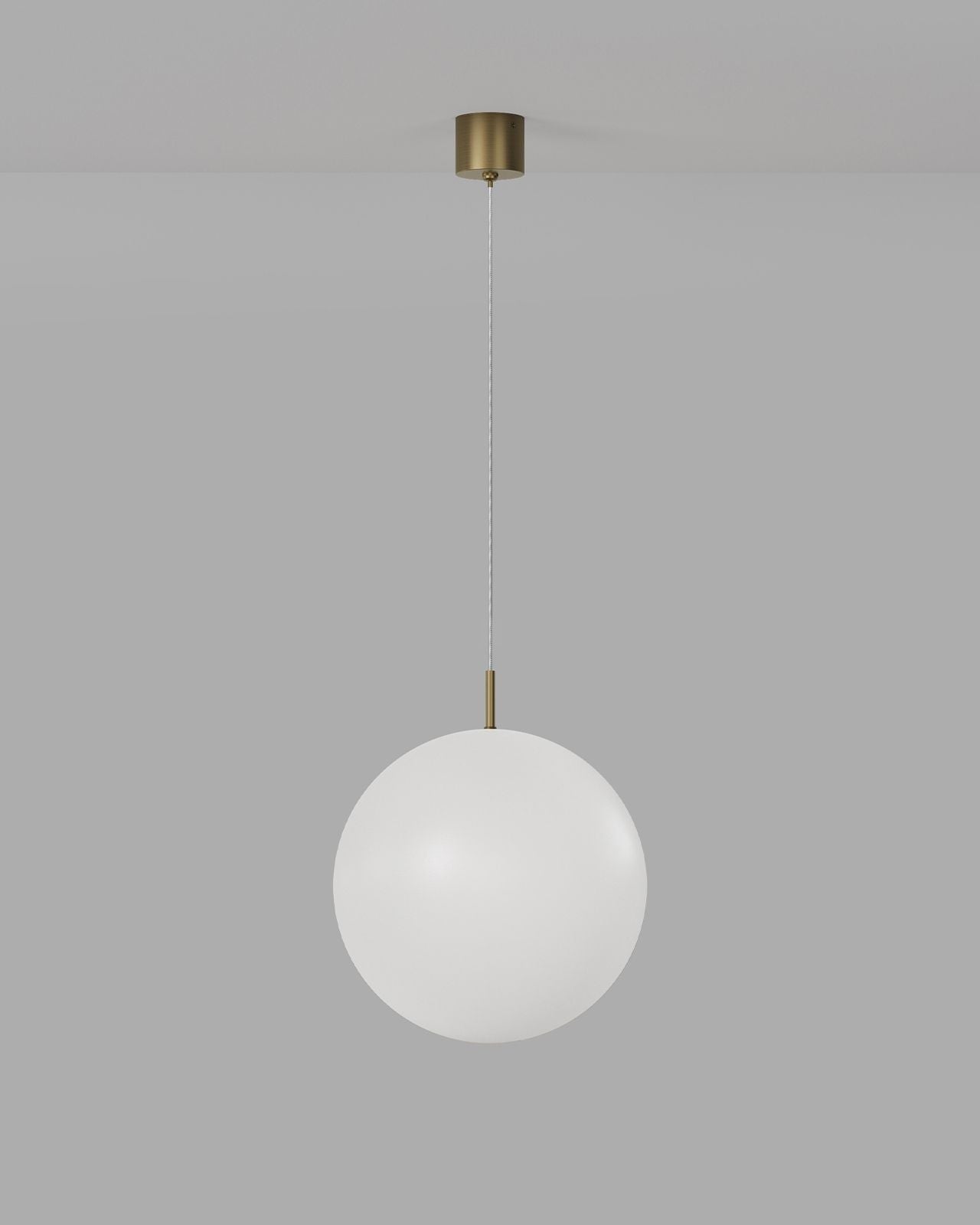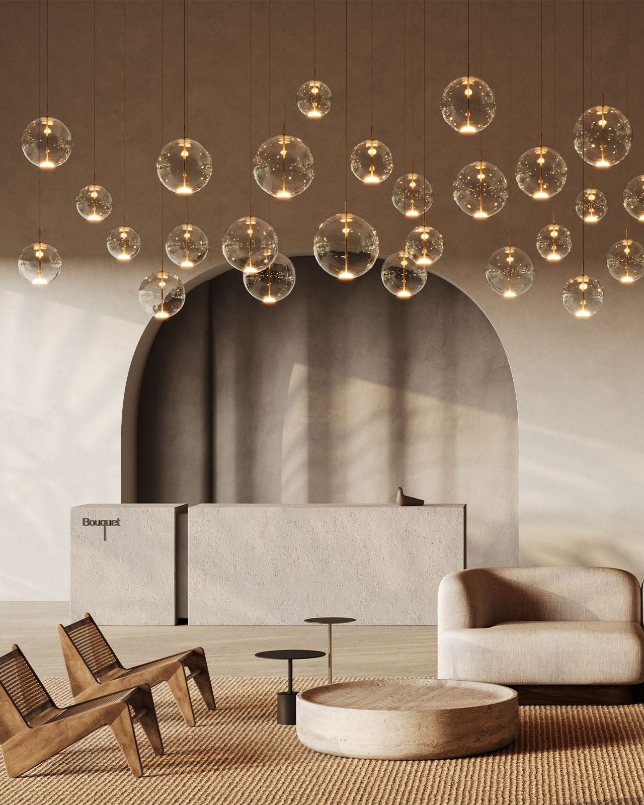 This Floating Orb Pendant is expertly crafted from borosilicate glass to create a sense of delicate weightlessness. Its elegant design features a brass rod intersecting the sphere, holding a radiant dimmable LED light. With a celestial ambience and a fusion of contemporary aesthetics and timeless elegance, this pendant is available in three sizes and two finishes, providing flexibility for individual suspensions or cluster arrangements.