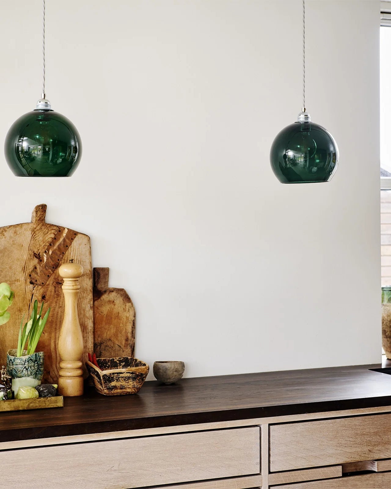 Modern kitchen with wooden cutting boards, green pendant lights, and a window.