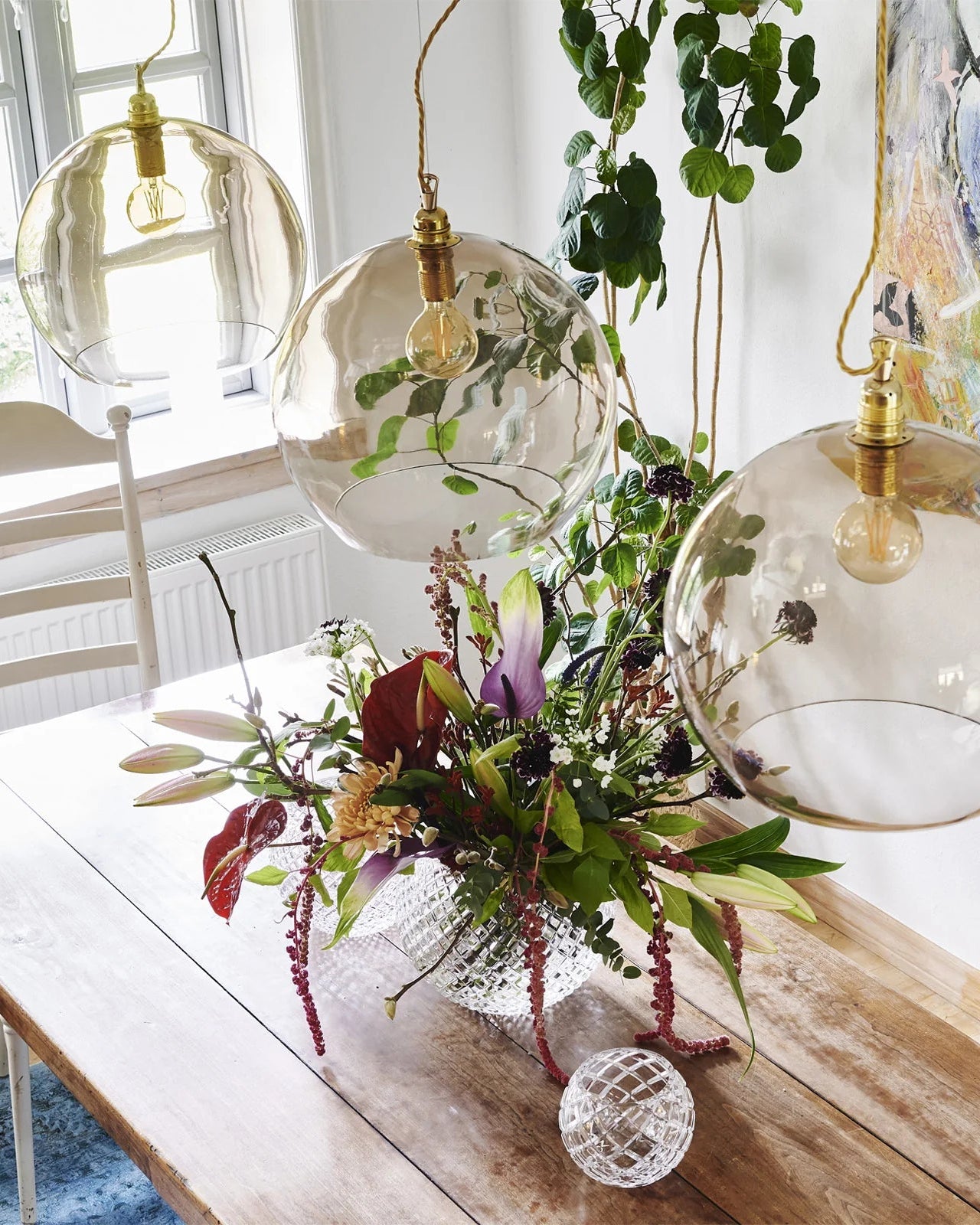 Decorative glass pendant lights hanging above a table with a floral arrangement.