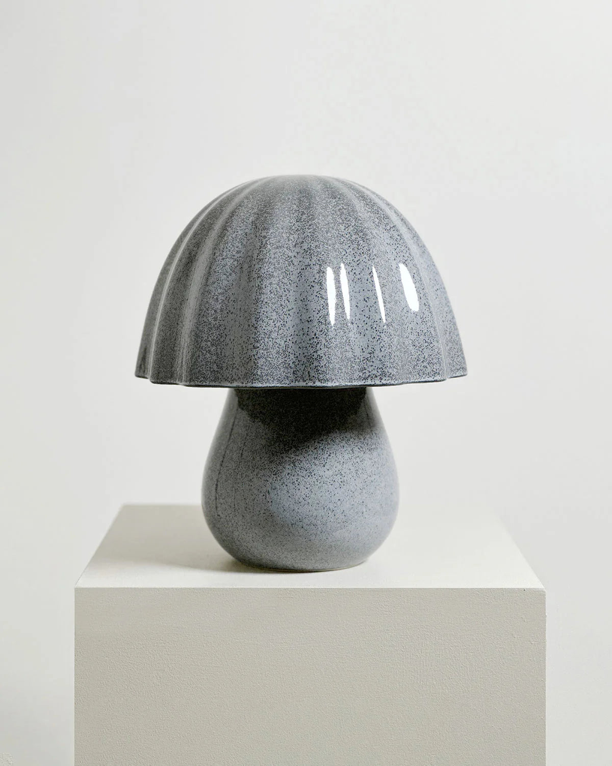 Mushroom-shaped ceramic lamp on a white pedestal against a light gray background