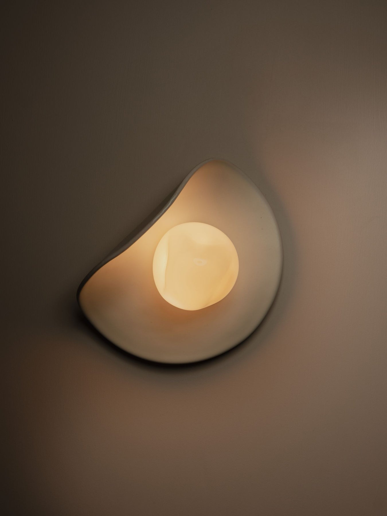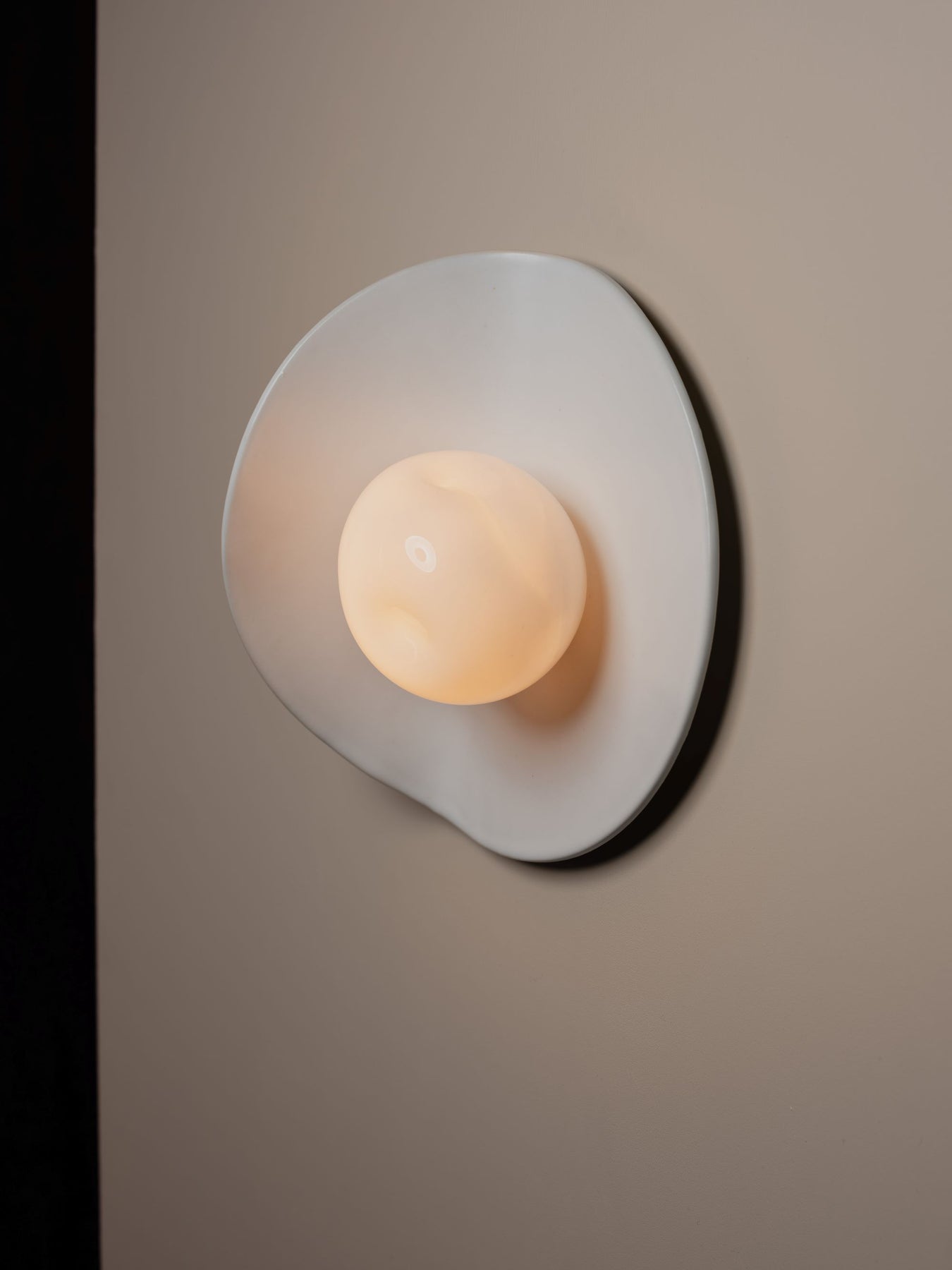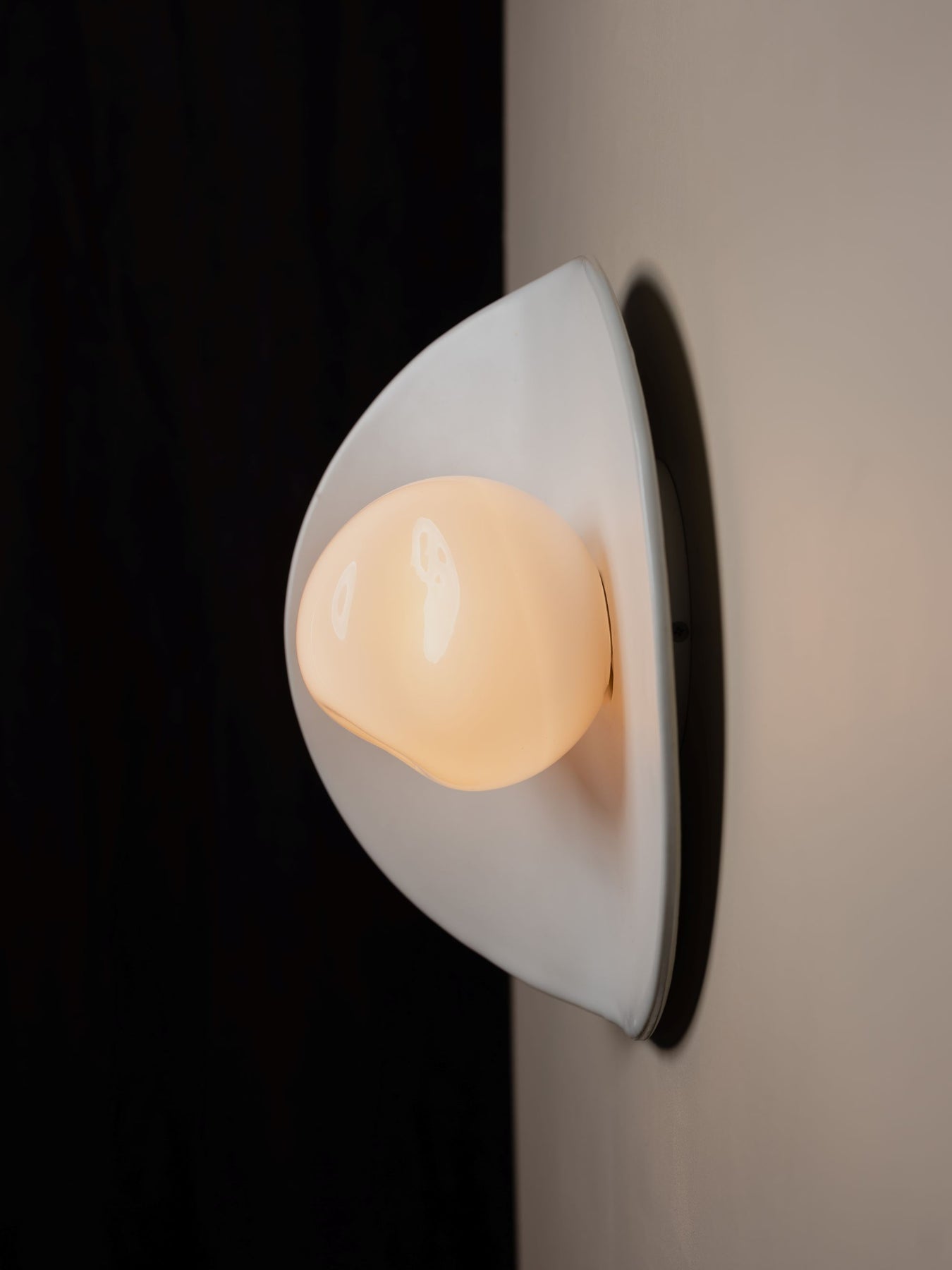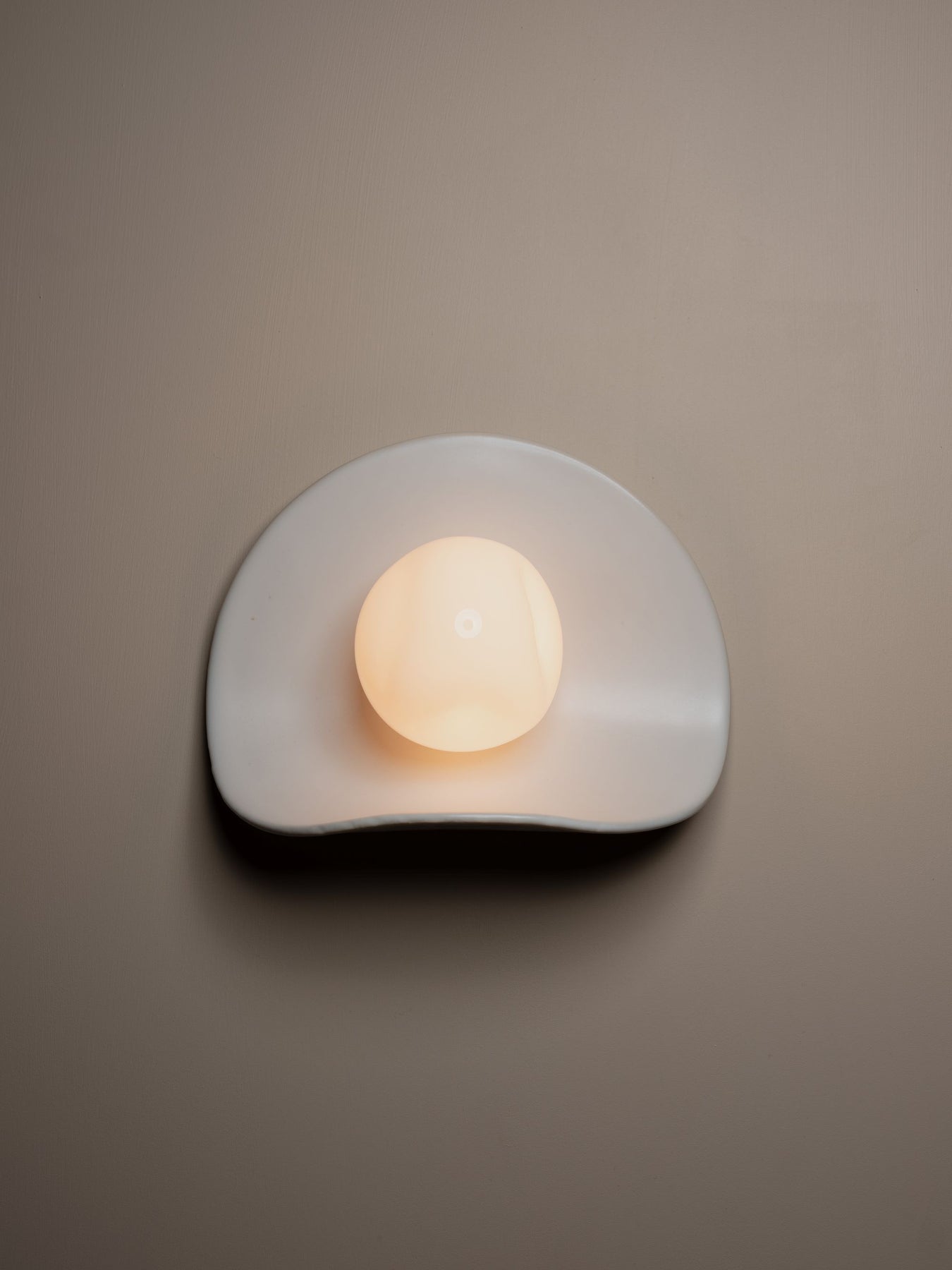 The Pond wall light showcases a single upturned edge, providing an asymmetrical design that allows for customizable angles. This unique feature results in the light being reflected in various locations along the wall. With a hand-blown bulb made to resemble pearls, each dome is intricately shaped. While the light is designed in Hobart, the ceramics are crafted in Cygnet, and the glass is blown in Poatina, ensuring this design represents the true craftsmanship of Tasmania. Both components are mounted on a custom white powder-coated backplate that is essentially hidden.