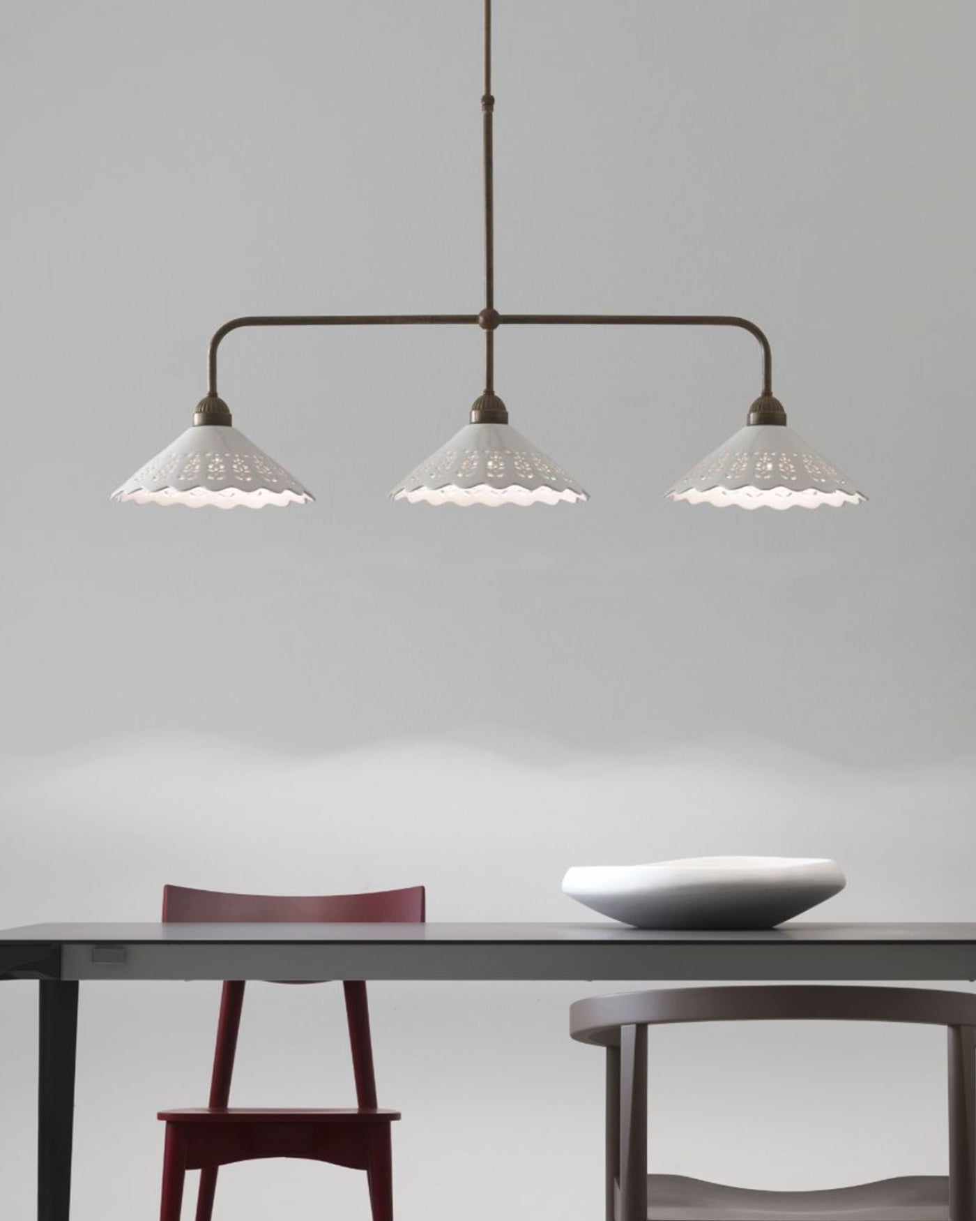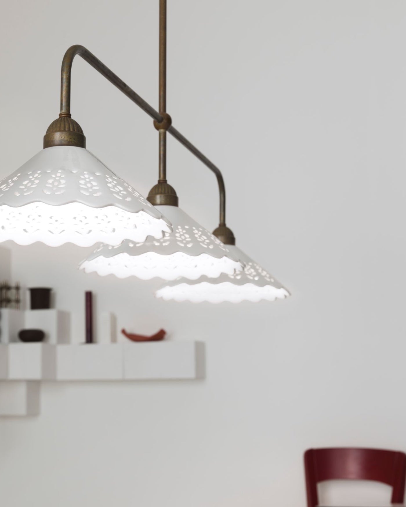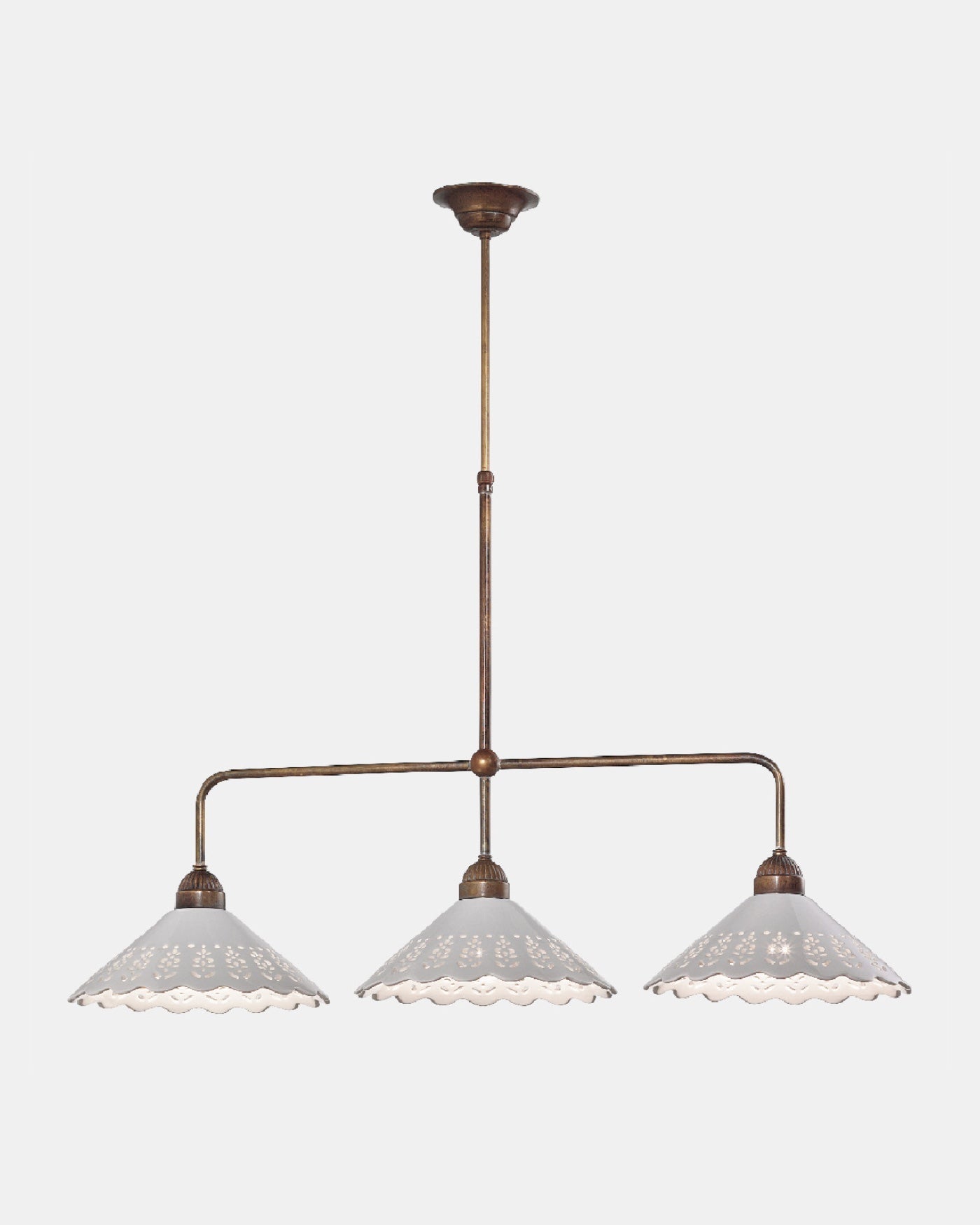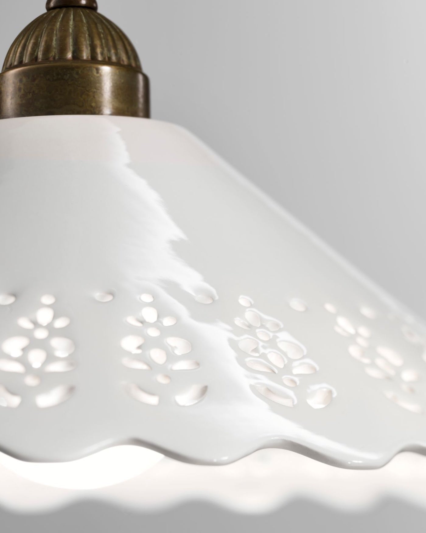 Part of a range of stunning Italian fittings, this pendant features shades of fretted Bassano ceramic, suspended on an antique brass frame. The perforated detail of the fretted ceramic is inspired by the delicate stitching of lace fabric, which produces unique floral patterns on surrounding surfaces.