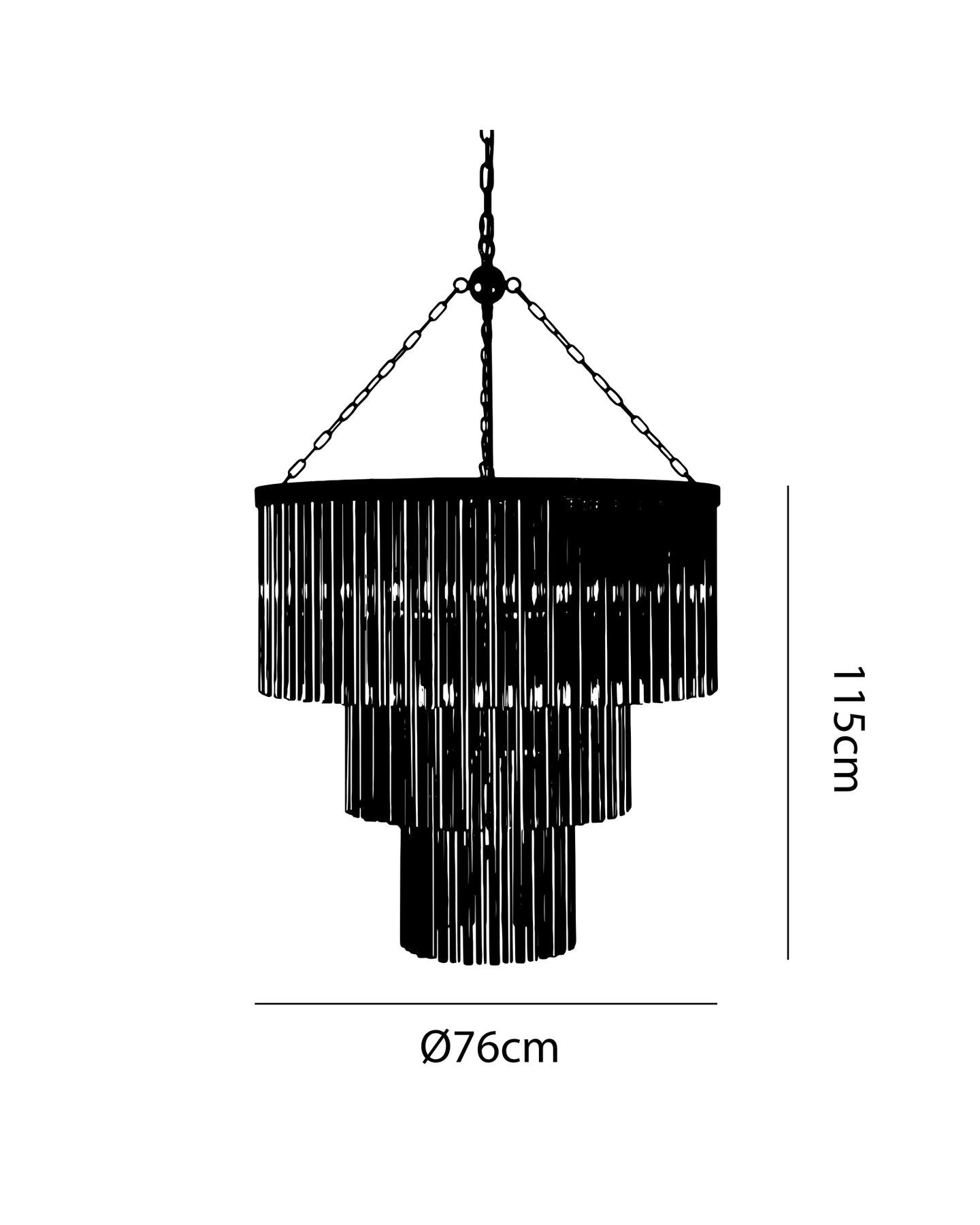 An elegant decorative chandelier reminiscent of Art Deco designs. Three tiers of metal and clear glass rods encircle the light source and act as a diffuser, creating a subtle ambient lighting effect. The size of the Art Deco Three-Tier Chandelier makes it ideal for feature lighting applications in large open spaces.