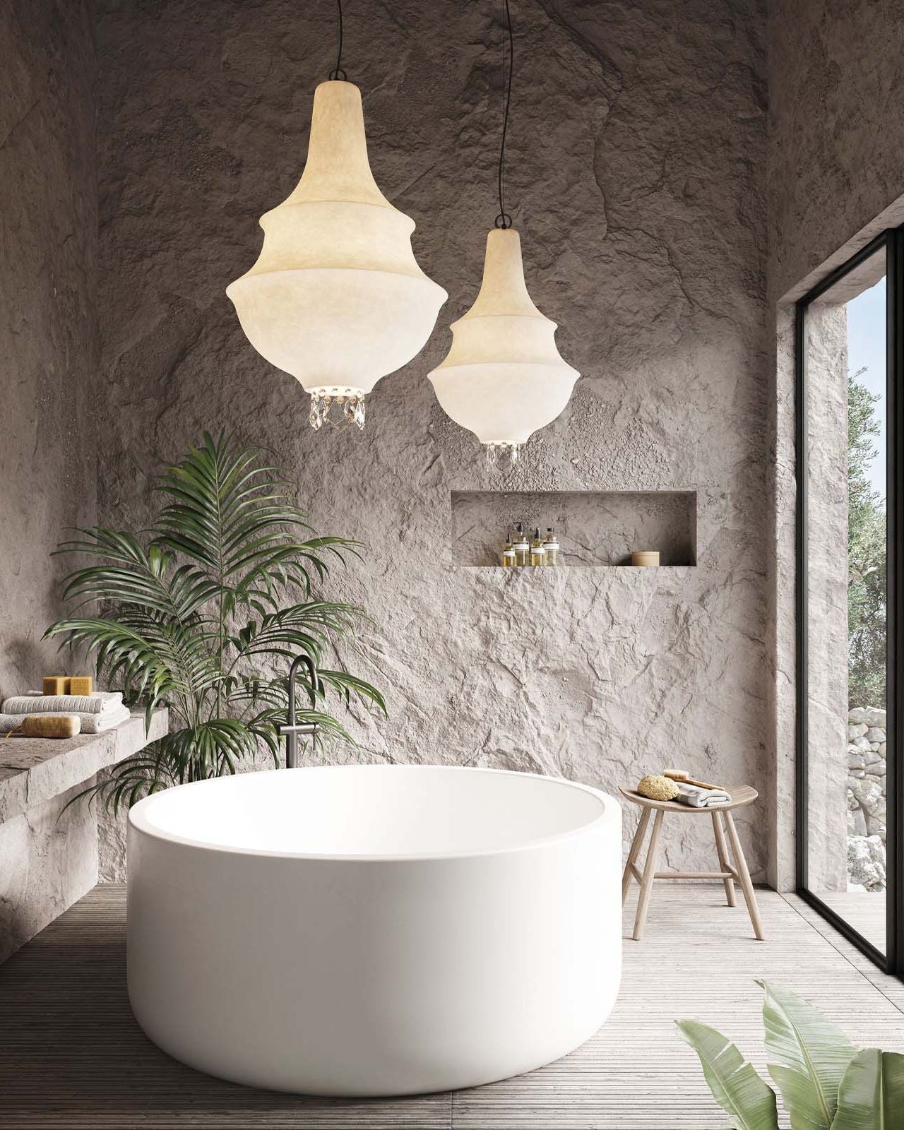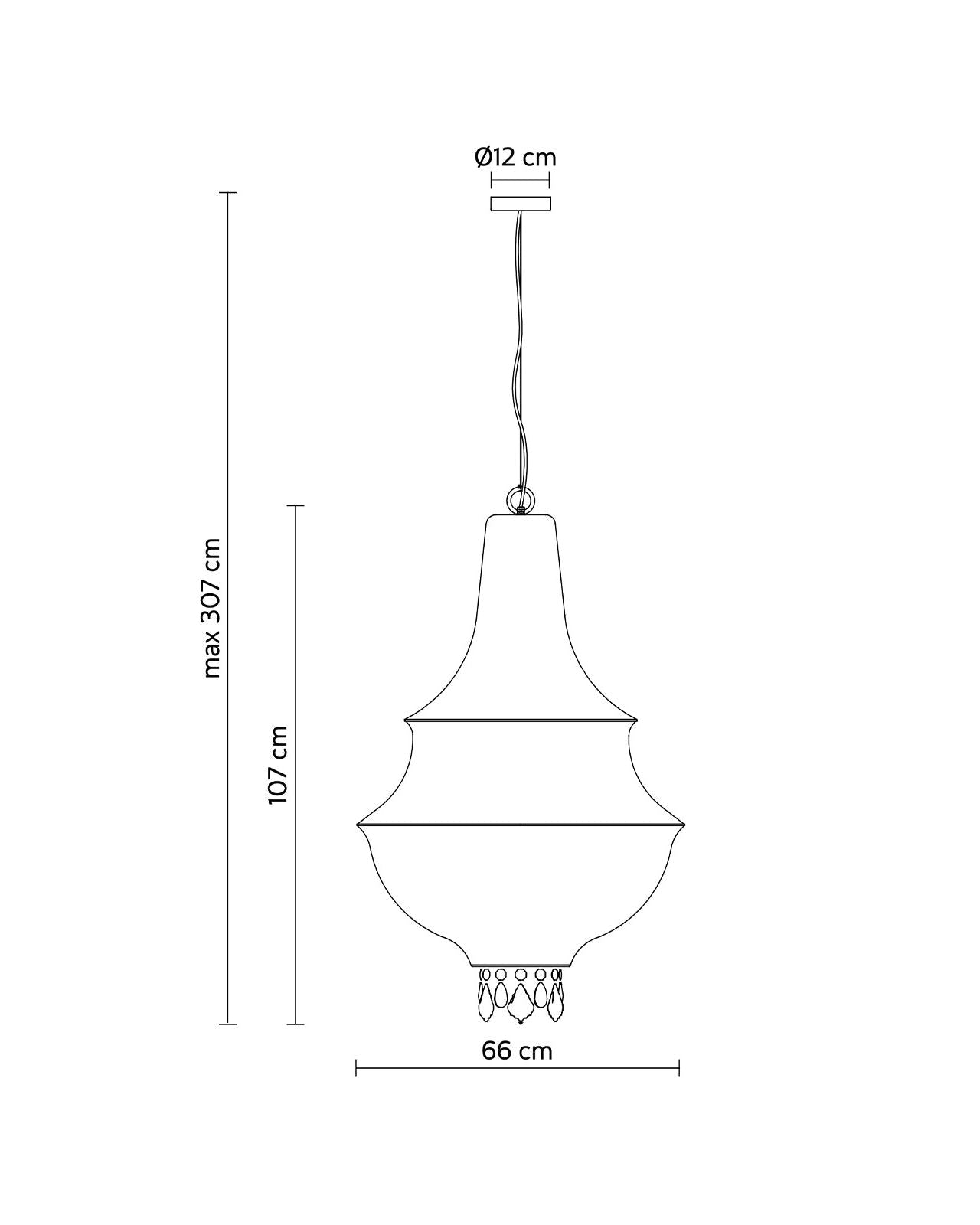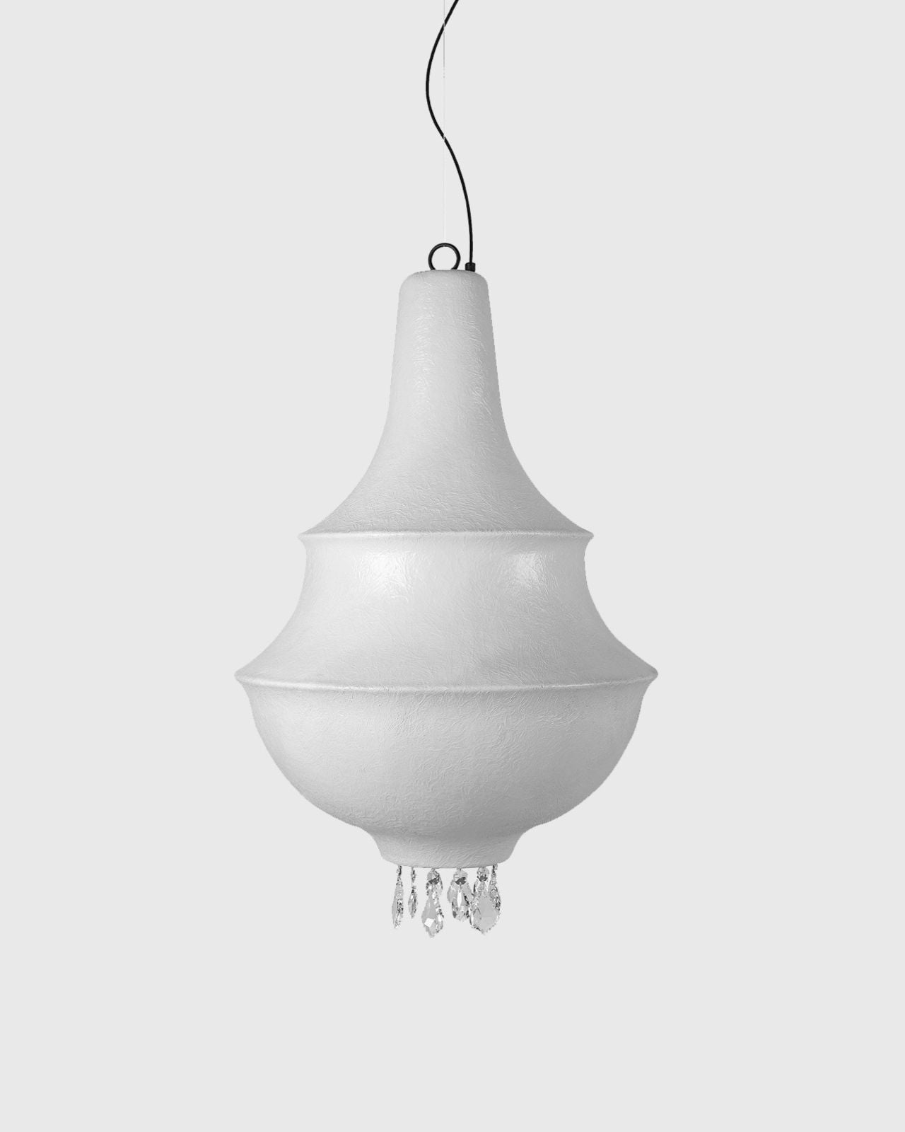 While maintaining the refined allure of a crystal chandelier, this fixture showcases a more minimalist aesthetic. Crafted from white fibreglass, this design emits warm and evenly distributed light. Offered in small and large sizes, the diffuser is adorned with crystal drops that accentuate the pendant's silhouette. Ideal for placement over a dining table or in an entrance hall to make a bold statement.