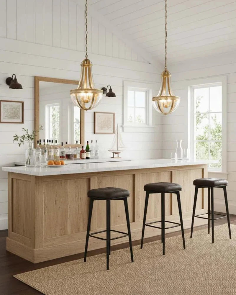 Modern kitchen with wooden bar, marble countertop, and two brass Grand Hamptons Drop Chandeliers
