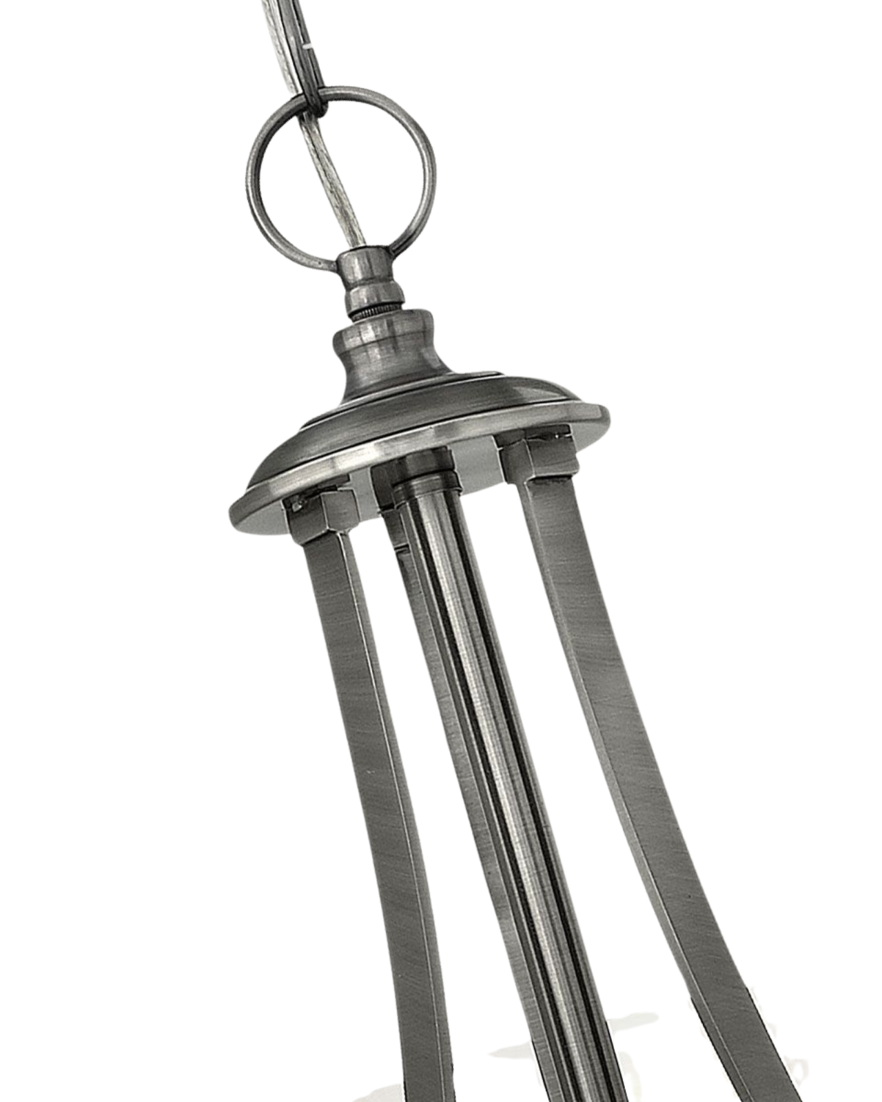 The Hamptons Antique Nickel & Opal Glass Shade is a transitional elegant light with an authentic look. It features boldly sloped arms that uniquely contrast with its elegant cast finials. The Antique Nickel finish highlights the beautiful etched opal glass shades.