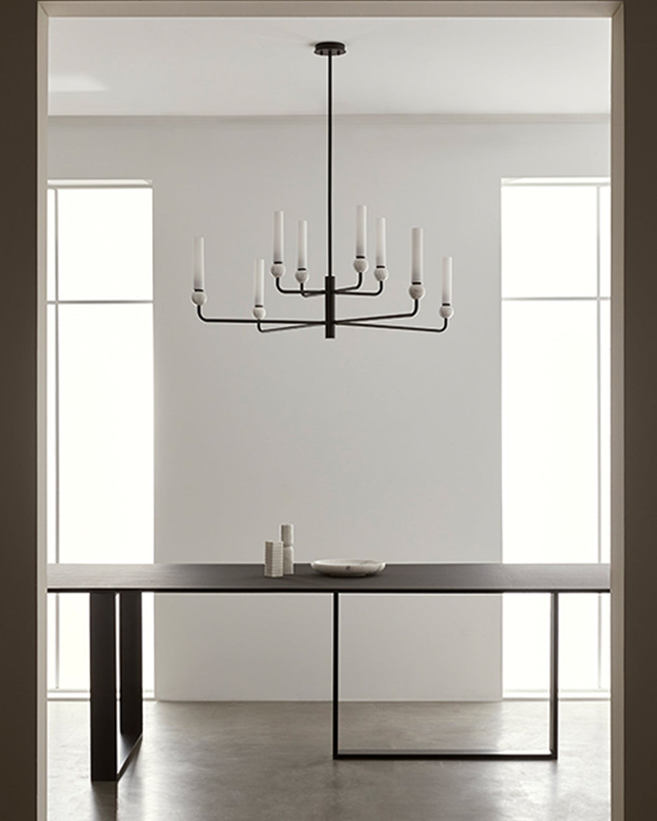 Modern black chandelier hanging above a dining table in a minimalistic room.