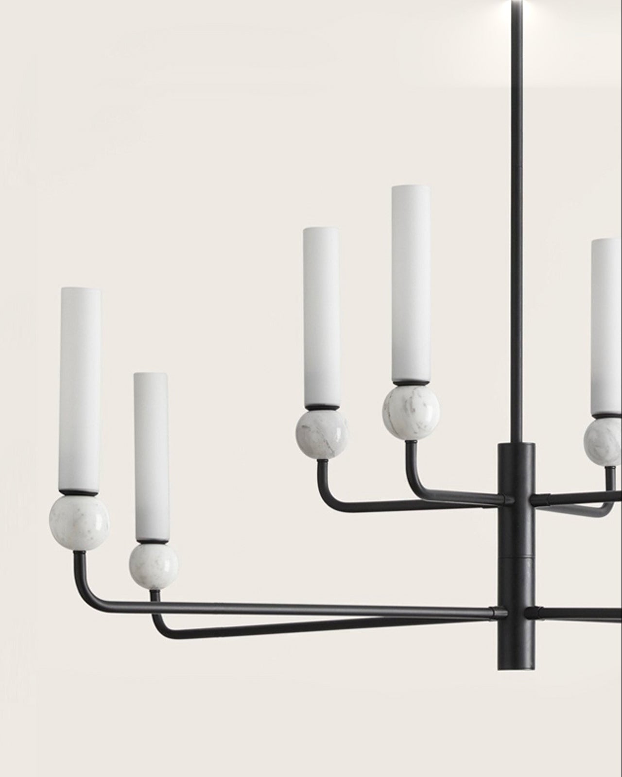 This stunning minimalist design combines steel, marble, and blown glass to create this eight-armed chandelier. Provided with eight G9 LED's housed within the pendants blown glass tubular shades this fitting provides warm (3000K) indirect illumination. Used as a void filler in a large space or over a dining room table this pendant will bring a feeling of luxury and charm to any interior. Available in Aged Gold and Black Marble or Matte Black and White Marble.